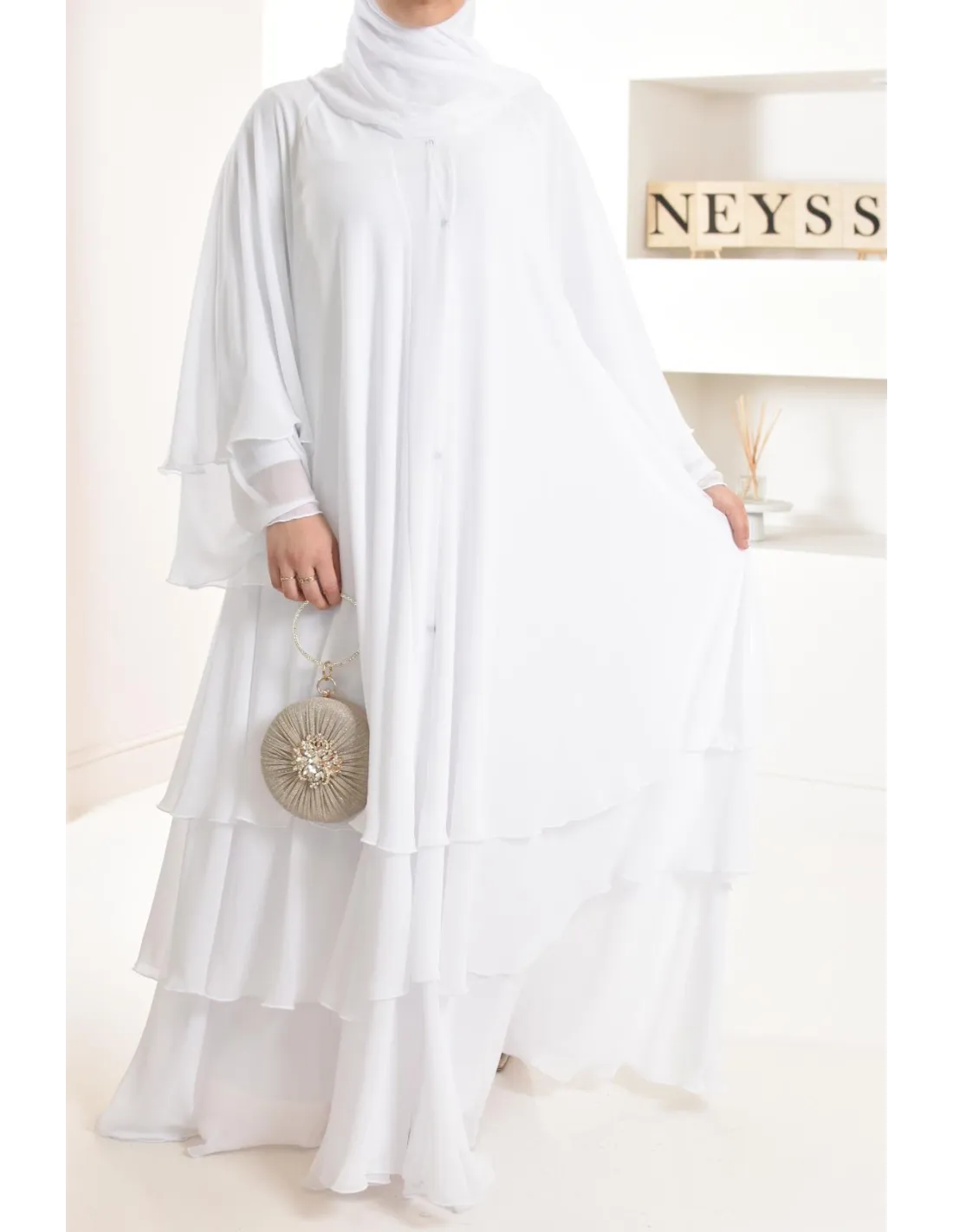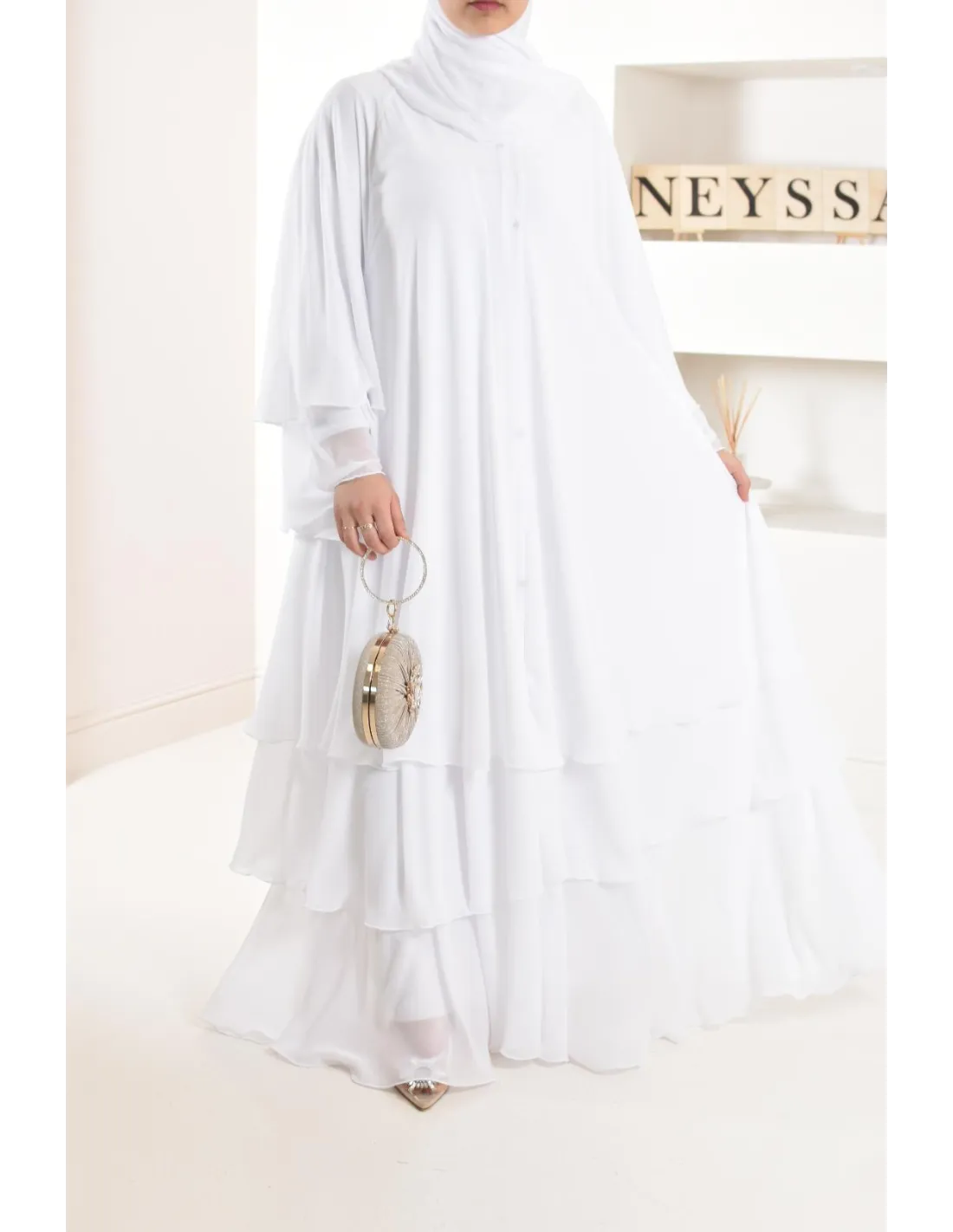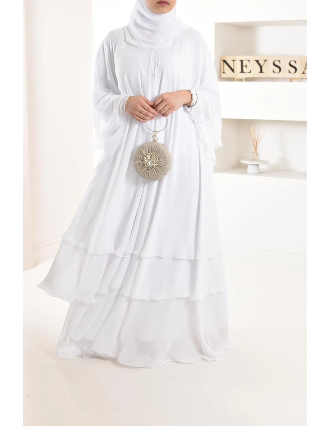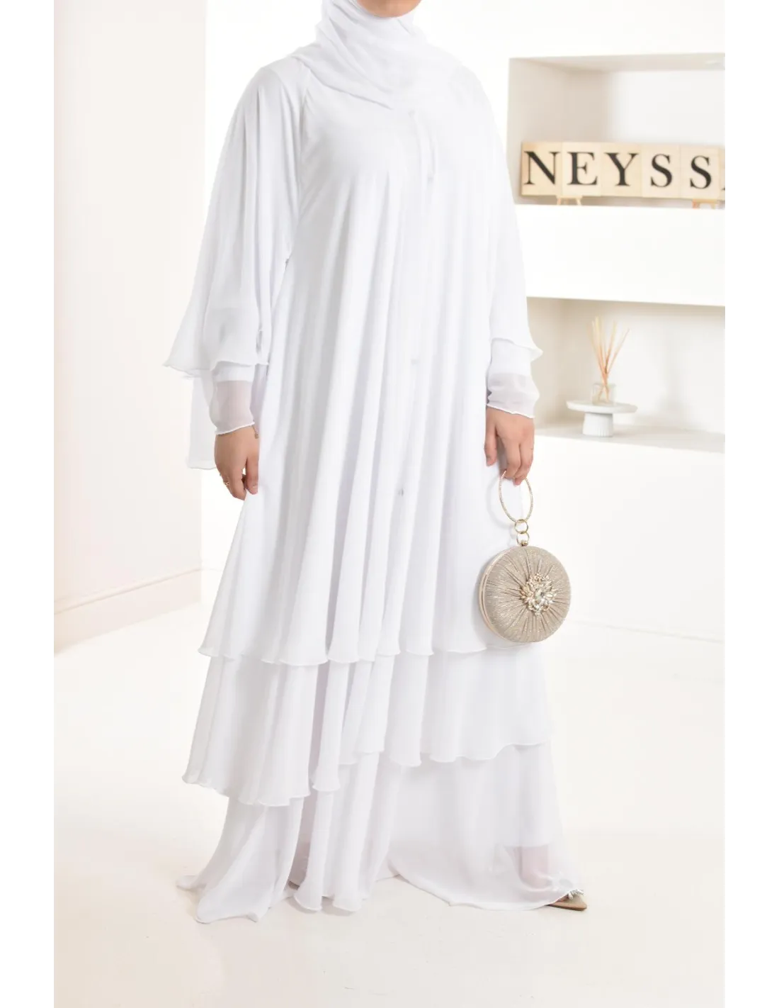 Diese lange Abaya ist perfekt für eine junge Braut, ihre elfenbeinfarbene Farbe und ihre Rüschen machen den ganzen Charme des Outfits aus und bringen einen Hauch von Ausstrahlung, der Ihren Teint erfreuen wird.