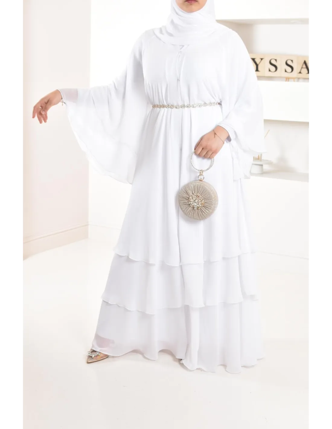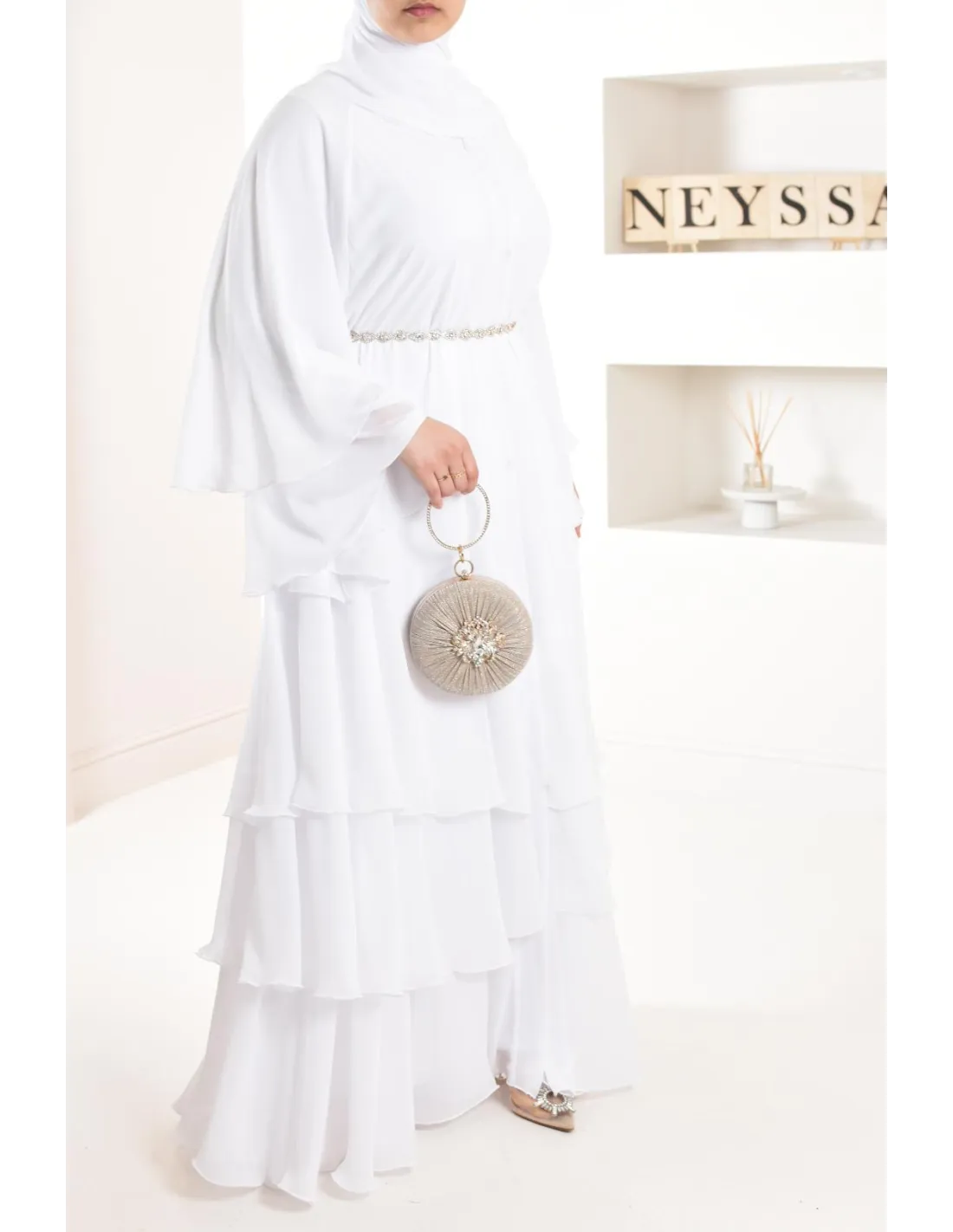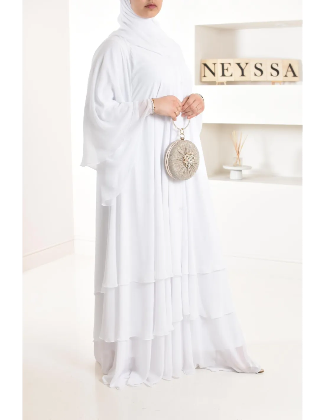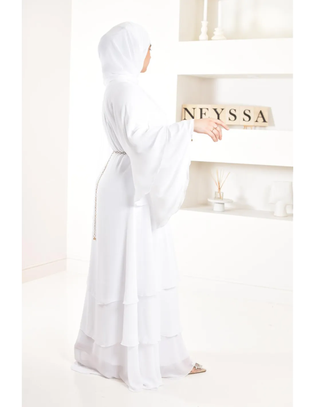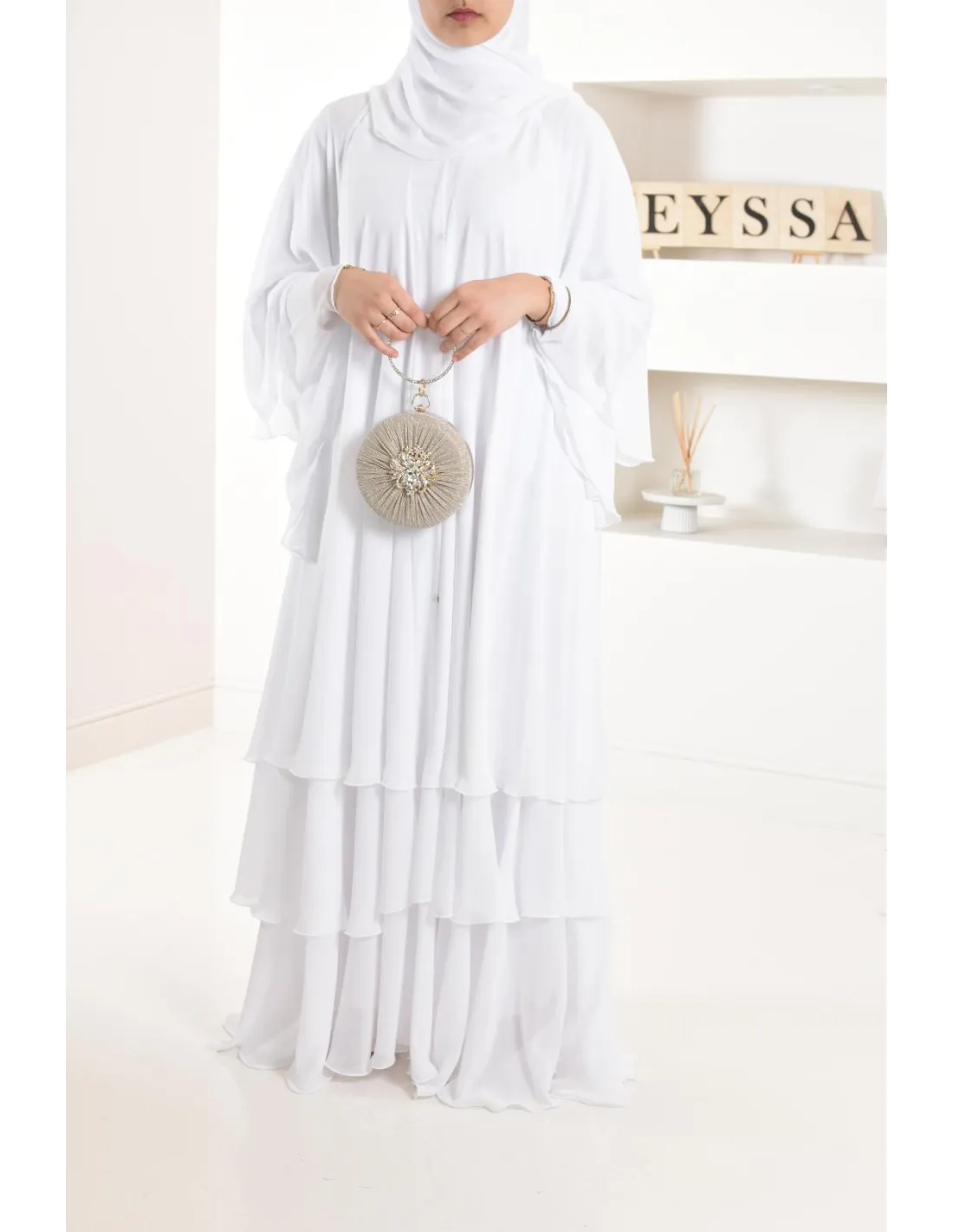 Diese lange Abaya ist perfekt für eine junge Braut, ihre elfenbeinfarbene Farbe und ihre Rüschen machen den ganzen Charme des Outfits aus und bringen einen Hauch von Ausstrahlung, der Ihren Teint erfreuen wird.