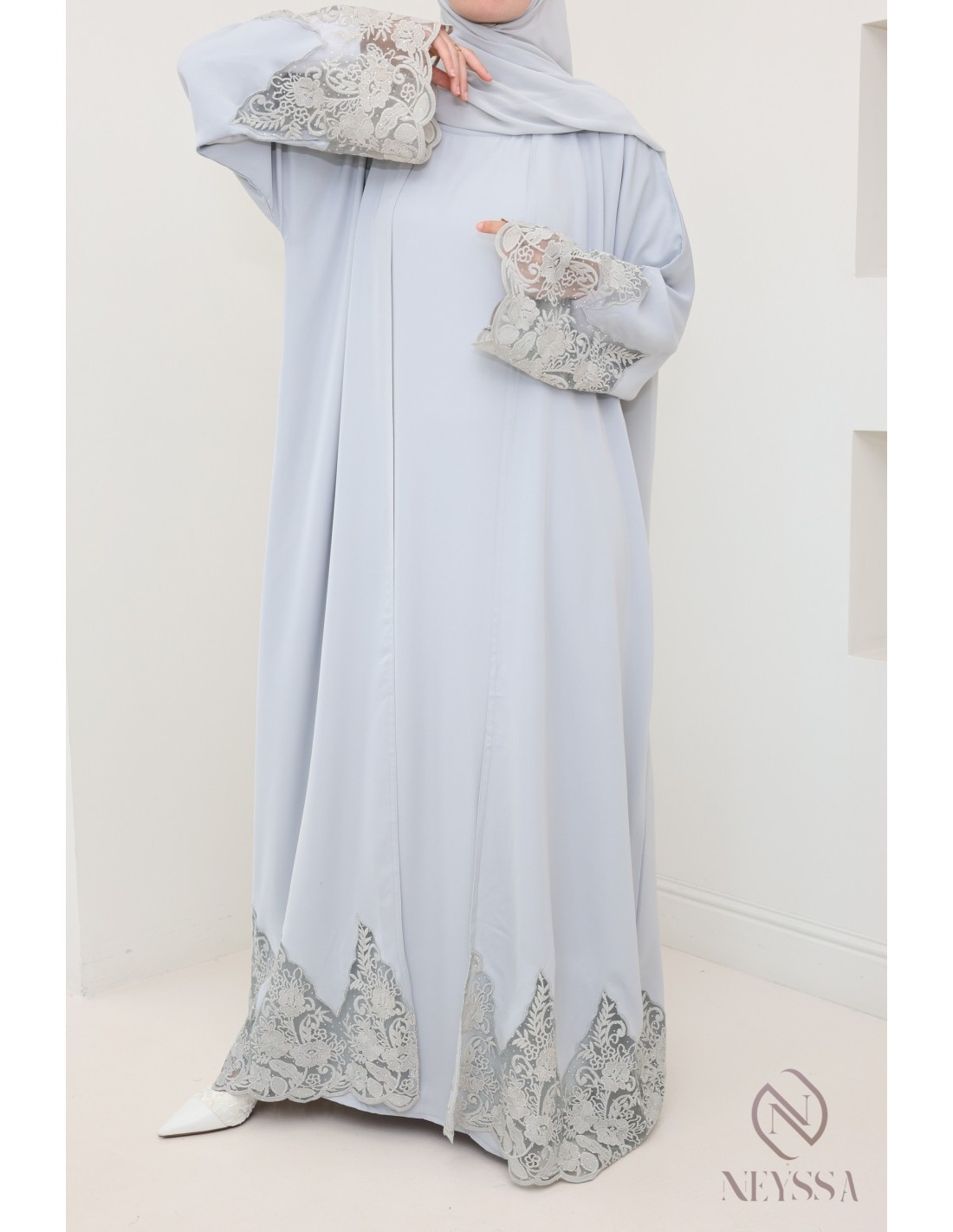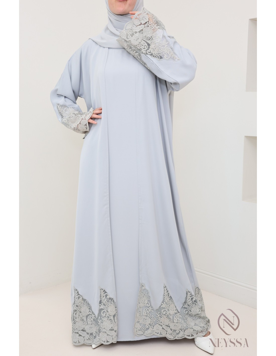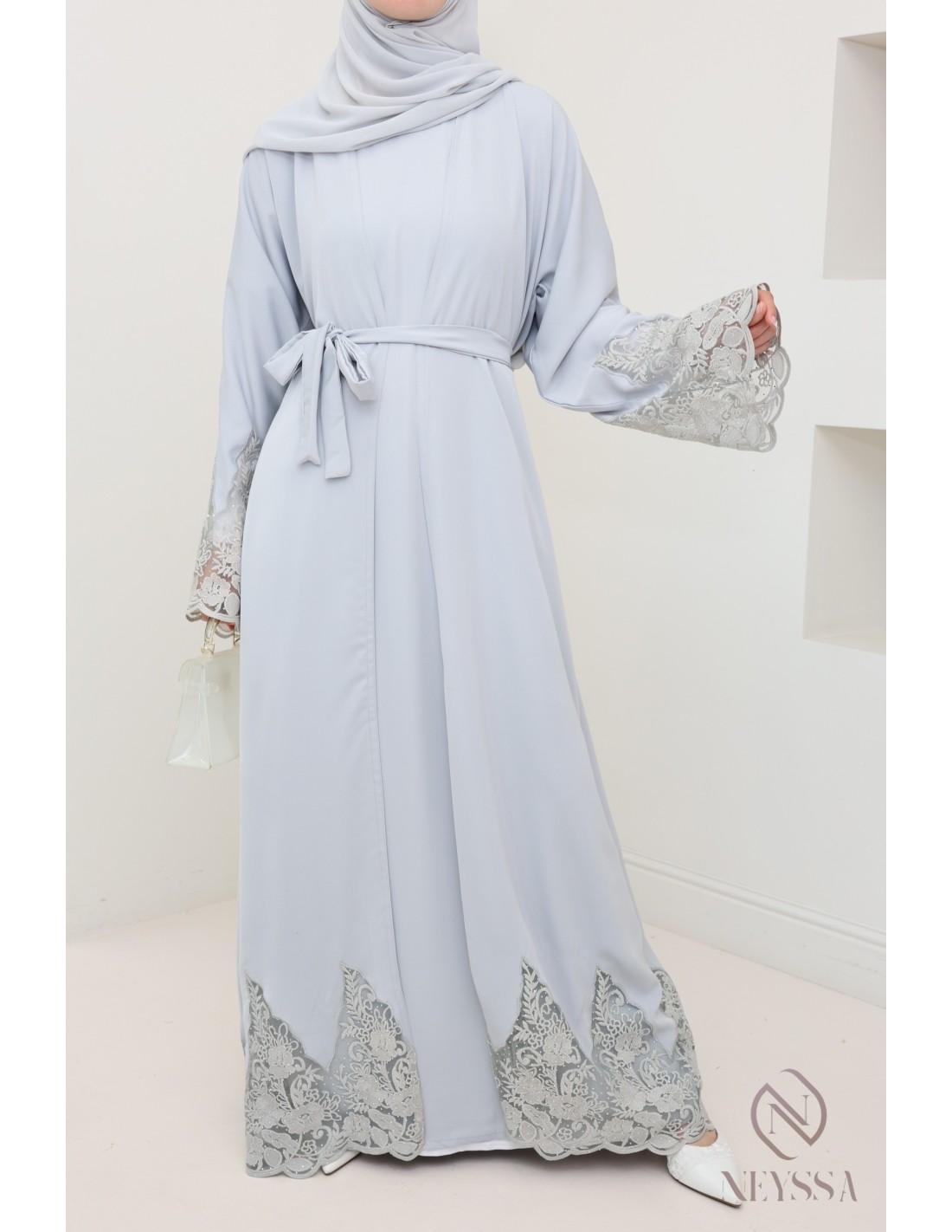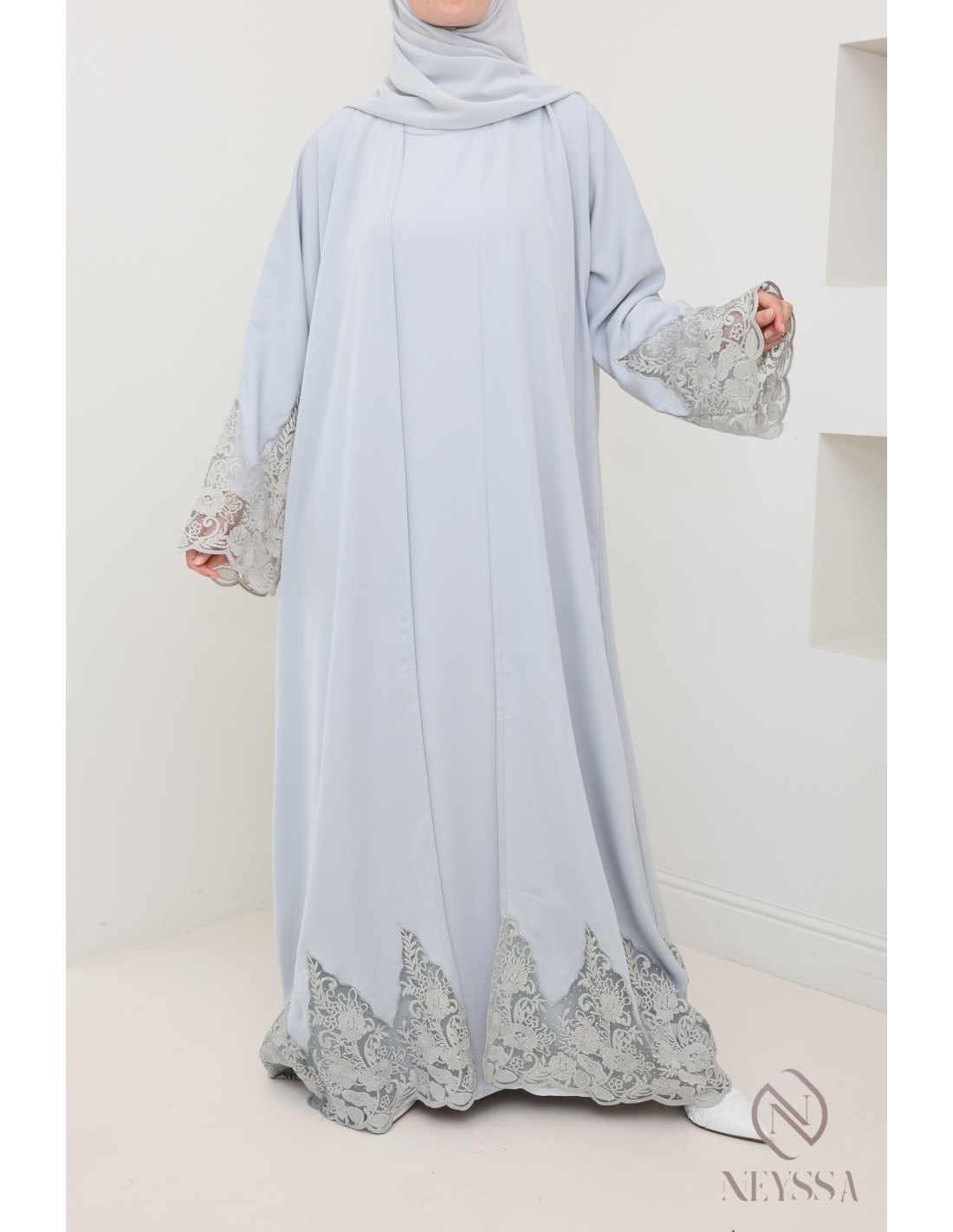 Abaya Dubai Kimono grau mit Stickerei, hochwertiger Stoff aus Nidah.
