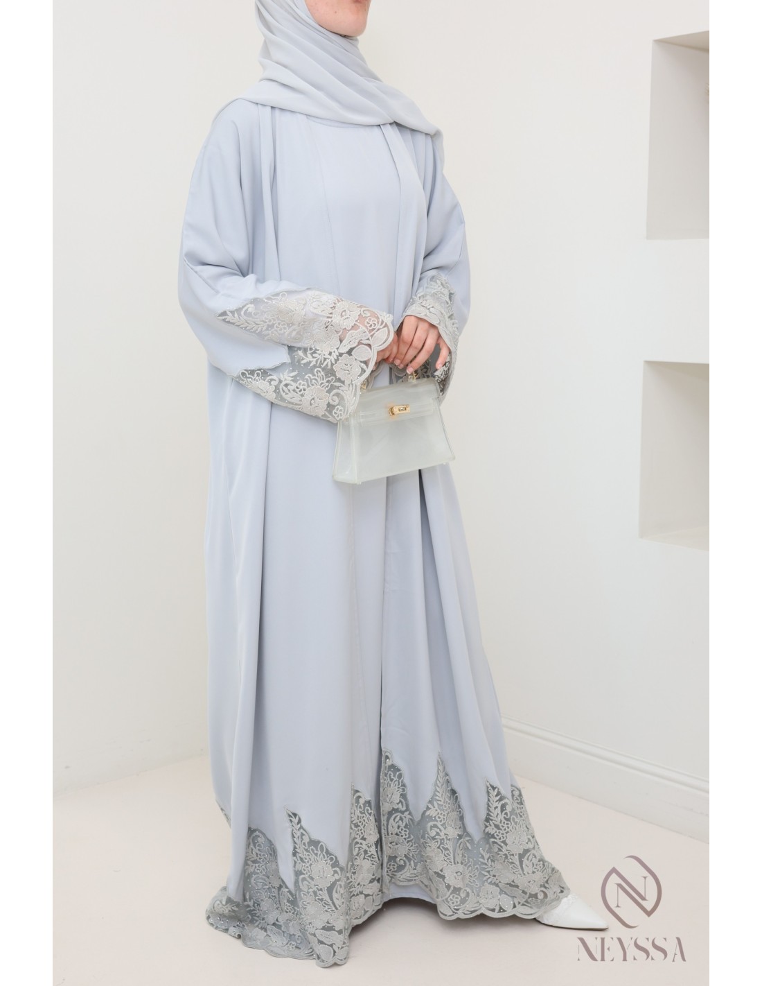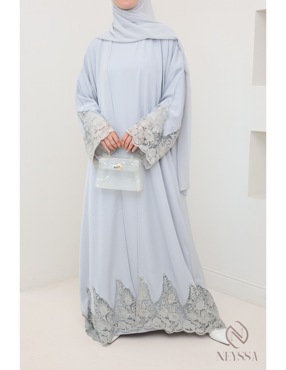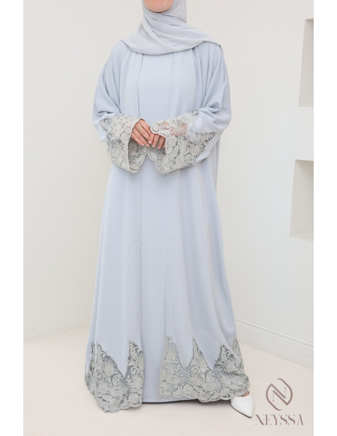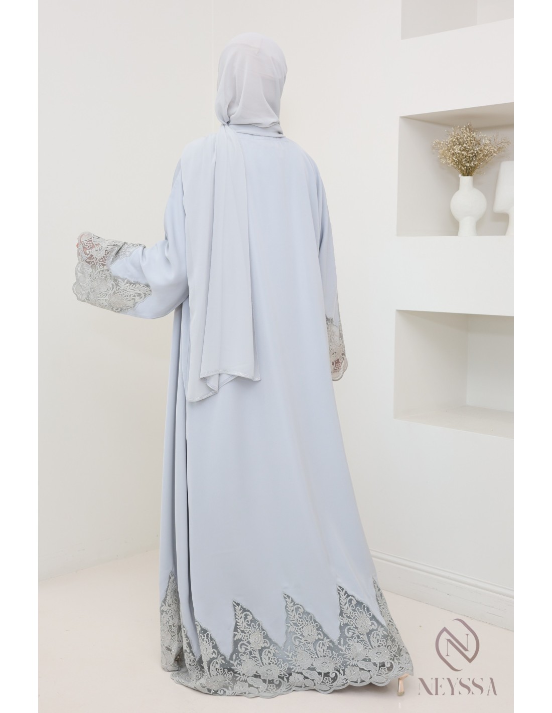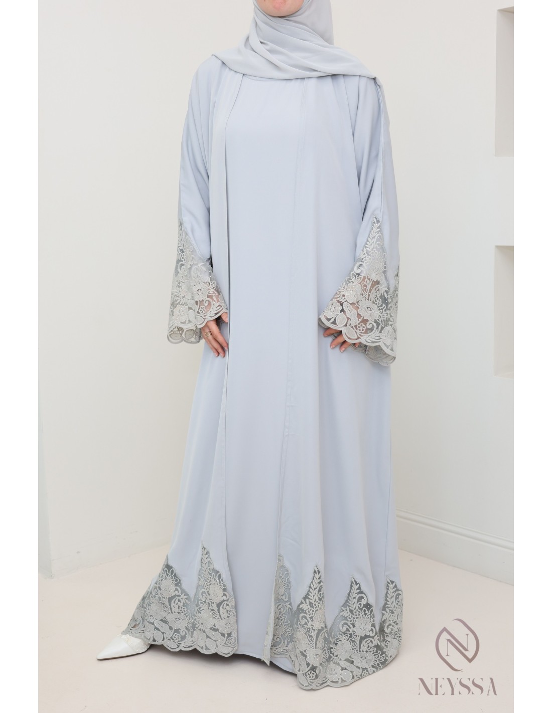 Abaya Dubai Kimono grau mit Stickerei, hochwertiger Stoff aus Nidah.