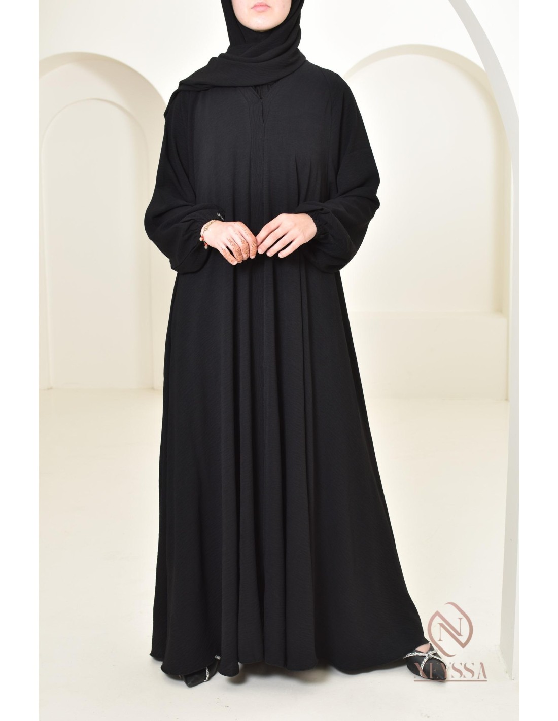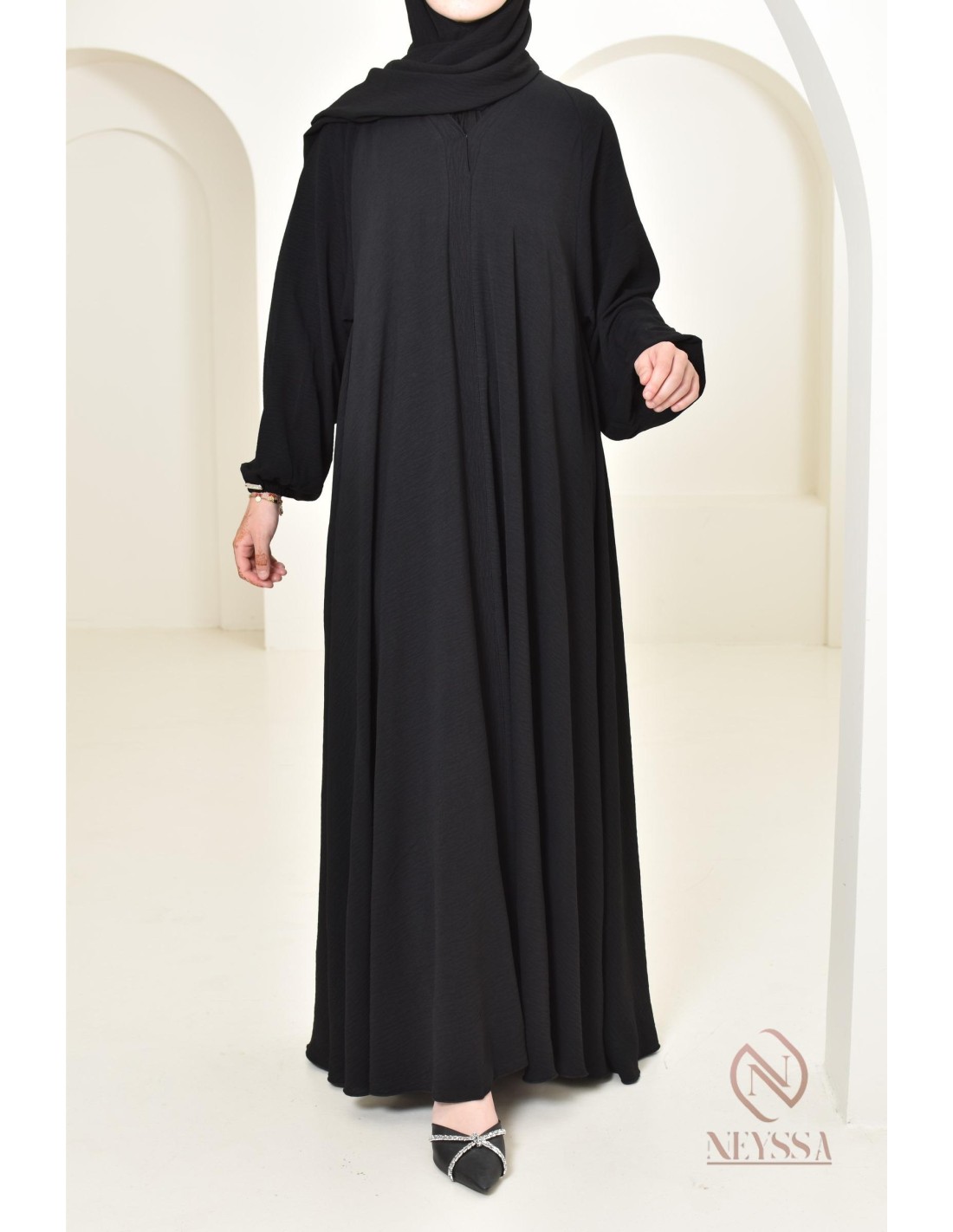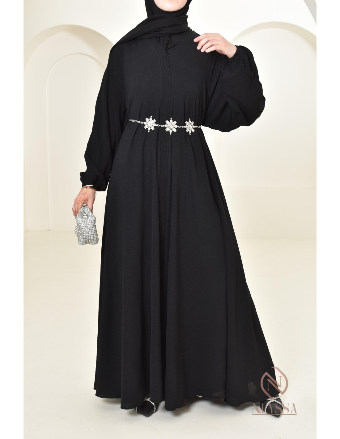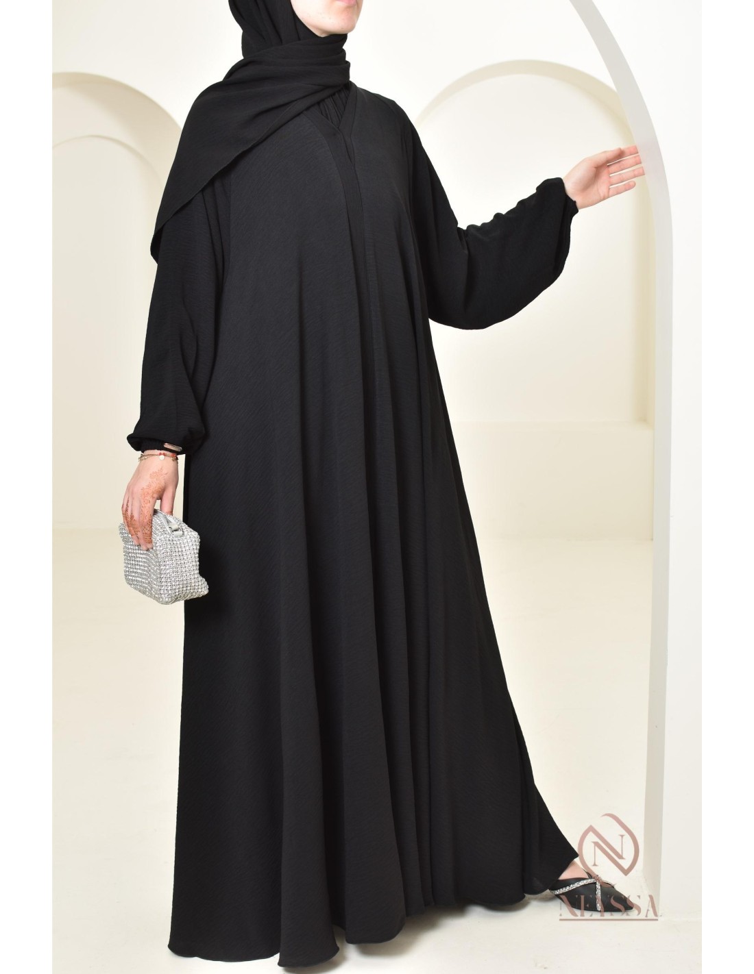 Es handelt sich um ein einfaches Abaya-Kleid, das Sie am Eid, aber nicht nur dort, sublimieren wird! Sie können sie auch zu allen anderen Anlässen tragen.
