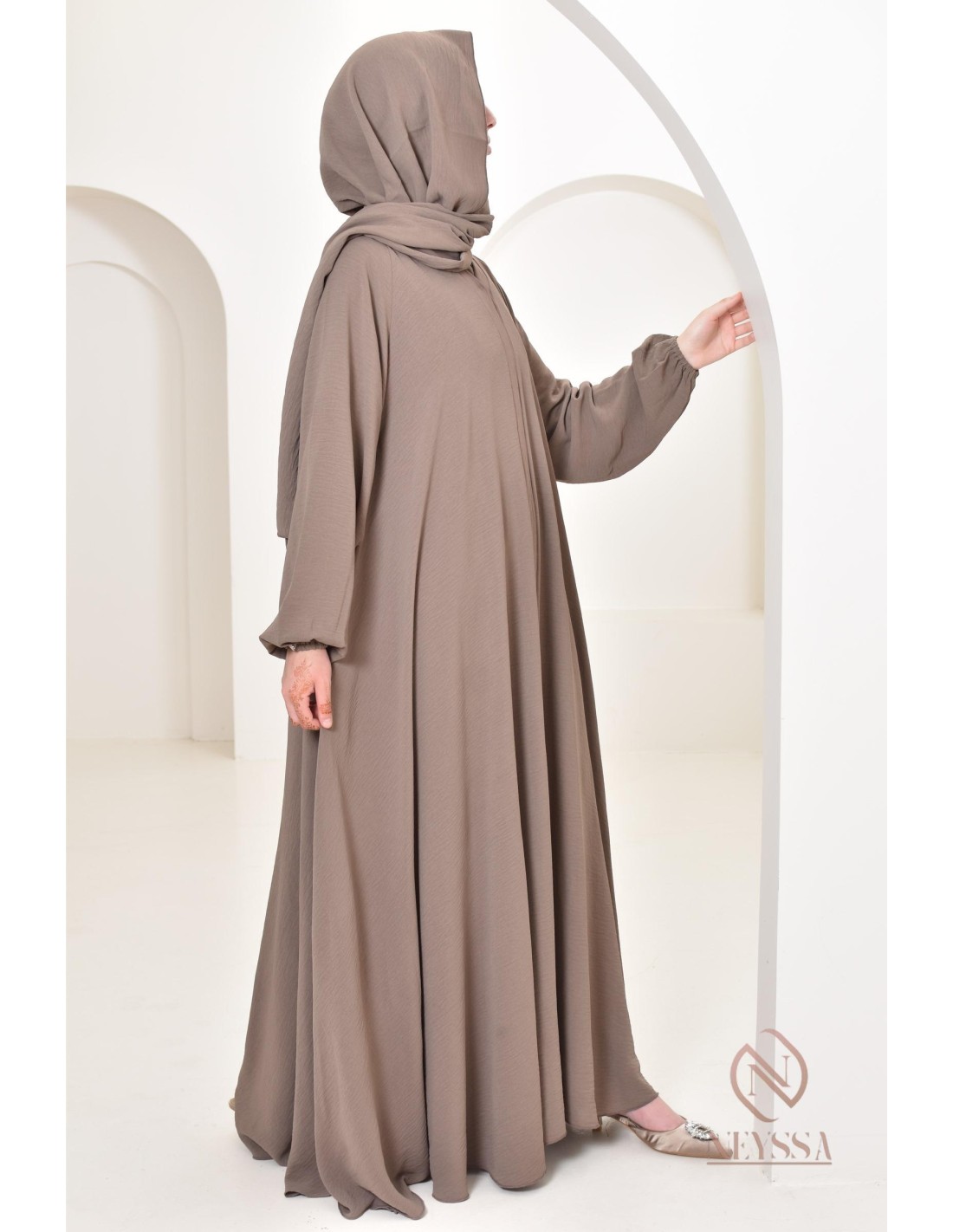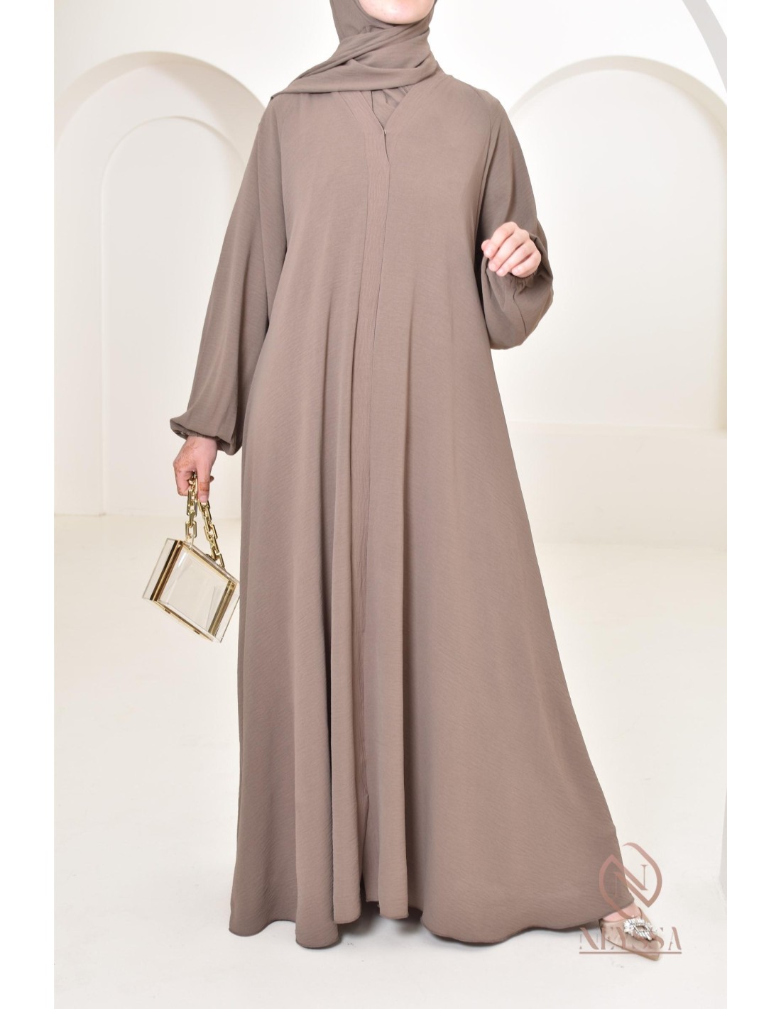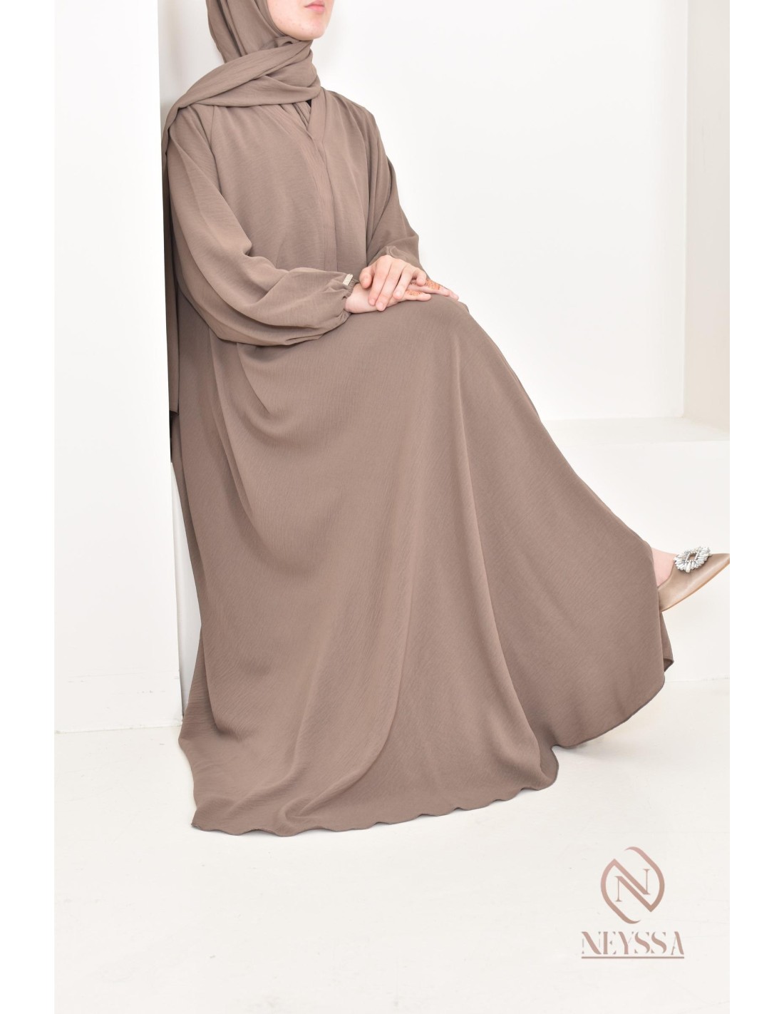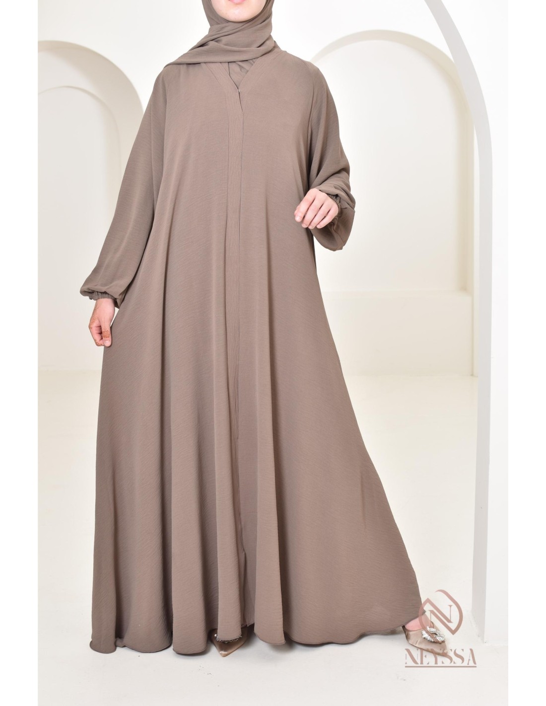 Abaya Dubai Taupe ausladender Schnitt in Jazz: Neyssa Confection.