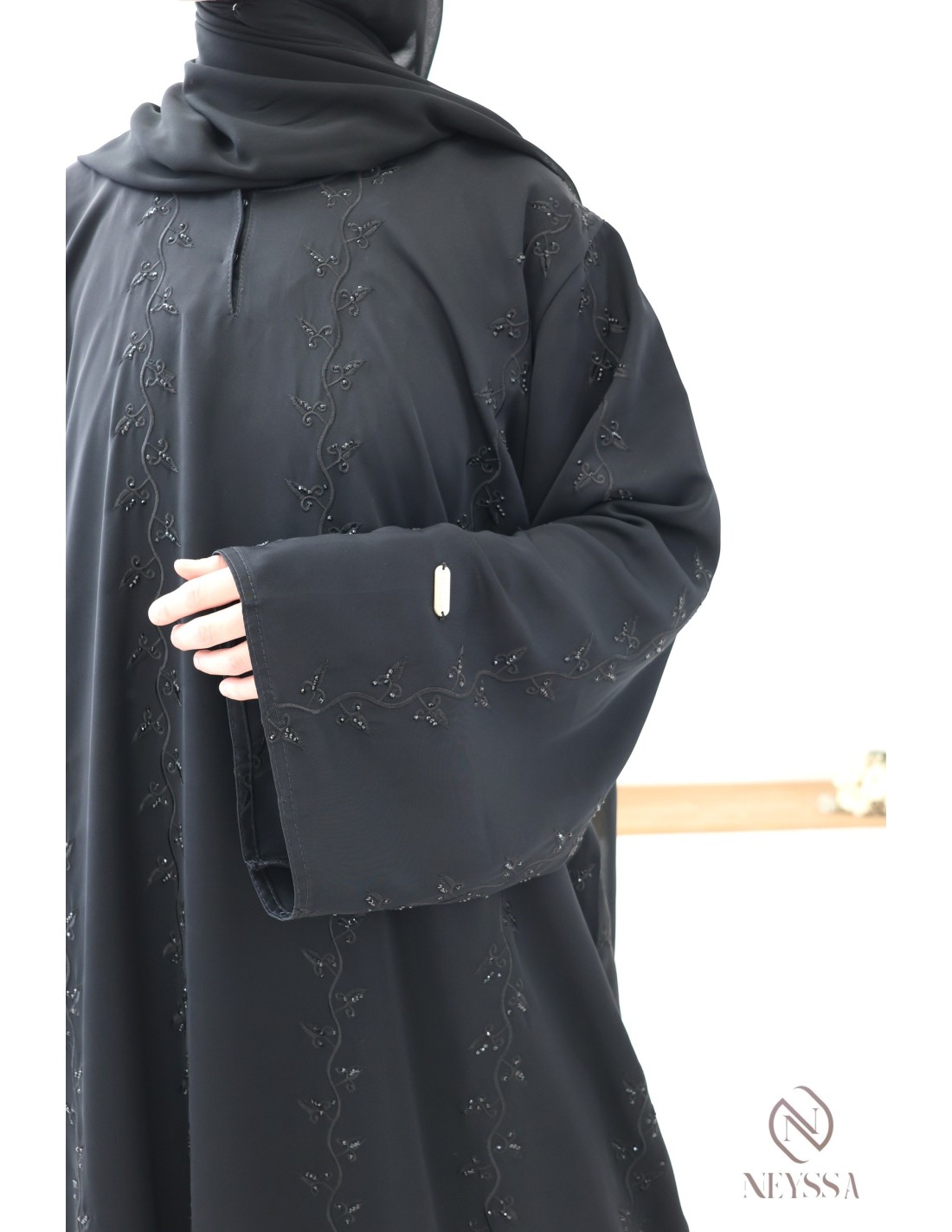 - Perfekte, individuelle Verarbeitung: Eine goldene Neyssa-Plakette ist am Ärmel der Abaya aufgenäht.