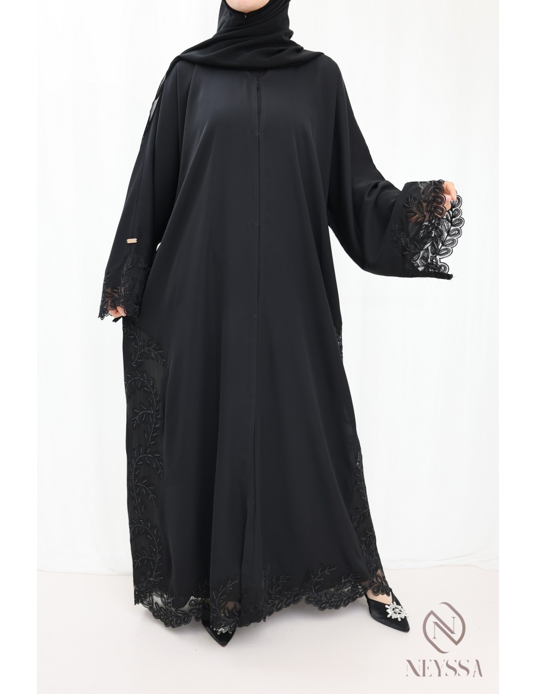 Abaya Dubai Kimono verschleierte Frau mit Stickerei und Spitze chic