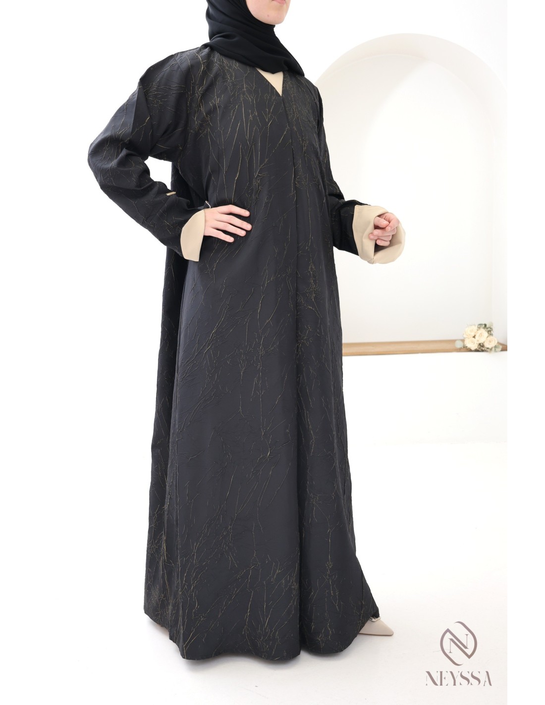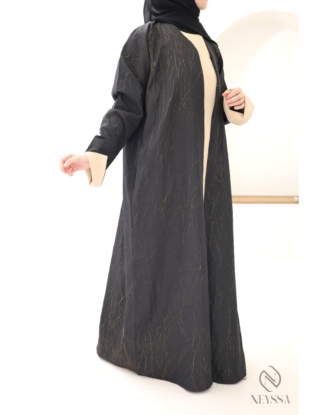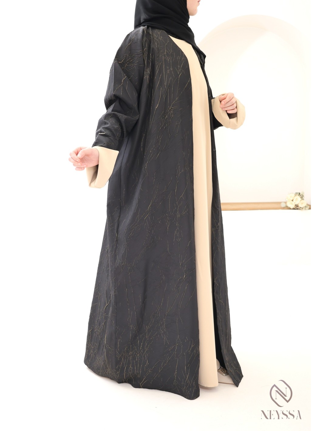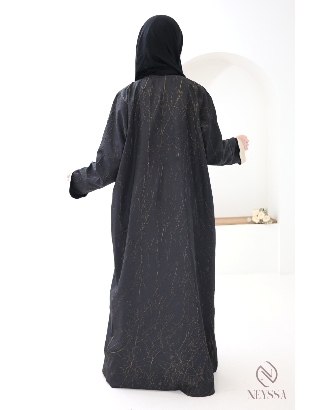 - Perfekte, personalisierte Verarbeitung: Eine goldene Neyssa-Plakette ist von Hand auf den Ärmel der Abaya aufgenäht.