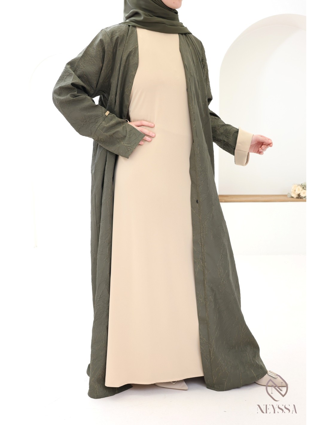 Abaya Dubai 3-teiliger Kimono in Khaki und Beige mit Reliefmustern