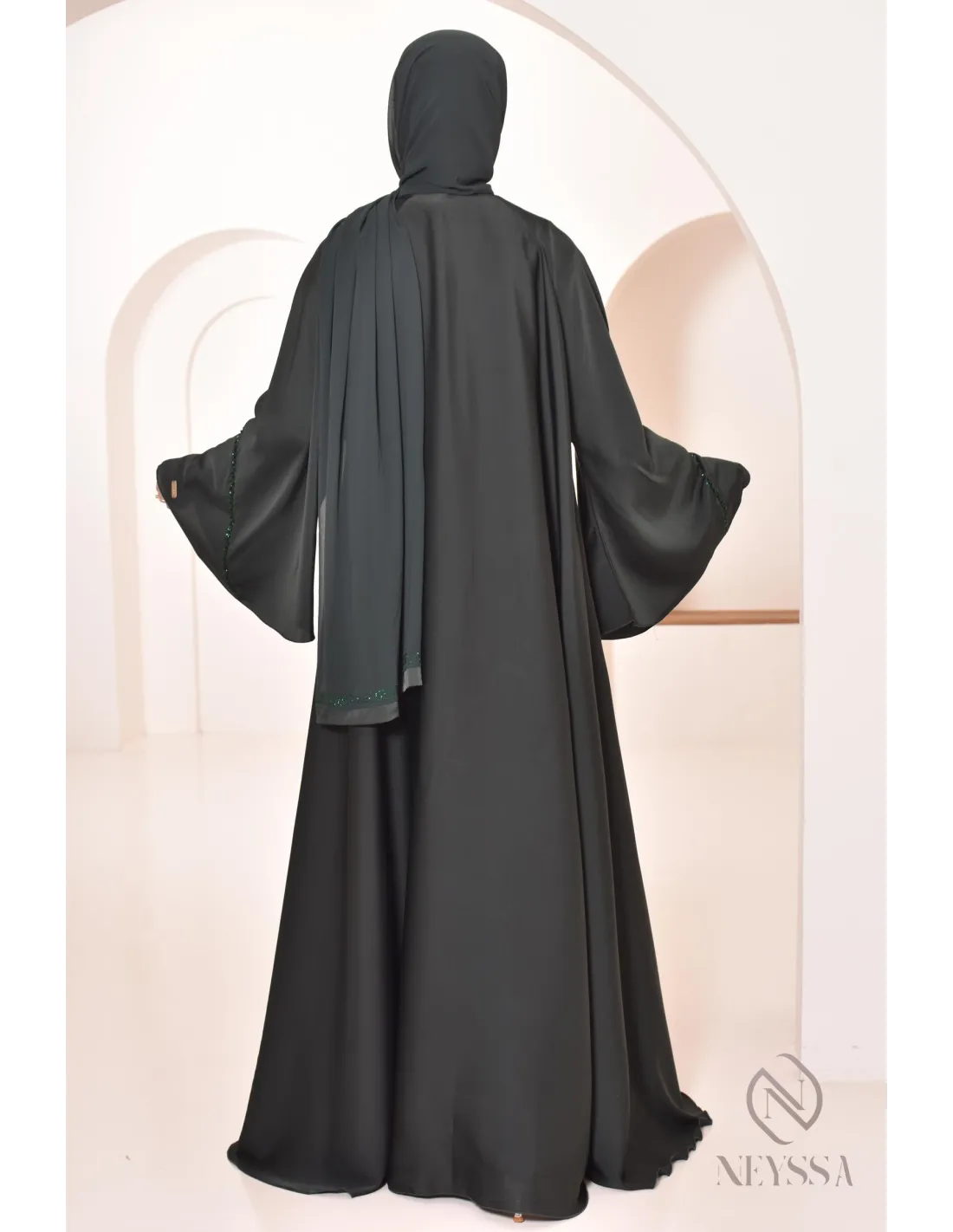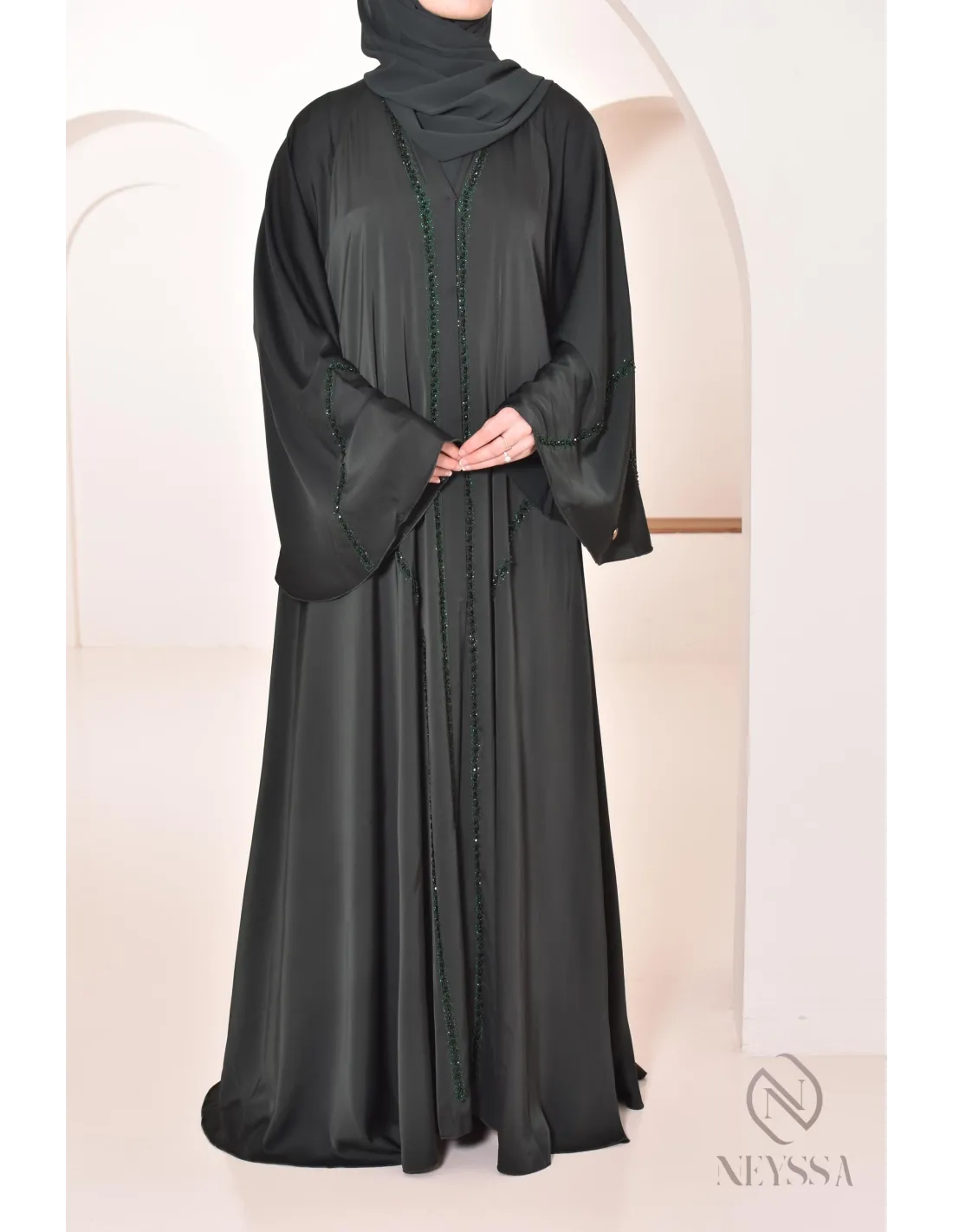 - Perfekte personalisierte Endverarbeitung : Eine silberne Neyssa-Plakette ist am Ärmel der Abaya aufgenäht.