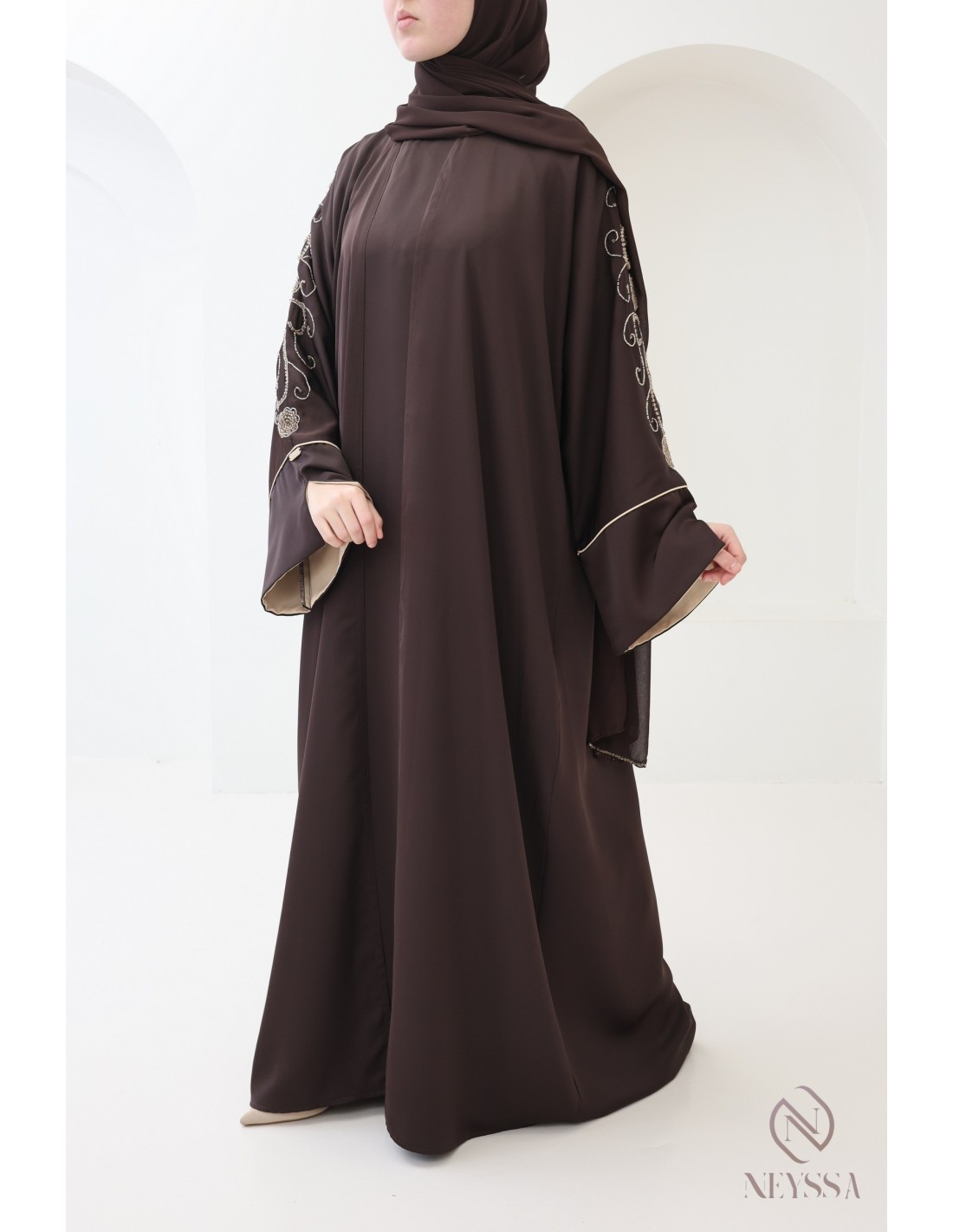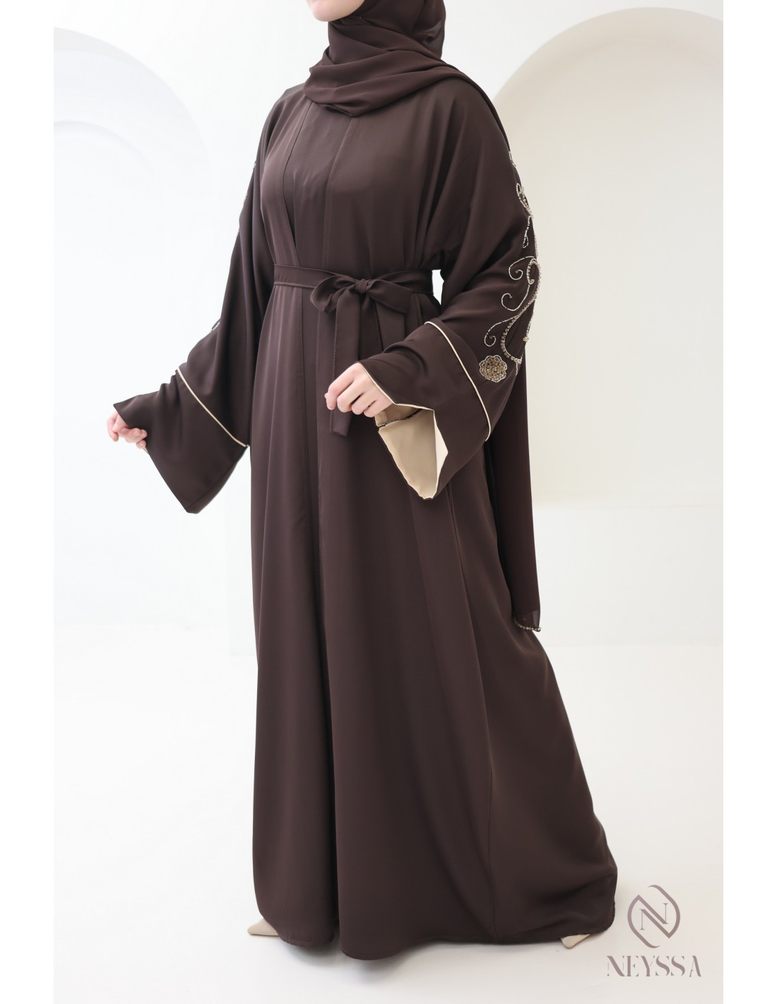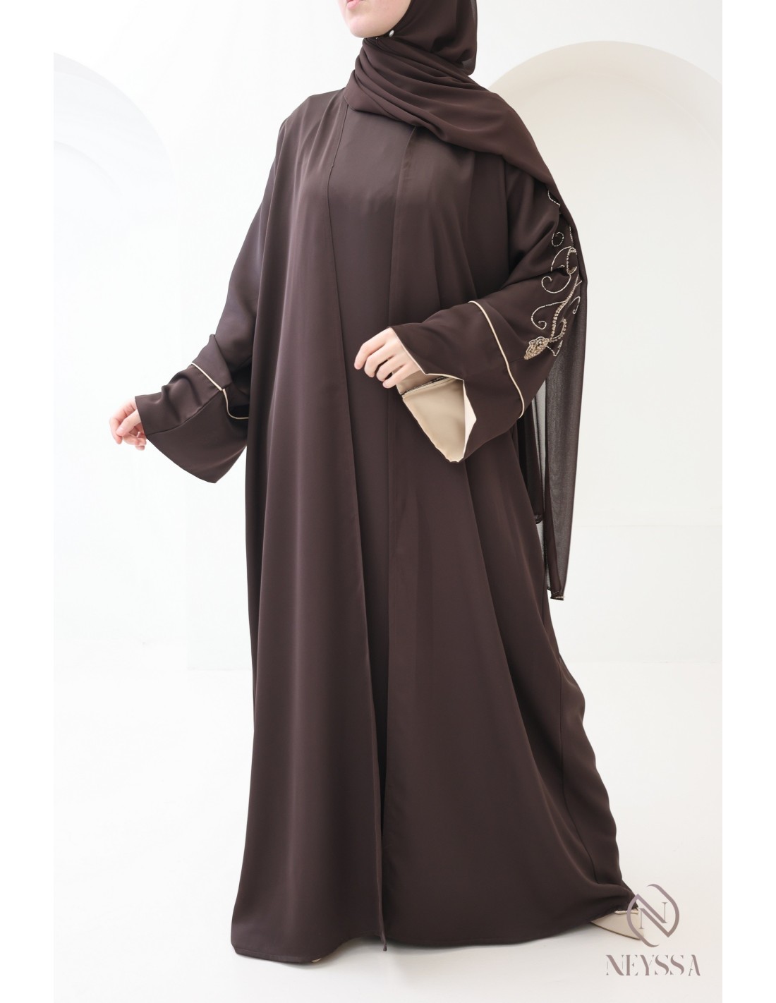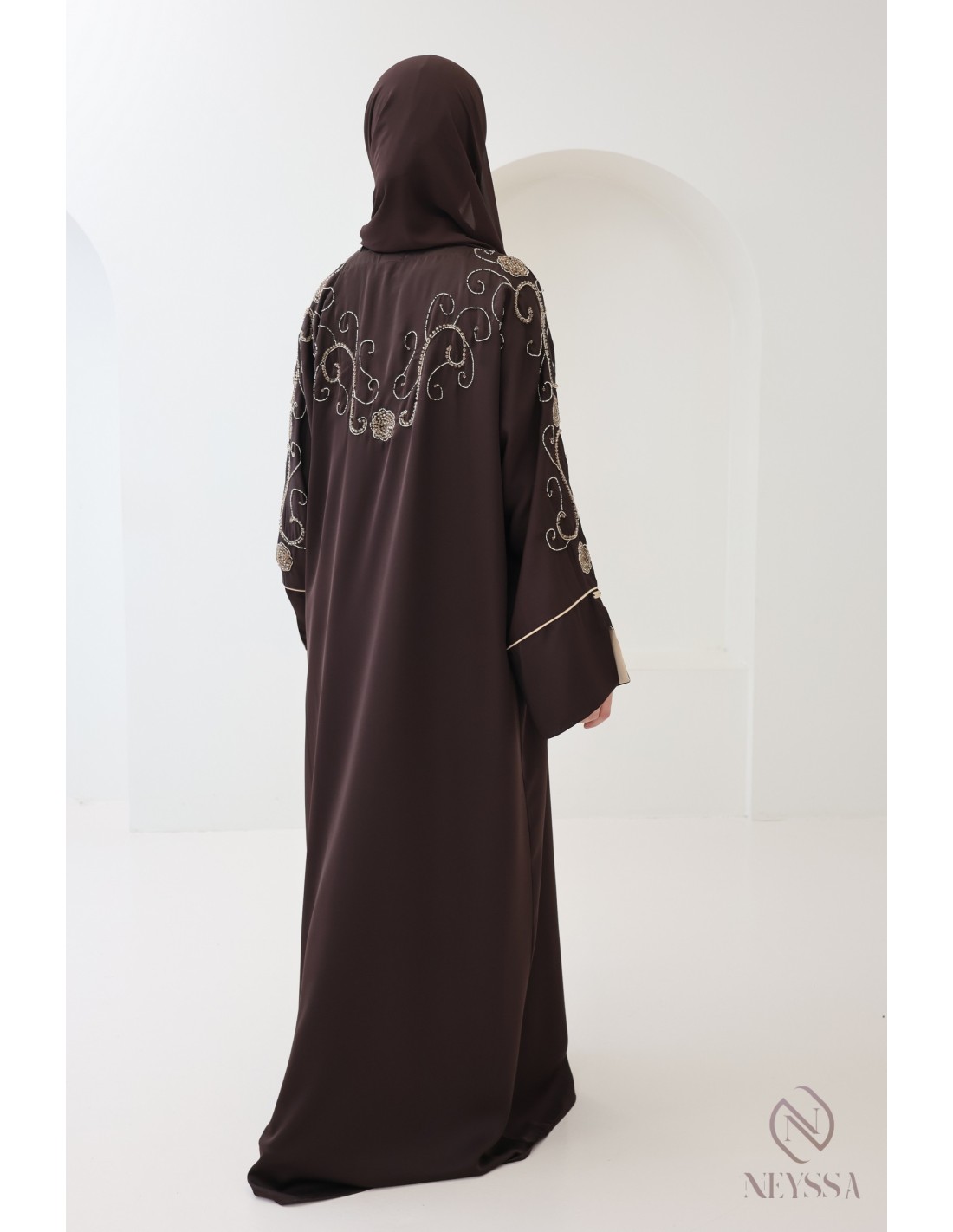 Mit diesem wunderschönen Abaya-Outfit werden Sie an Ihrem großen Tag garantiert strahlen! Die Neyssa-Konfektion stellt eine perfekte Kombination aus Eleganz und Raffinesse dar. Diese Abaya von außergewöhnlicher Qualität wird in unseren Werkstätten in Dubai sorgfältig hergestellt und versprüht einen unvergleichlichen Charme.