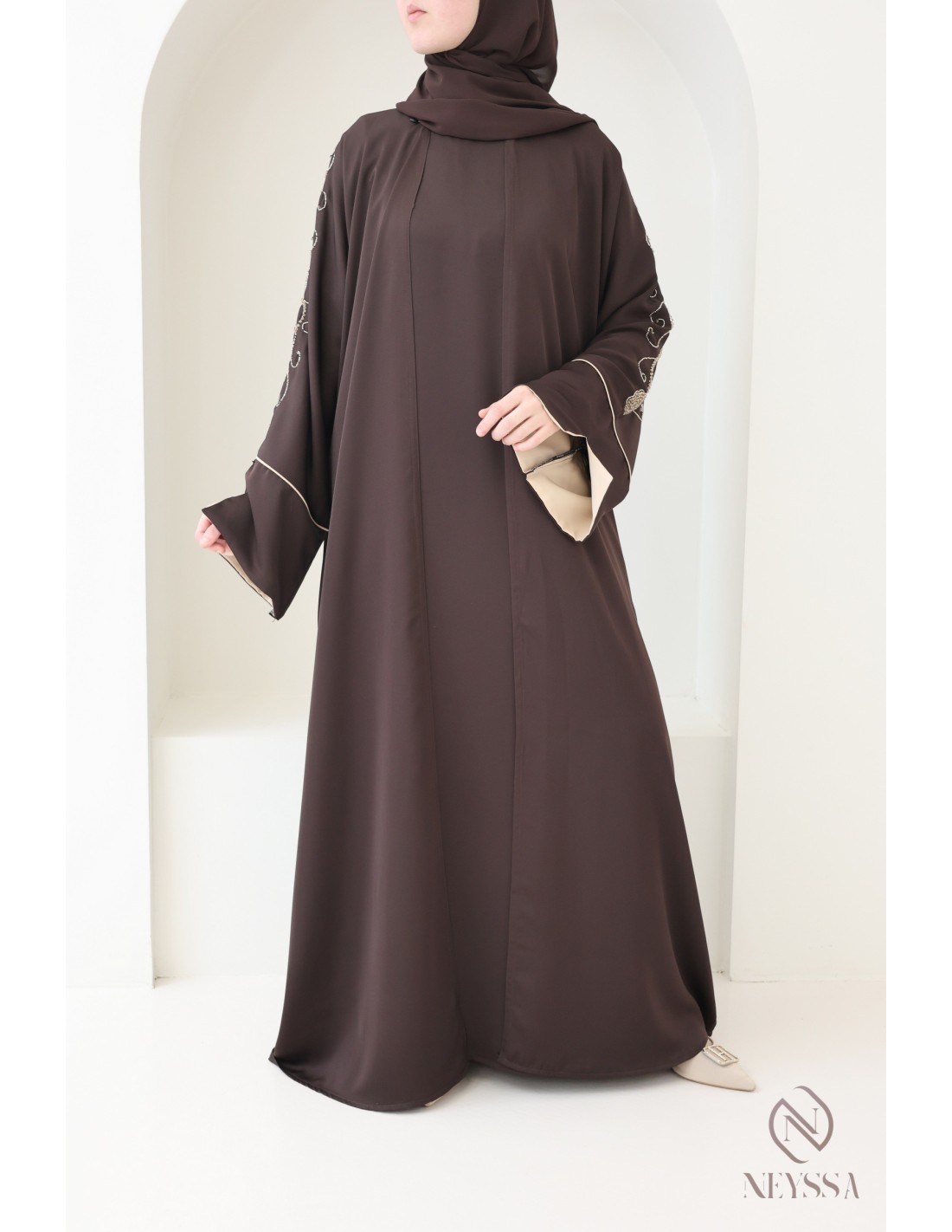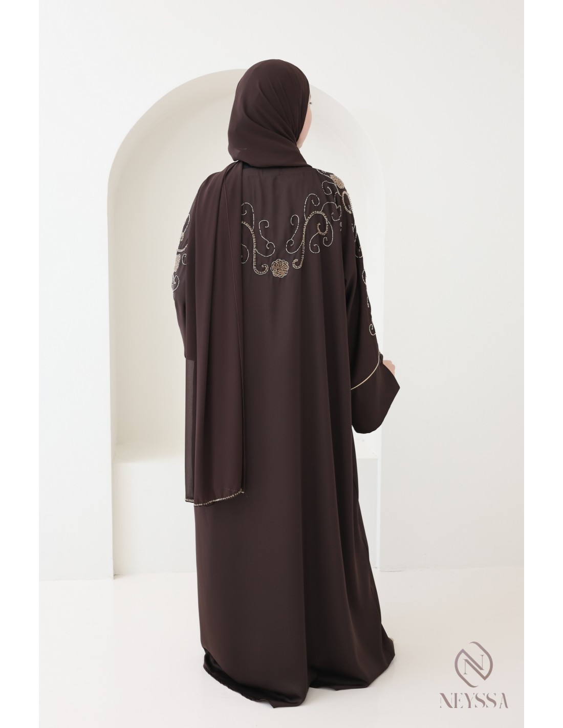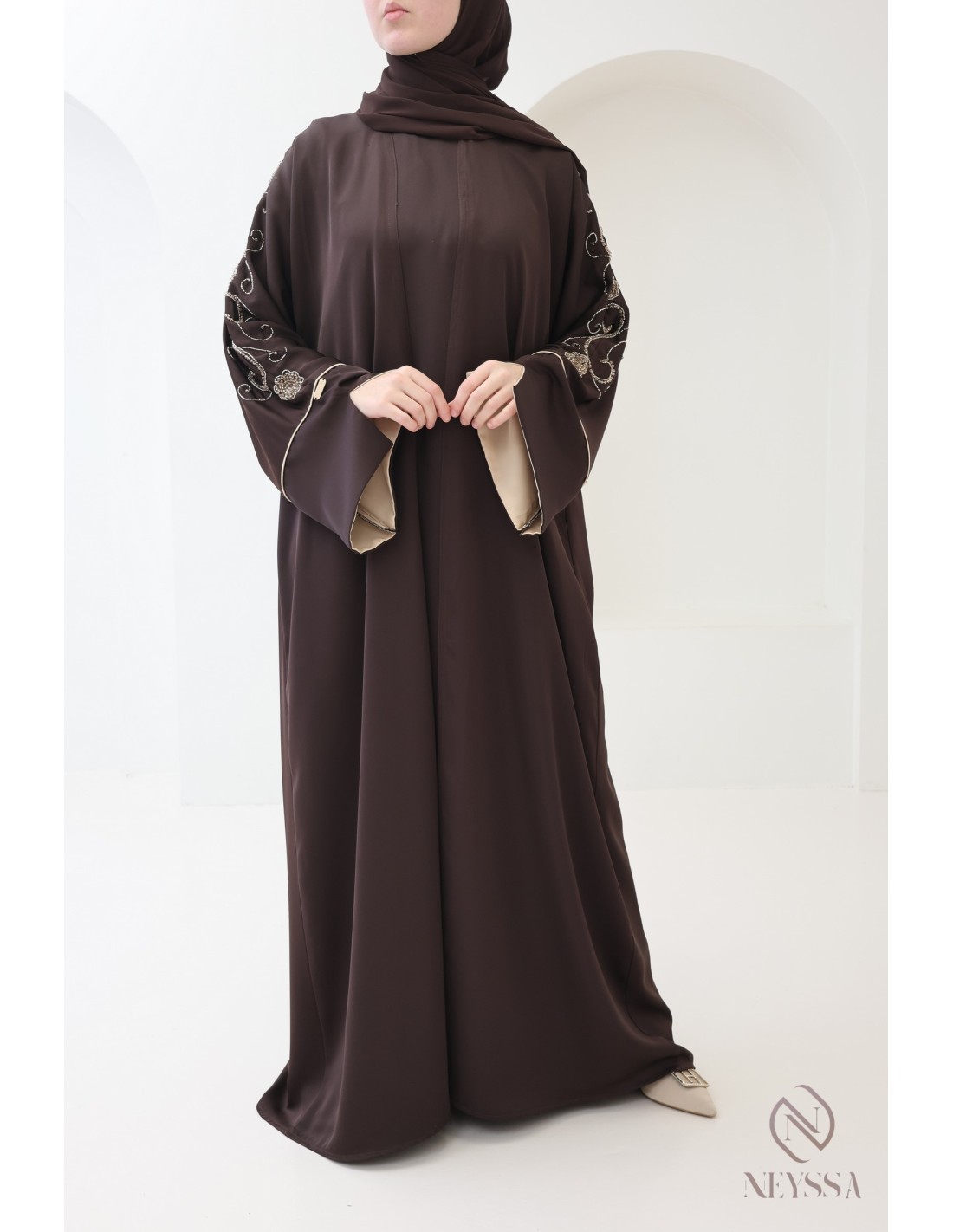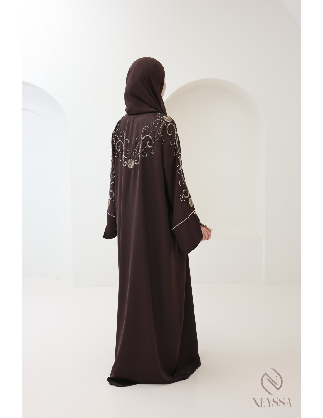 Mit diesem wunderschönen Abaya-Outfit werden Sie an Ihrem großen Tag garantiert strahlen! Die Neyssa-Konfektion stellt eine perfekte Kombination aus Eleganz und Raffinesse dar. Diese Abaya von außergewöhnlicher Qualität wird in unseren Werkstätten in Dubai sorgfältig hergestellt und versprüht einen unvergleichlichen Charme.