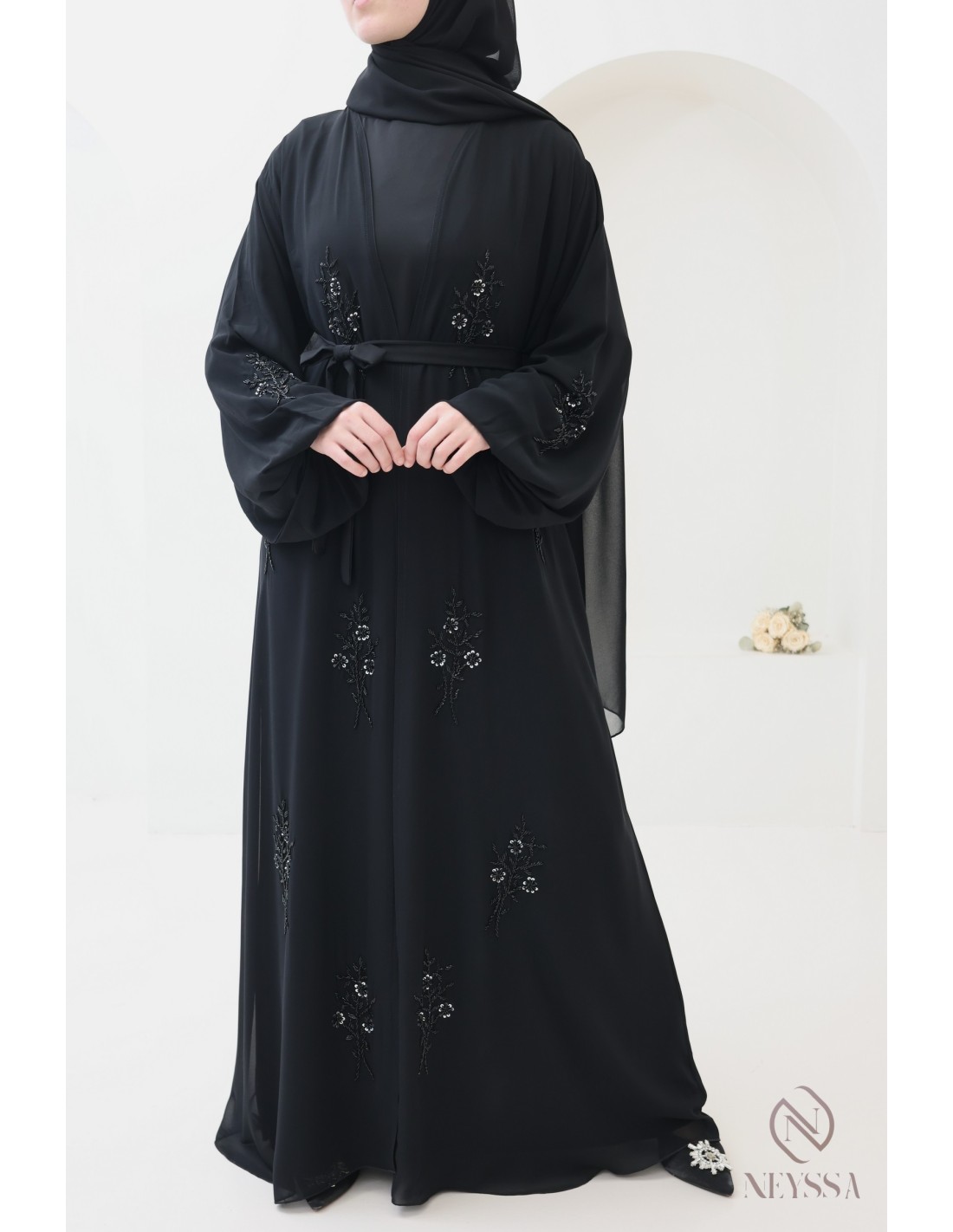 Mit diesem wunderschönen Abaya-Outfit werden Sie an Ihrem großen Tag garantiert strahlen! Die Neyssa-Konfektion stellt eine perfekte Kombination aus Eleganz und Raffinesse dar. Diese Abaya von außergewöhnlicher Qualität wird in unseren Werkstätten in Dubai sorgfältig hergestellt und versprüht einen unvergleichlichen Charme.