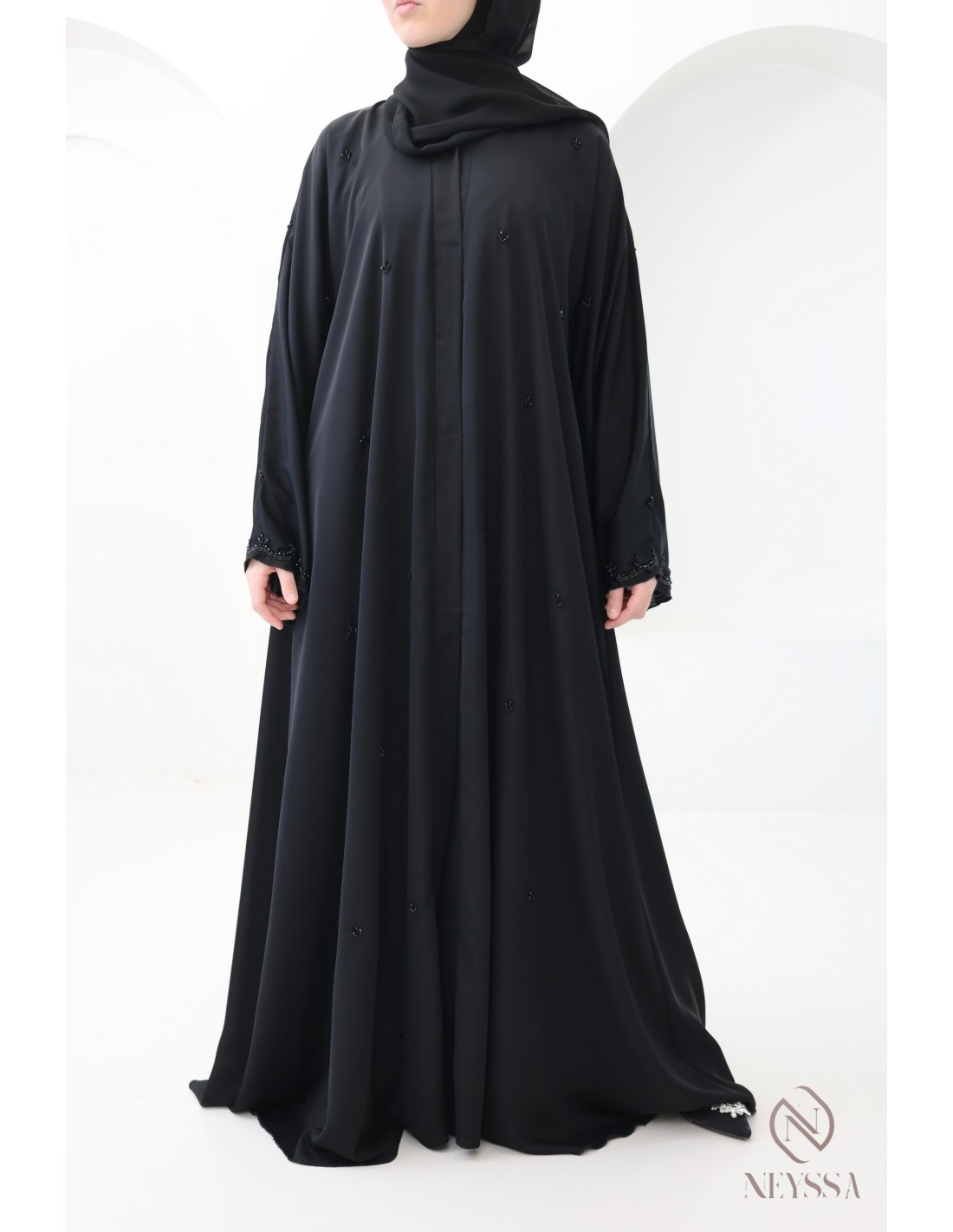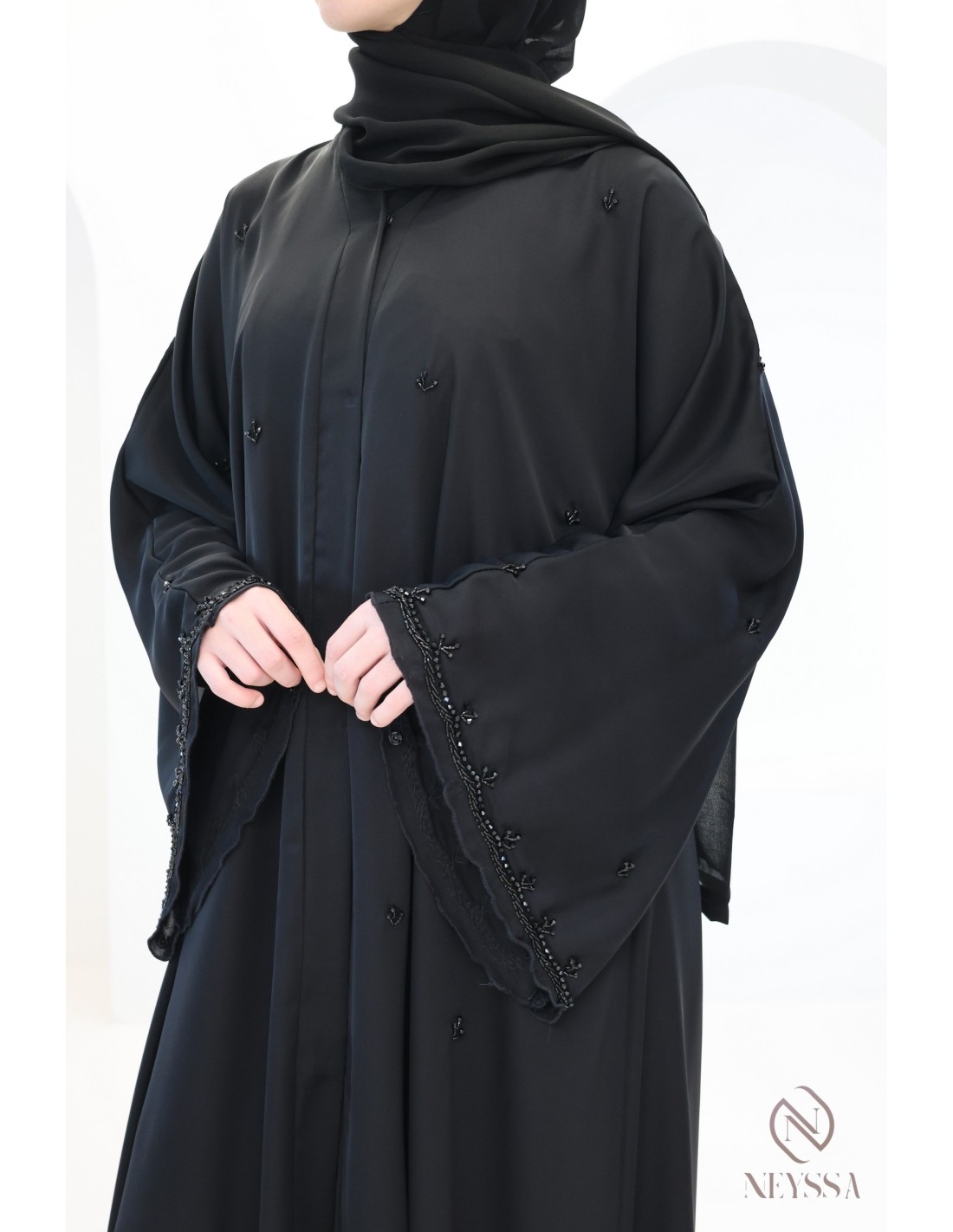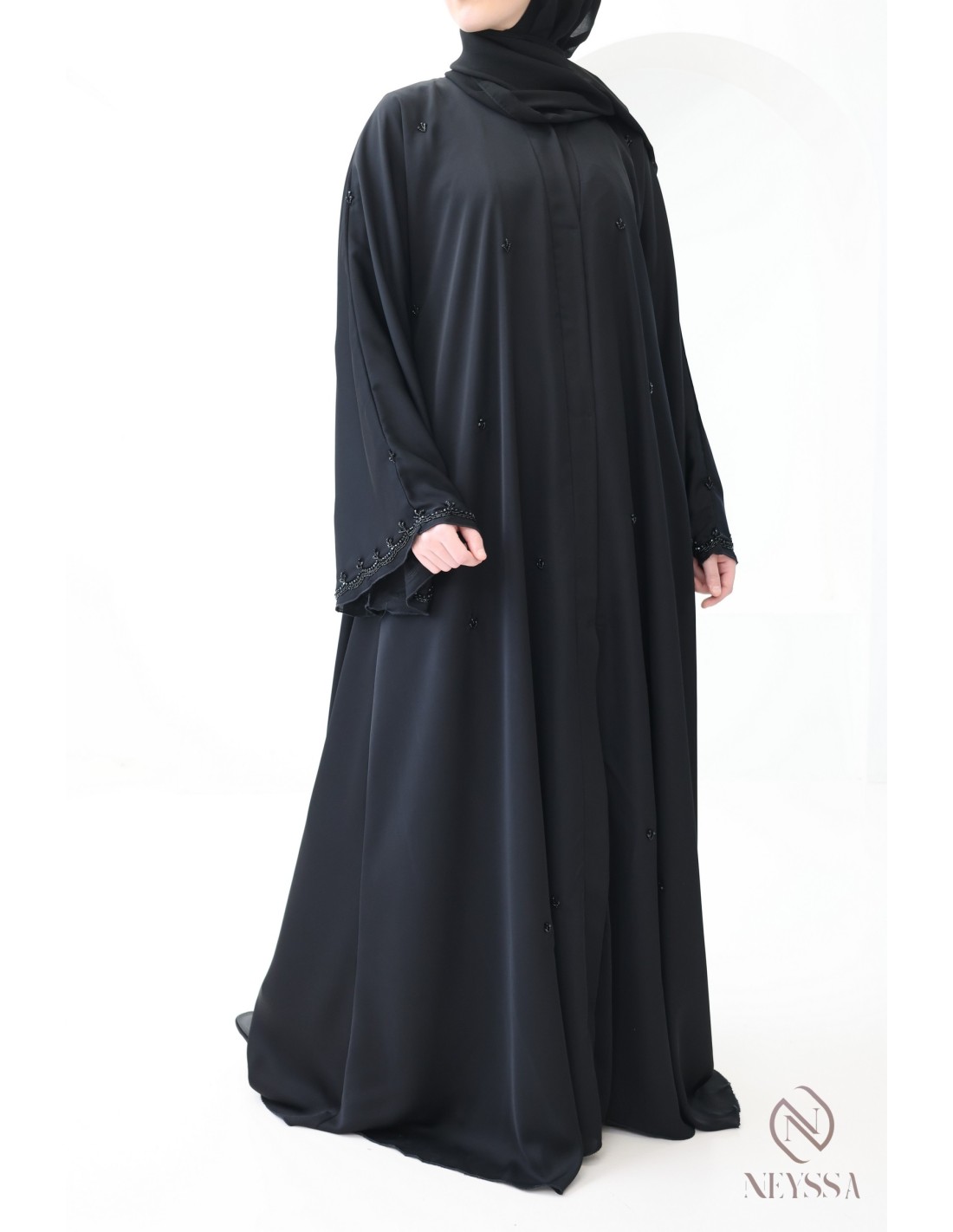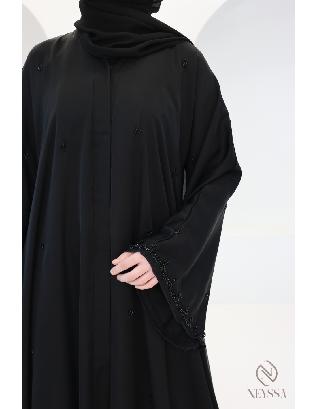 - Perfekte personalisierte Endverarbeitung : Eine silberne Neyssa-Plakette ist am Ärmel der Abaya aufgenäht.