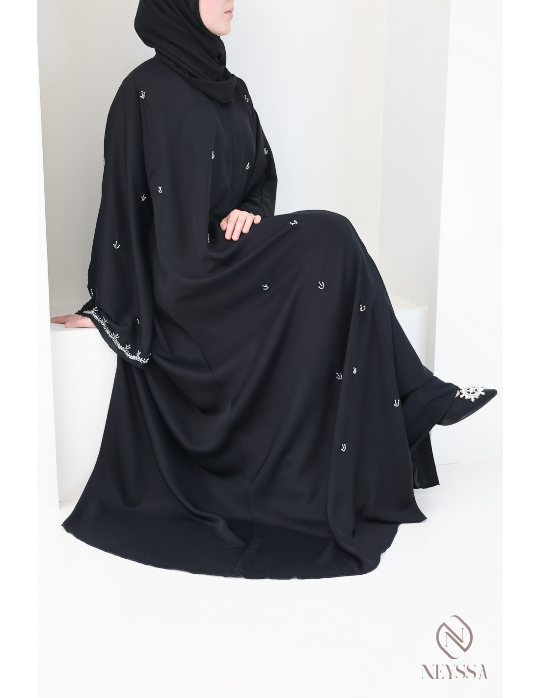 - Perfekte personalisierte Endverarbeitung : Eine silberne Neyssa-Plakette ist am Ärmel der Abaya aufgenäht.
