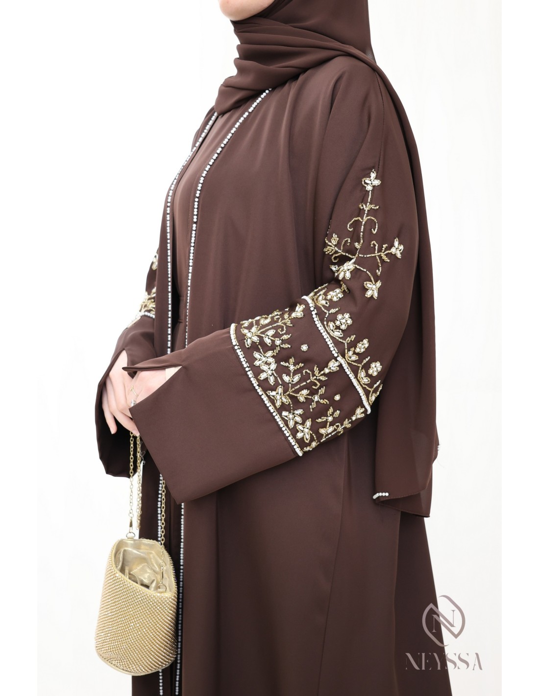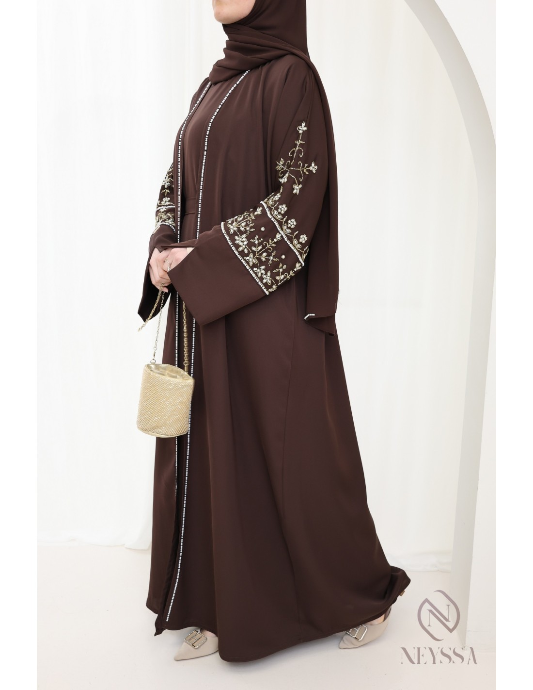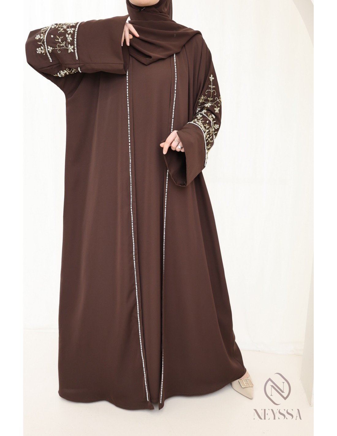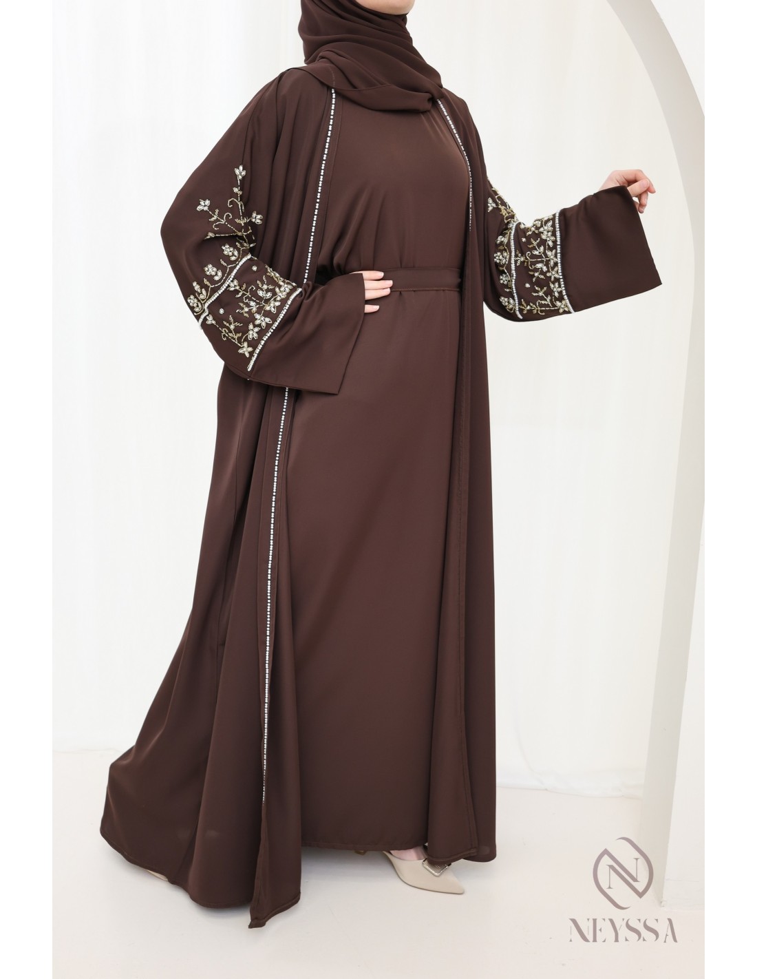 Mit diesem wunderschönen Abaya-Outfit werden Sie an Ihrem großen Tag garantiert strahlen! Die Neyssa-Konfektion stellt eine perfekte Kombination aus Eleganz und Raffinesse dar. Diese Abaya von außergewöhnlicher Qualität wird in unseren Werkstätten in Dubai sorgfältig hergestellt und versprüht einen unvergleichlichen Charme.