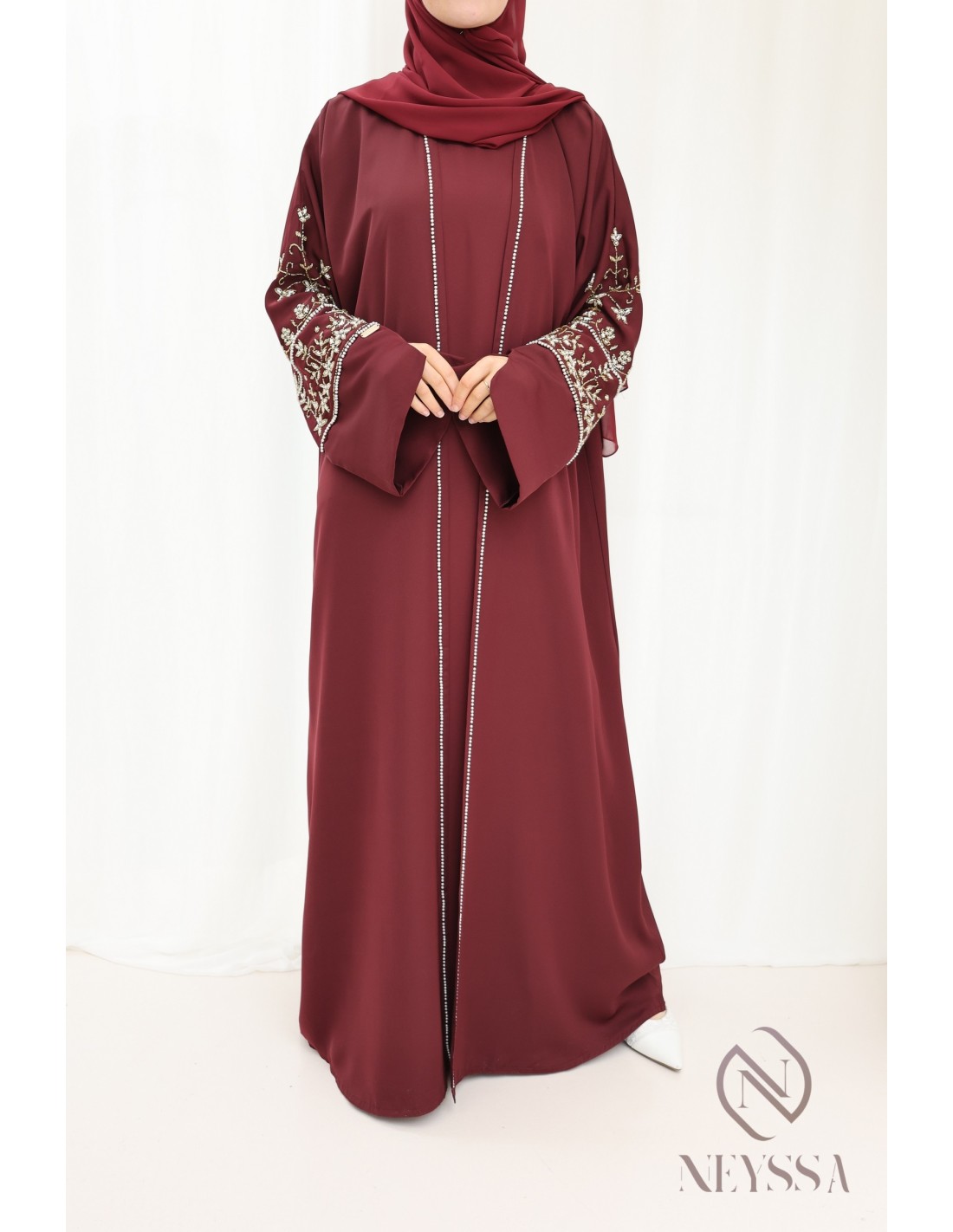 Mit diesem wunderschönen Abaya-Outfit werden Sie an Ihrem großen Tag garantiert strahlen! Die Neyssa-Konfektion stellt eine perfekte Kombination aus Eleganz und Raffinesse dar. Diese Abaya von außergewöhnlicher Qualität wird in unseren Werkstätten in Dubai sorgfältig hergestellt und versprüht einen unvergleichlichen Charme.