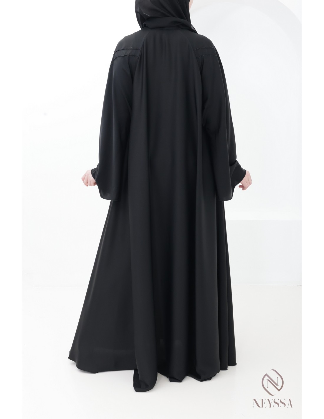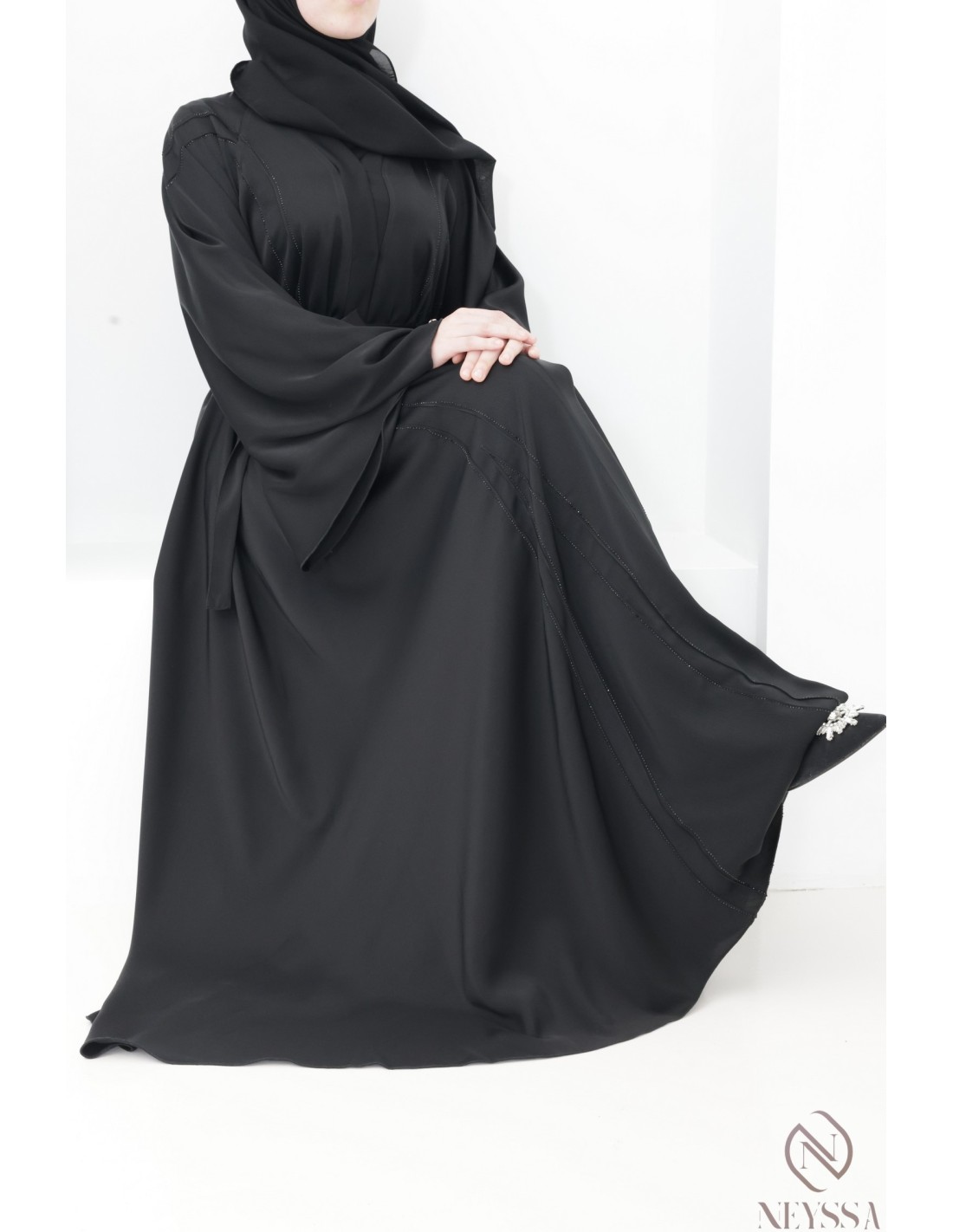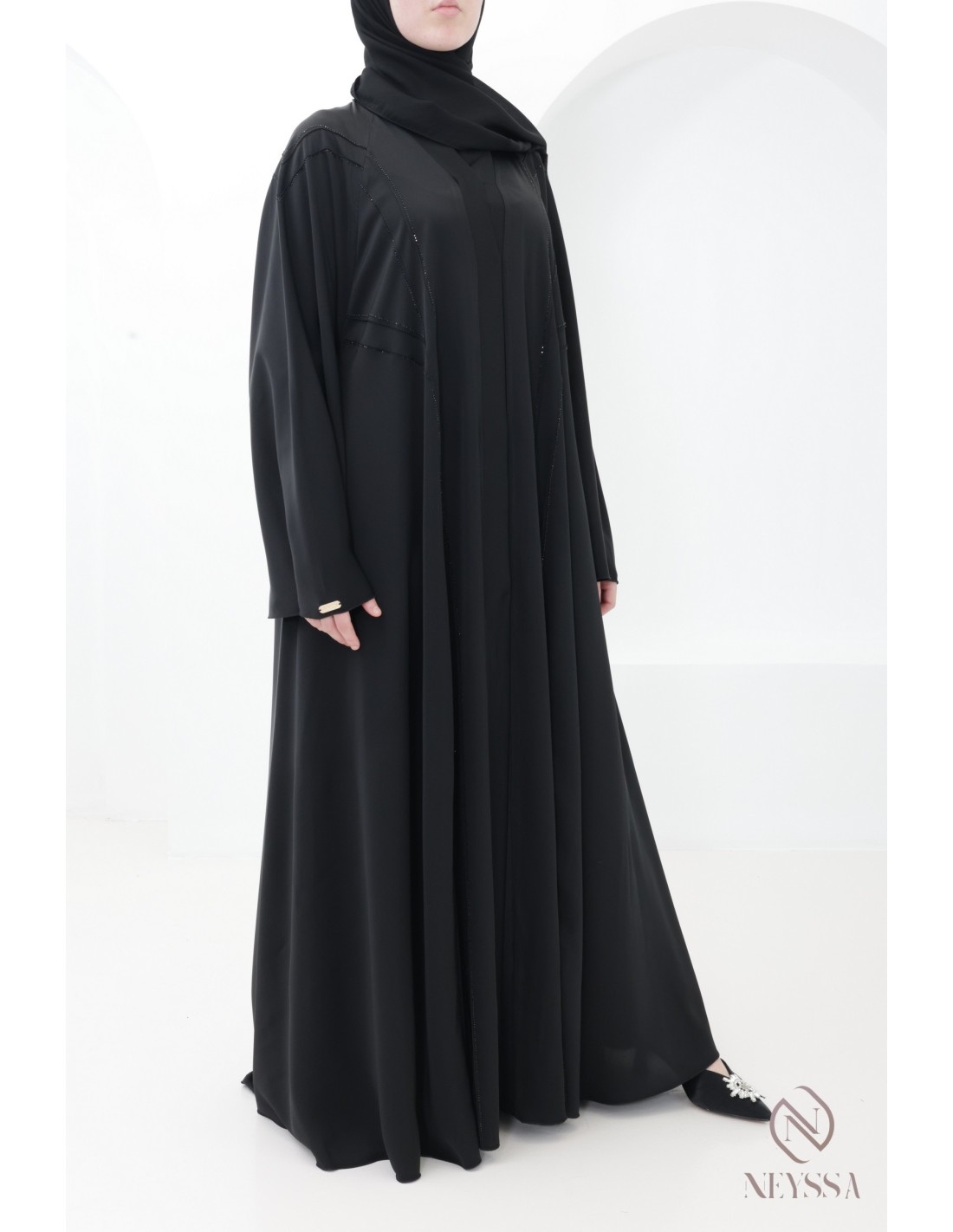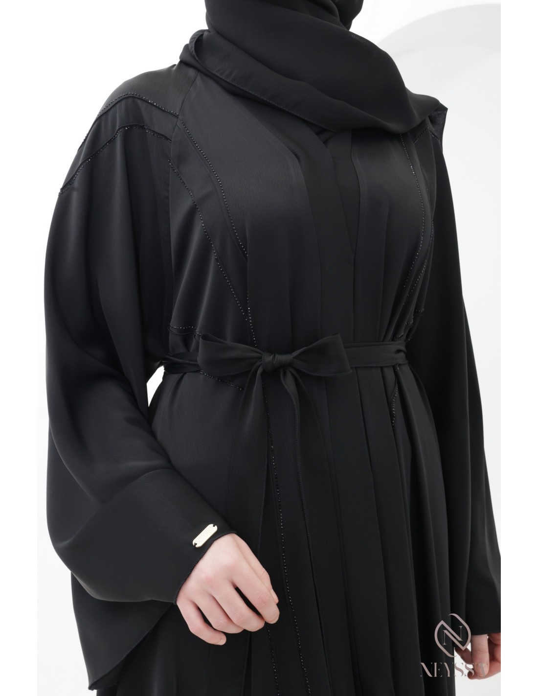 - Perfekte personalisierte Endverarbeitung : Eine silberne Neyssa-Plakette ist am Ärmel der Abaya aufgenäht.