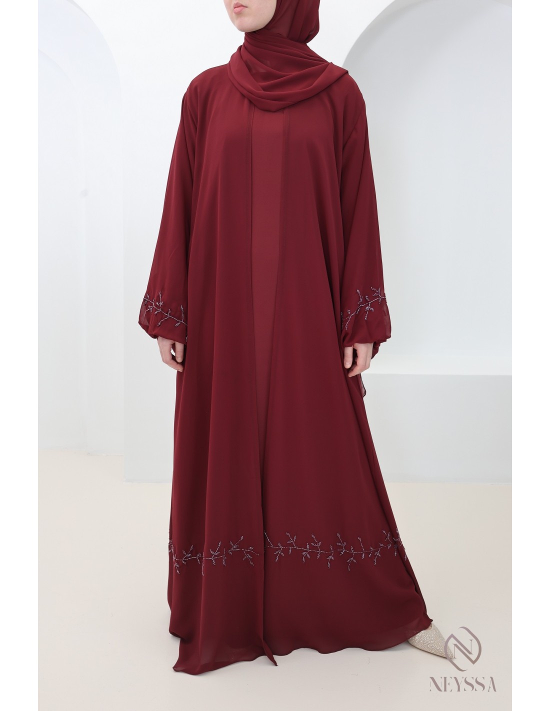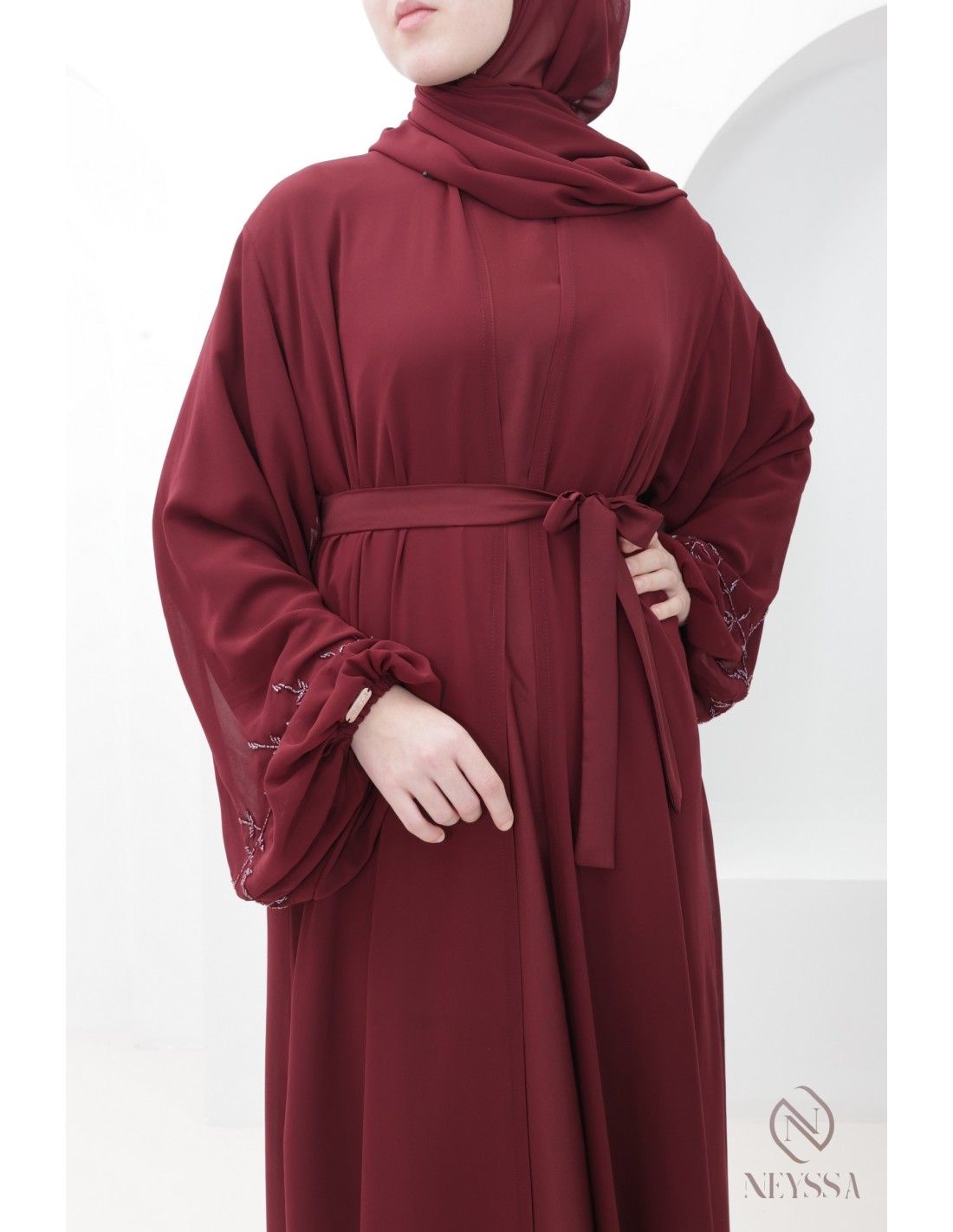 Mit diesem wunderschönen Abaya-Outfit werden Sie an Ihrem großen Tag garantiert strahlen! Die Neyssa-Konfektion stellt eine perfekte Kombination aus Eleganz und Raffinesse dar. Diese Abaya von außergewöhnlicher Qualität wird in unseren Werkstätten in Dubai sorgfältig hergestellt und versprüht einen unvergleichlichen Charme.