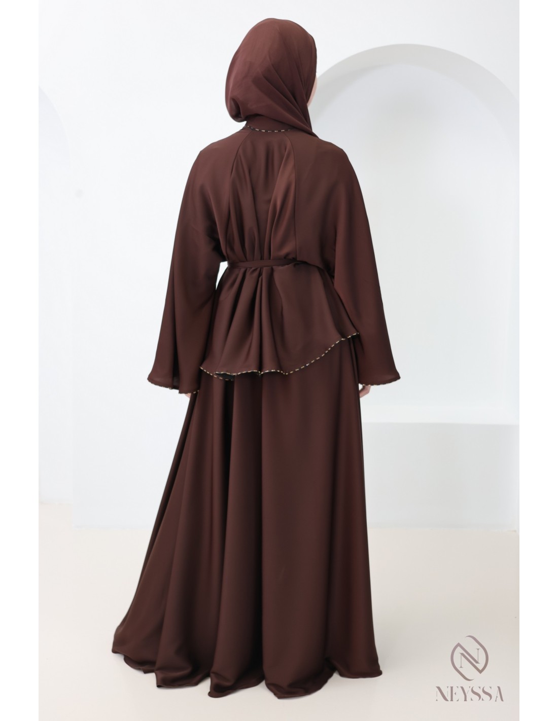 Abaya Dubai, schicker Kimono, Schokoladenbraun, mit Rüschen und Strasssteinen, ausgestellt
