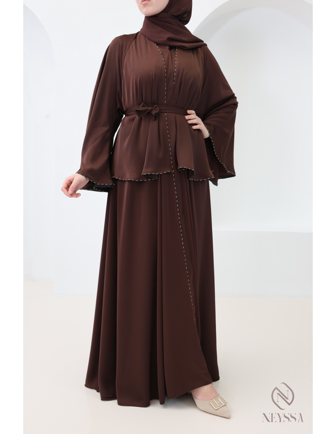 Abaya Dubai, schicker Kimono, Schokoladenbraun, mit Rüschen und Strasssteinen, ausgestellt