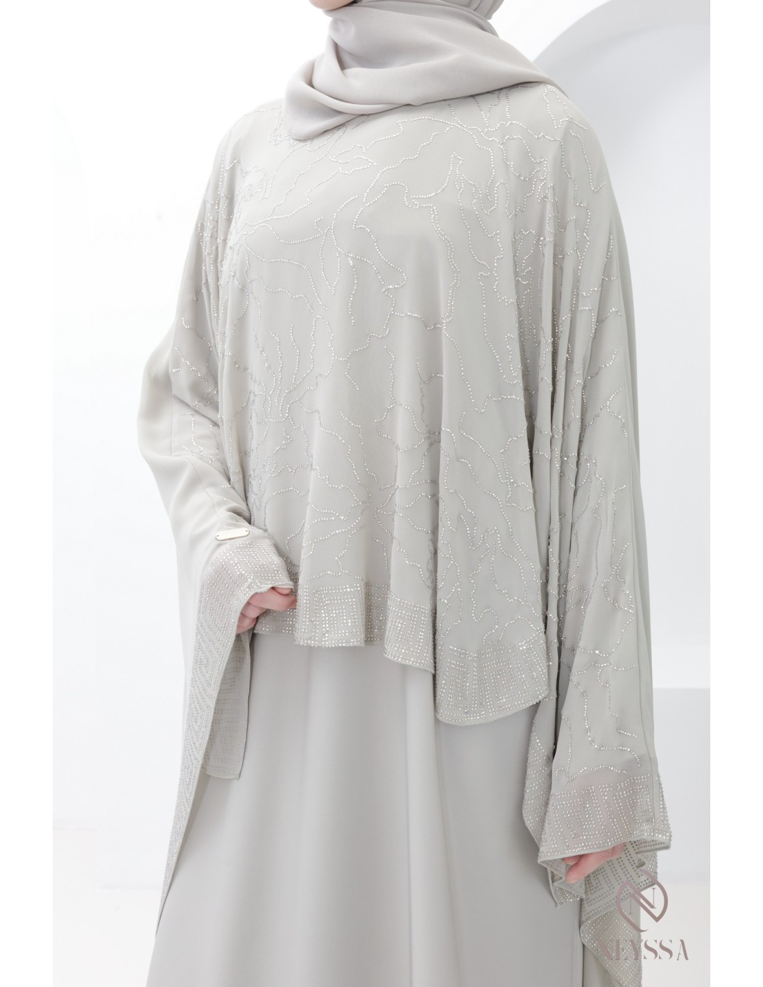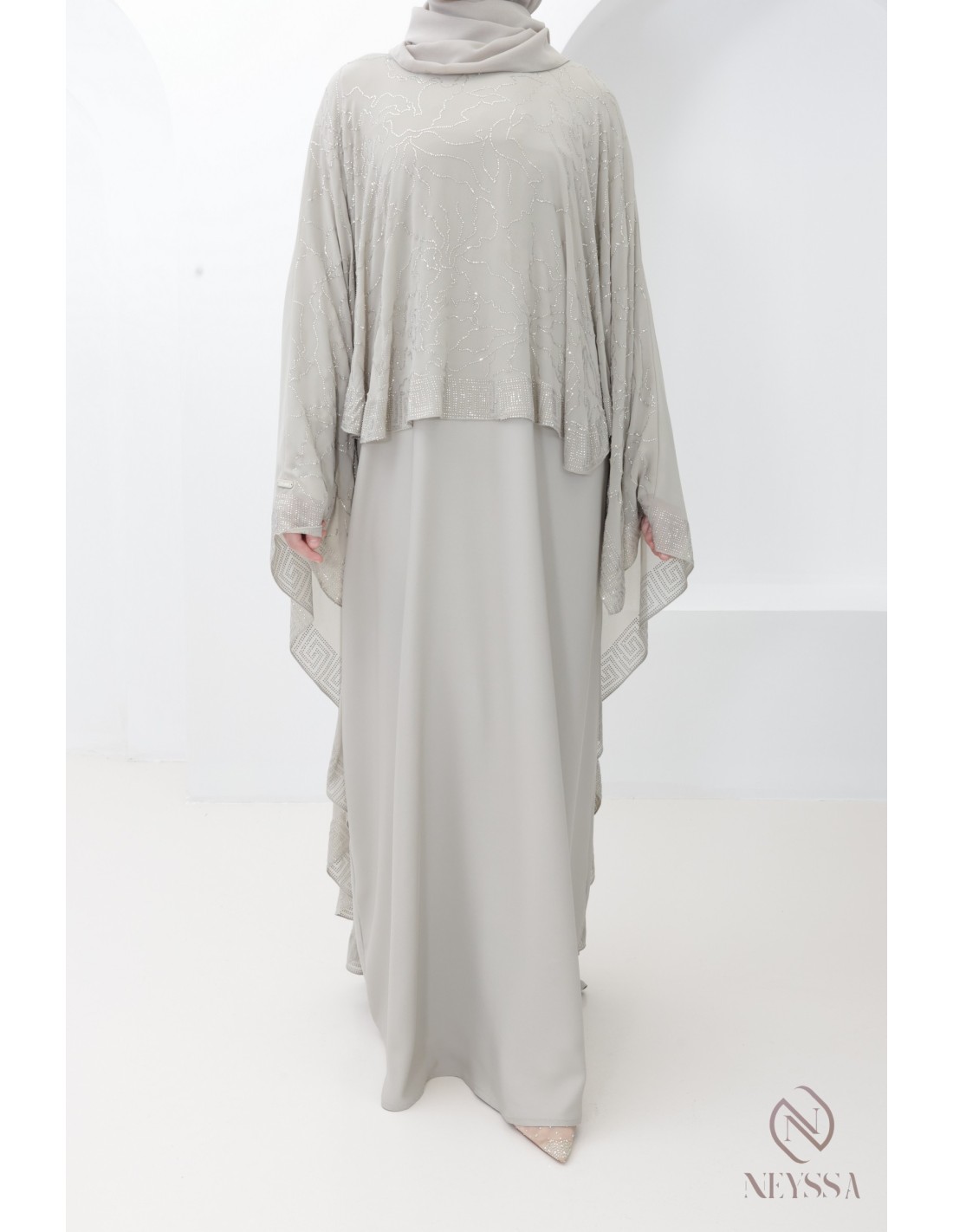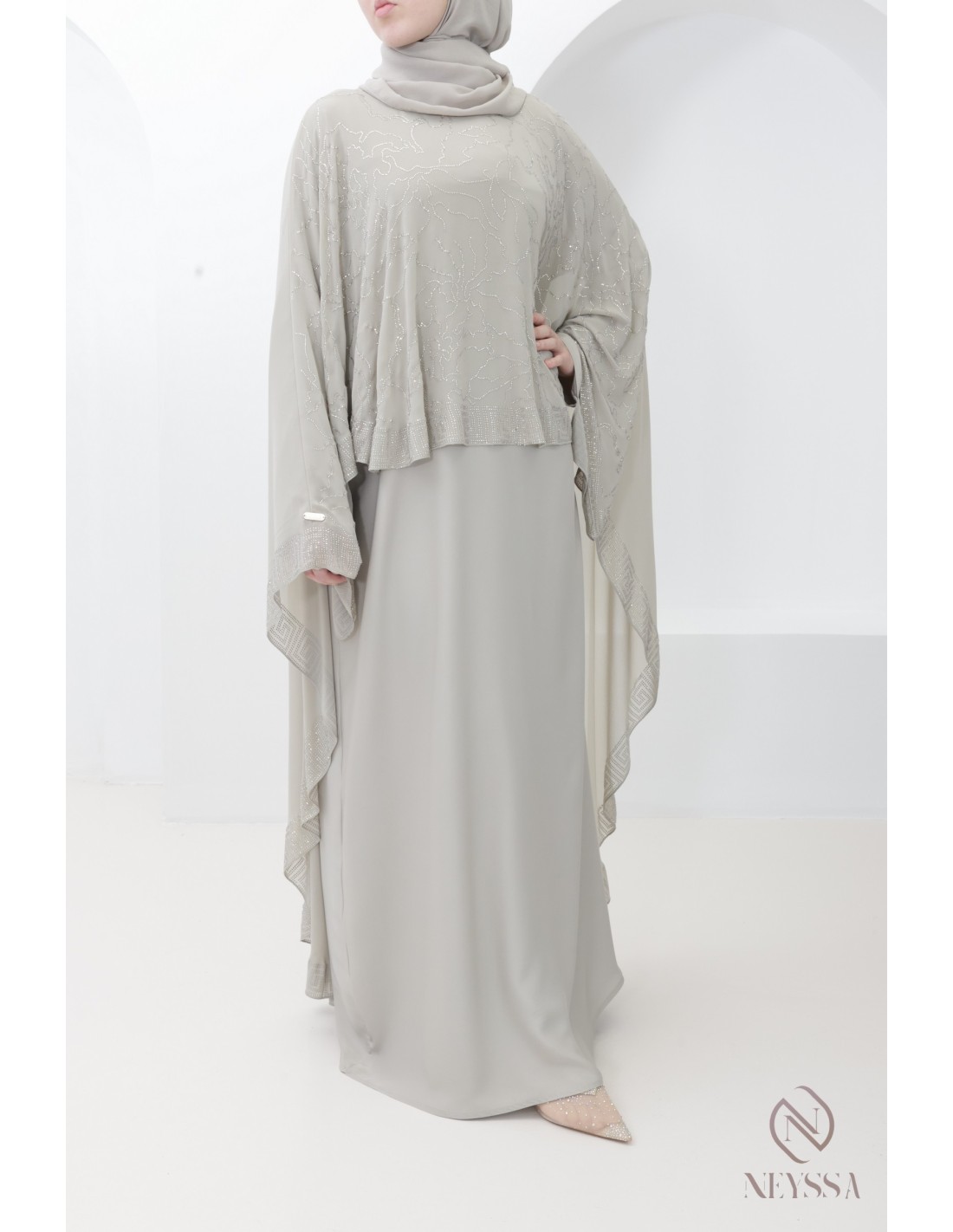 Luxuriöse Abaya Dubai in Greige mit Strasssteinen und Chiffon-Umhang