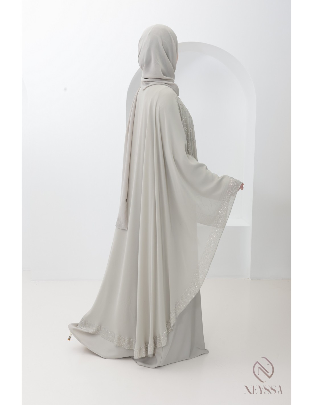 Abaya Dubai in Greige mit Strass-Umhang