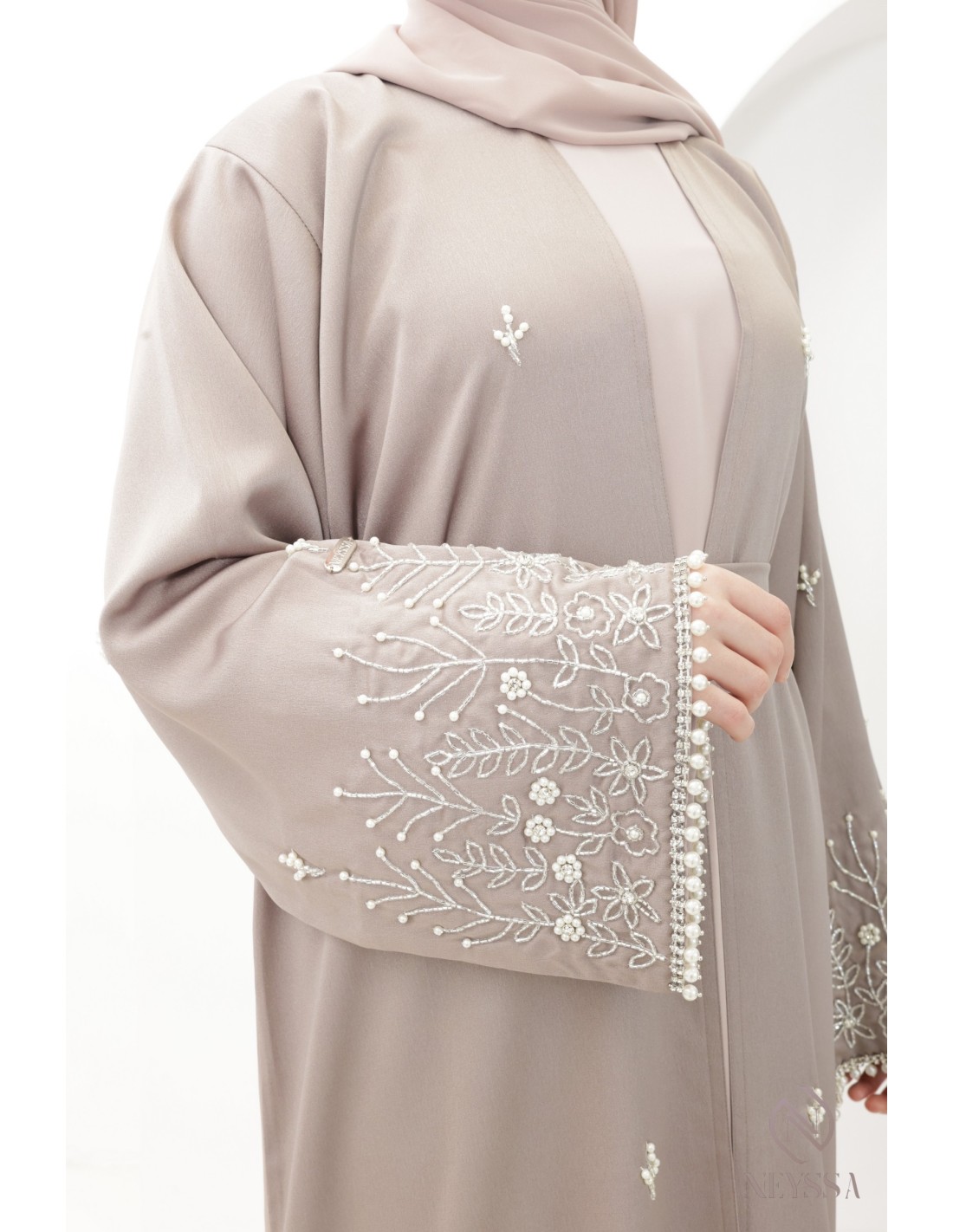 Abaya Dubai Kimono mit luxuriösen Perlenstickereien in Nude für Frauen, die ein Hijab tragen