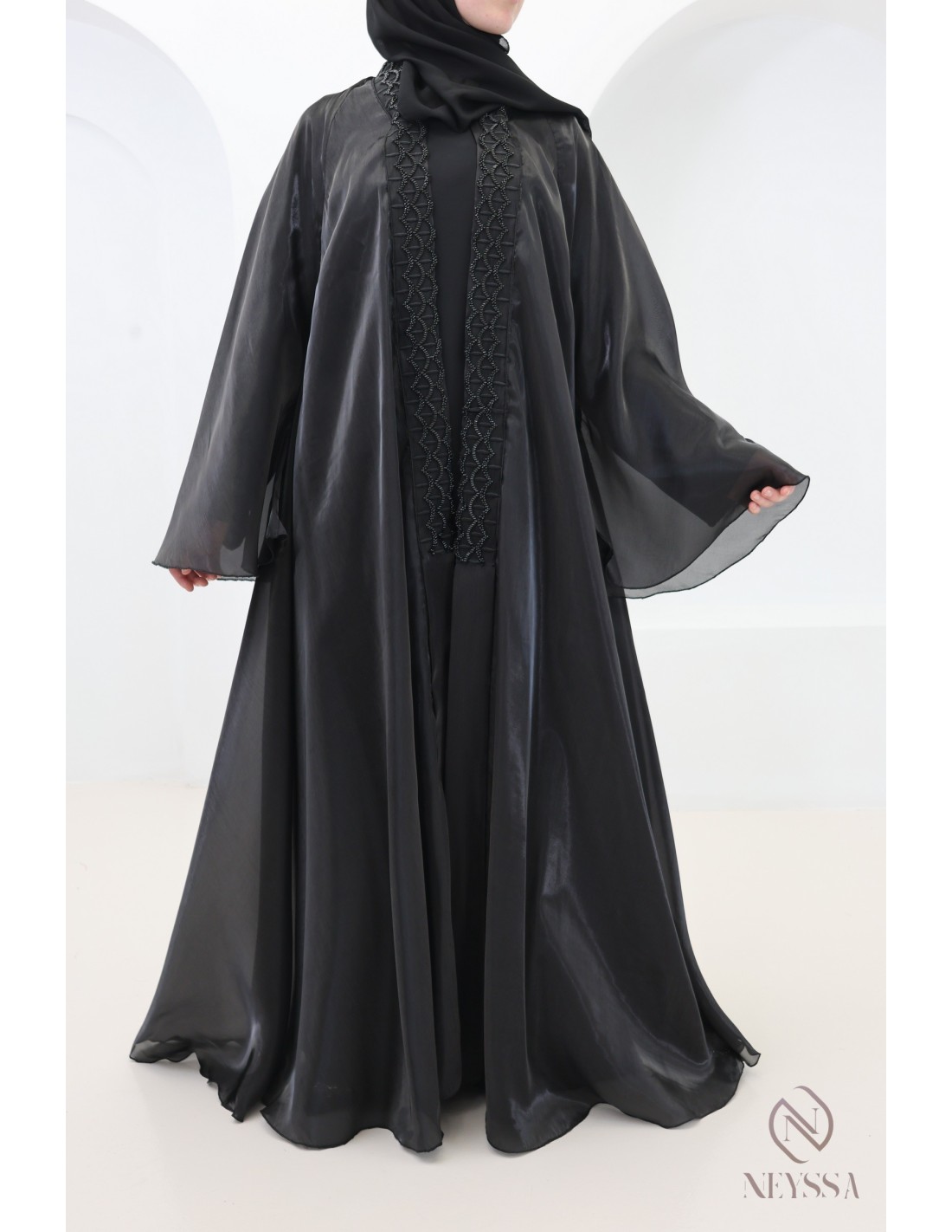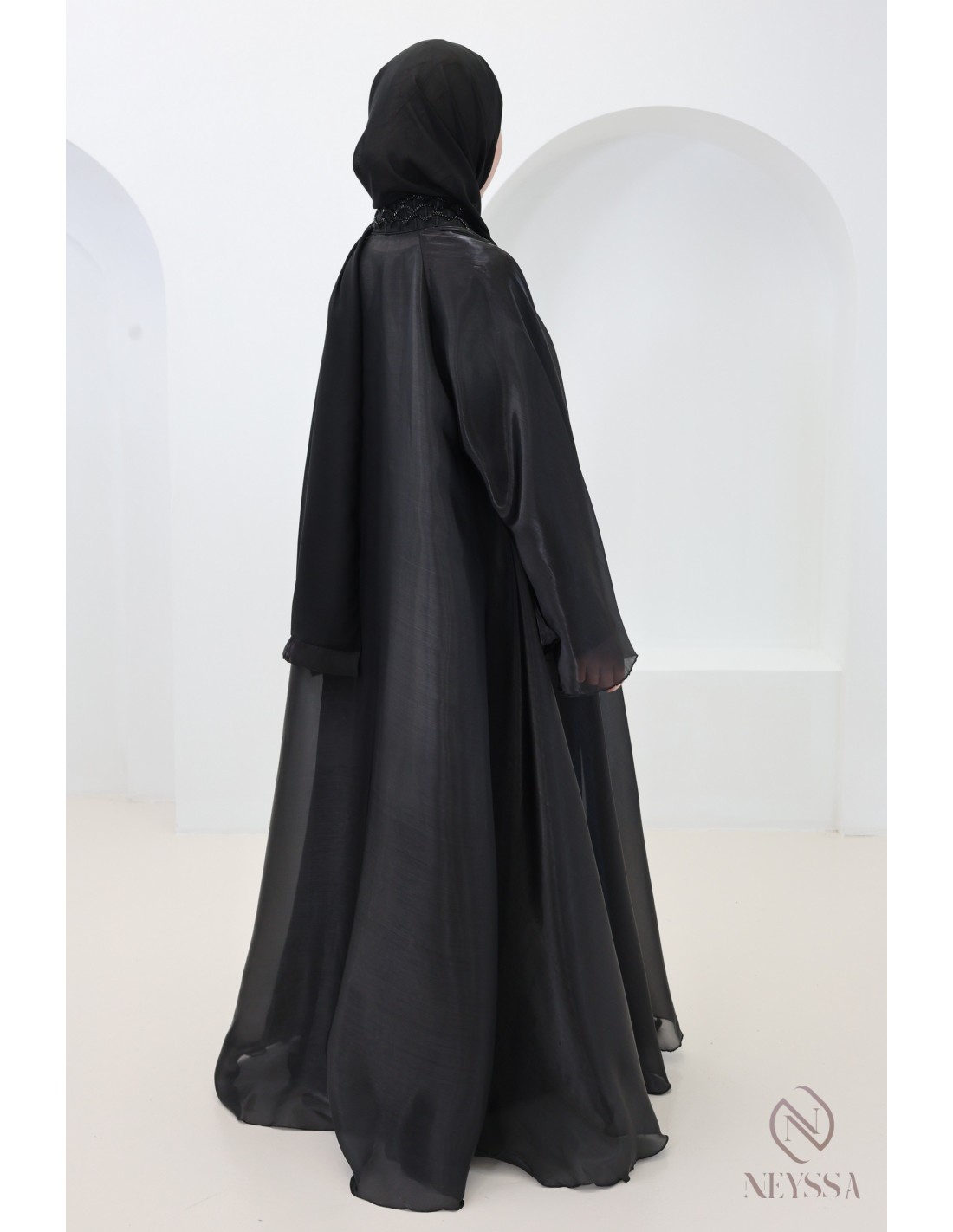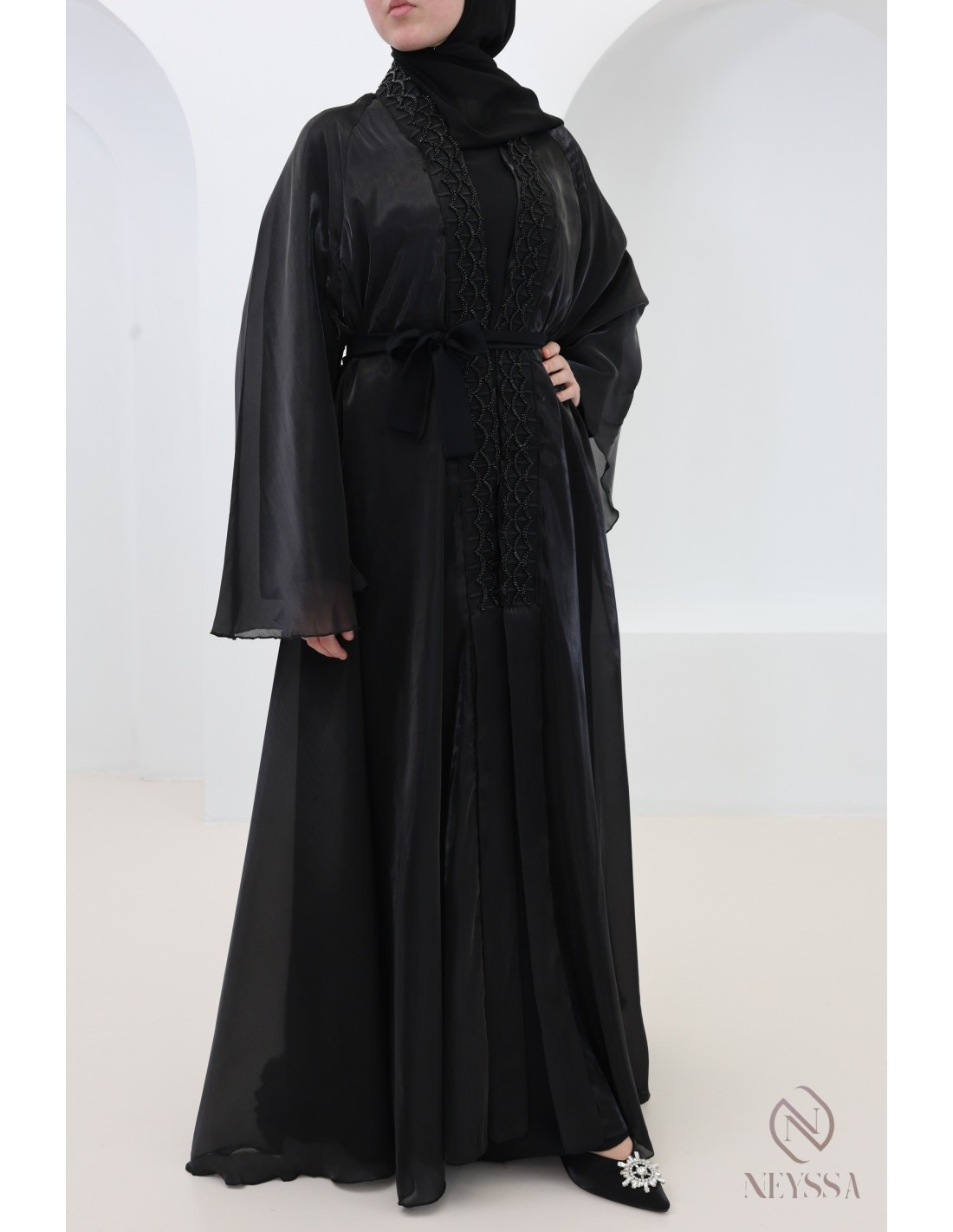 Abaya Kimono Dubai Organza schwarz mit Perlenverzierung