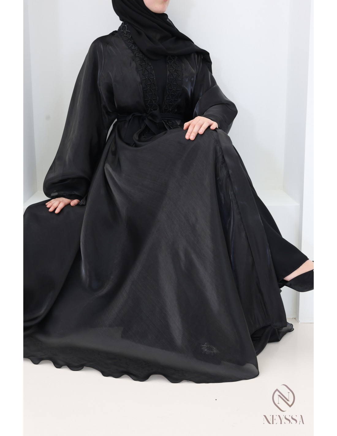Abaya Dubai Kimono Organza Satin schwarz mit Perlenverzierung, ausgestellter Schnitt: Eid-Outfit