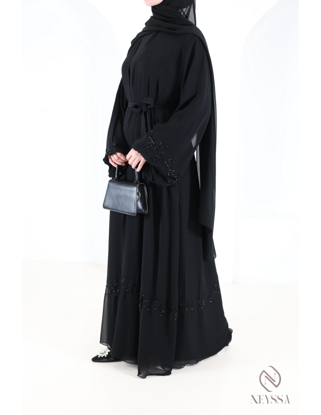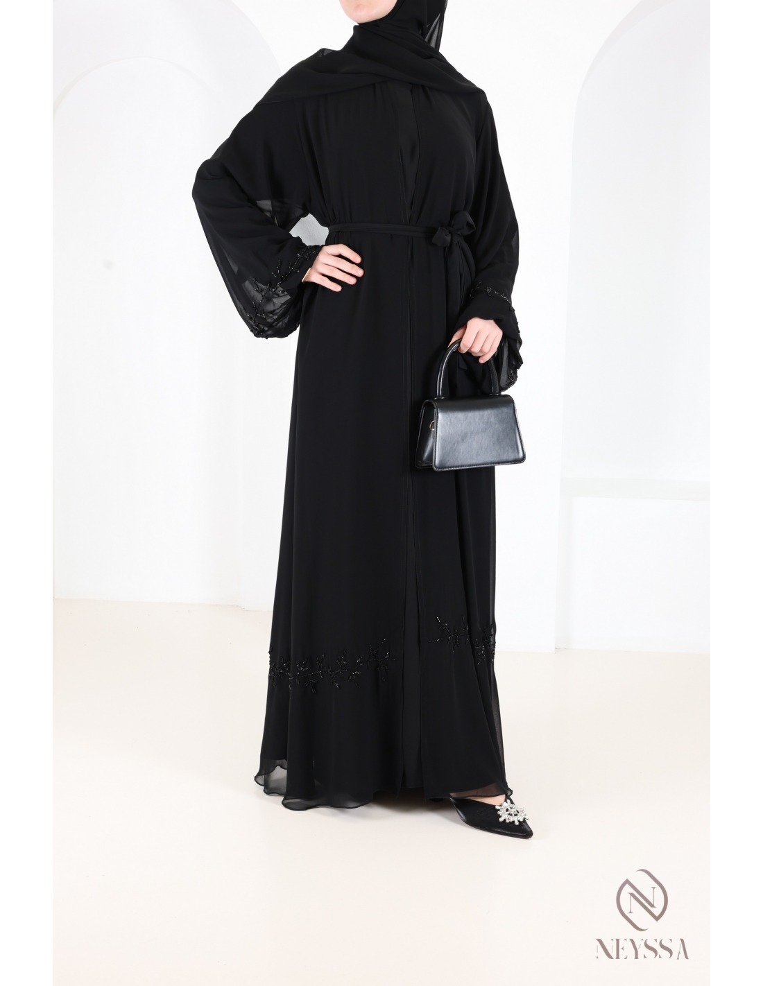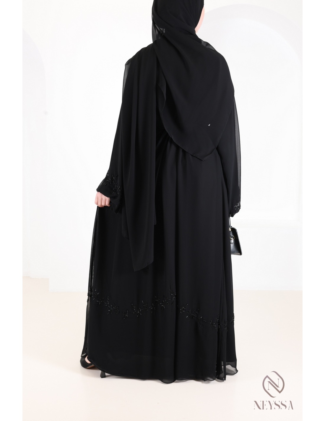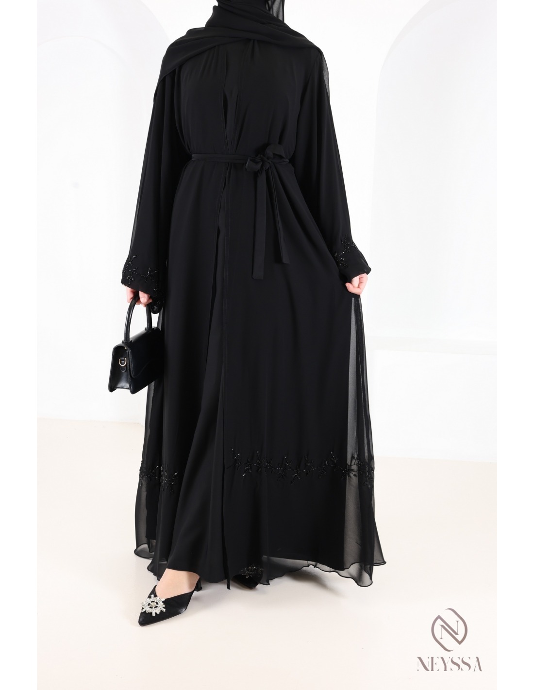 Eine prächtige Abaya aus Musselin mit zarten, handgenähten Perlenverzierungen.