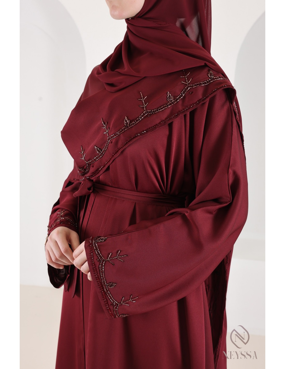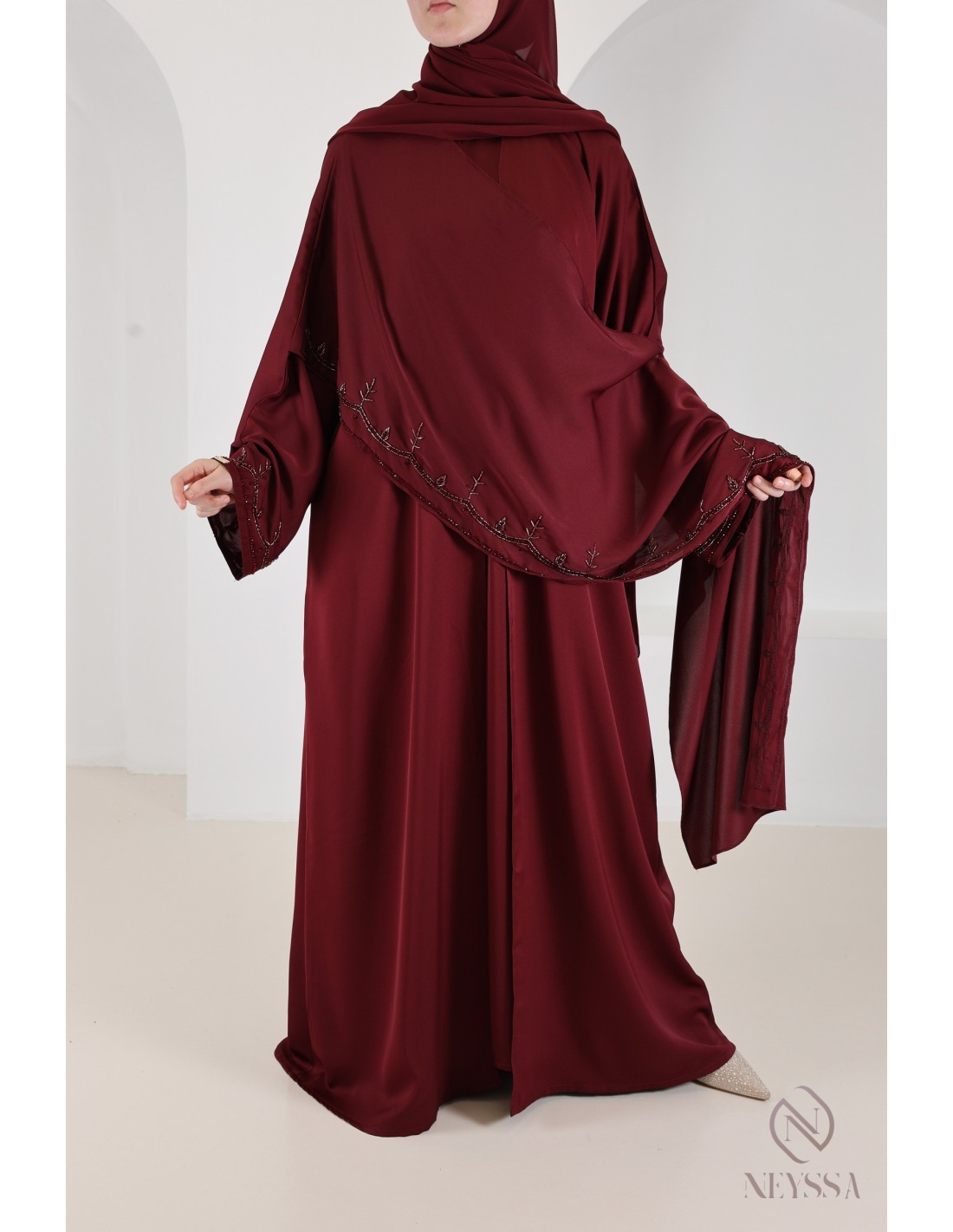 Dubai-Abaya-Kimono mit burgunderrotem, perlenbesetztem Nidah-Cape