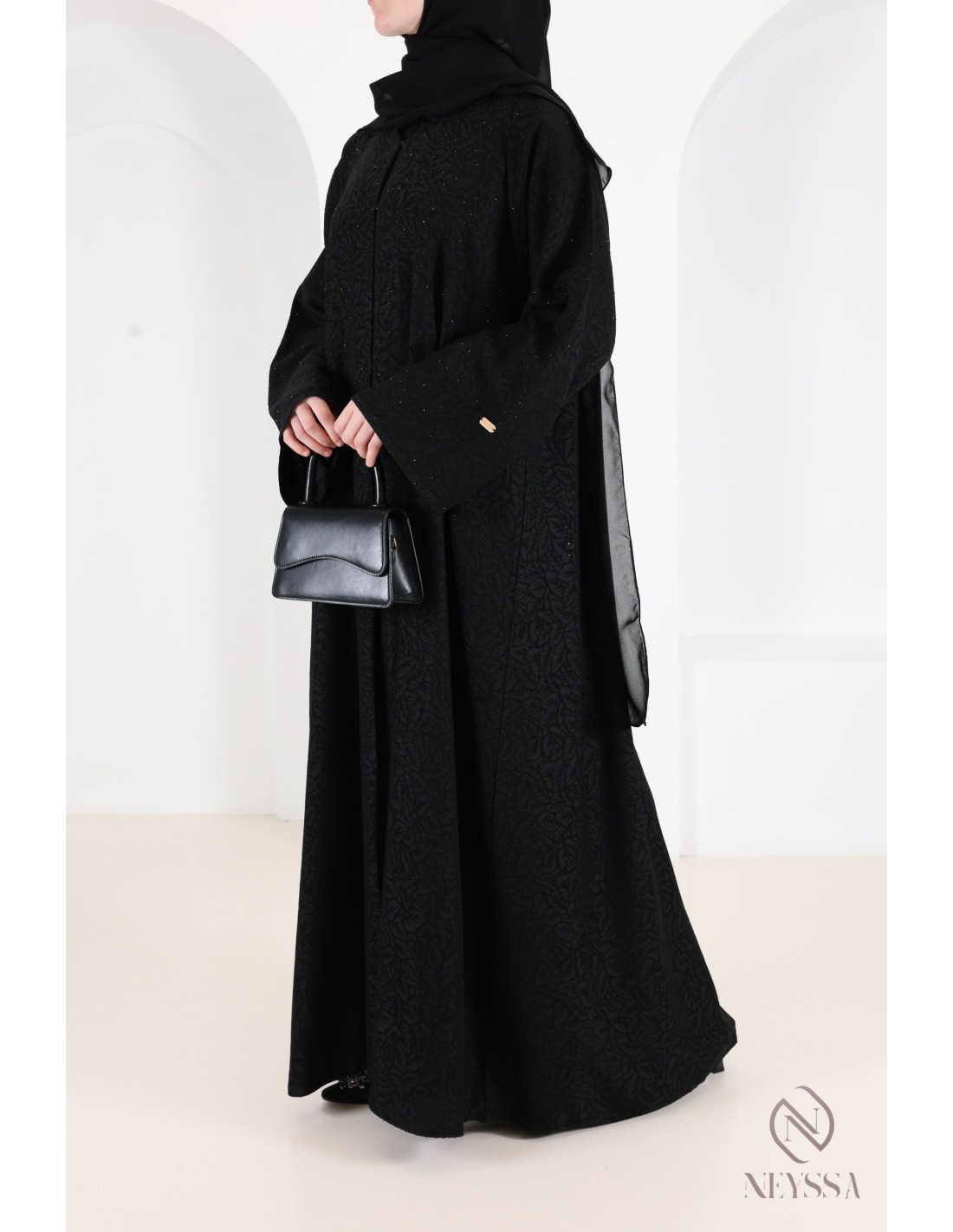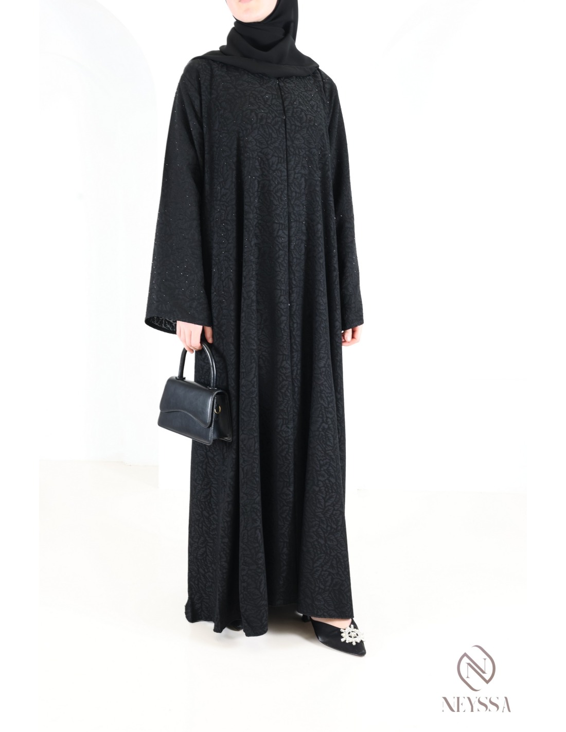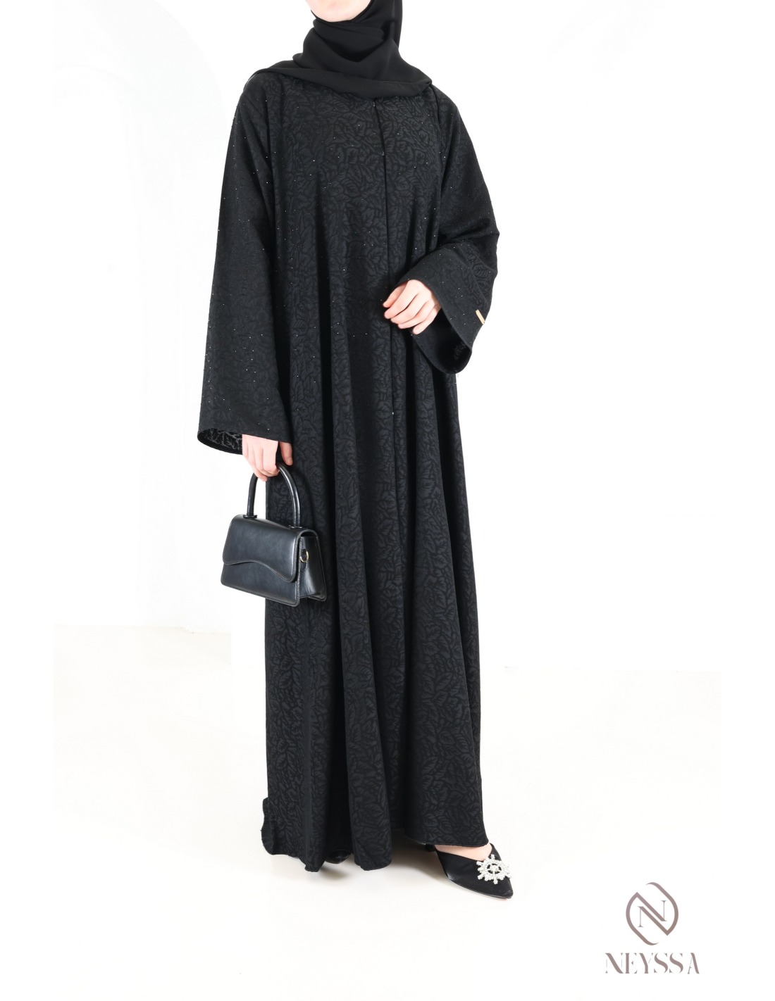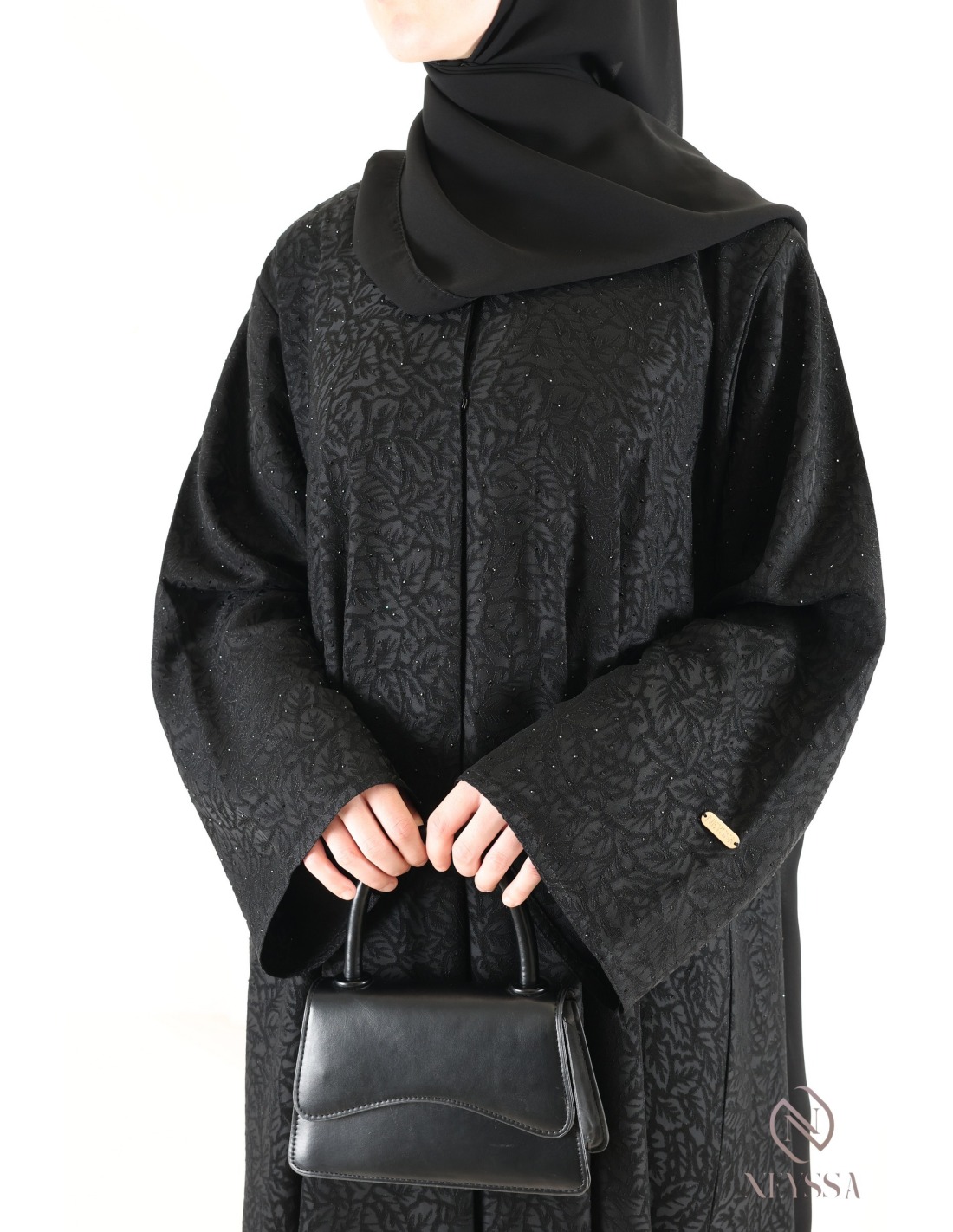 Hier ist diese prachtvolle schwarze Brokat-Abaya mit Stickerei und raffinierten Details.