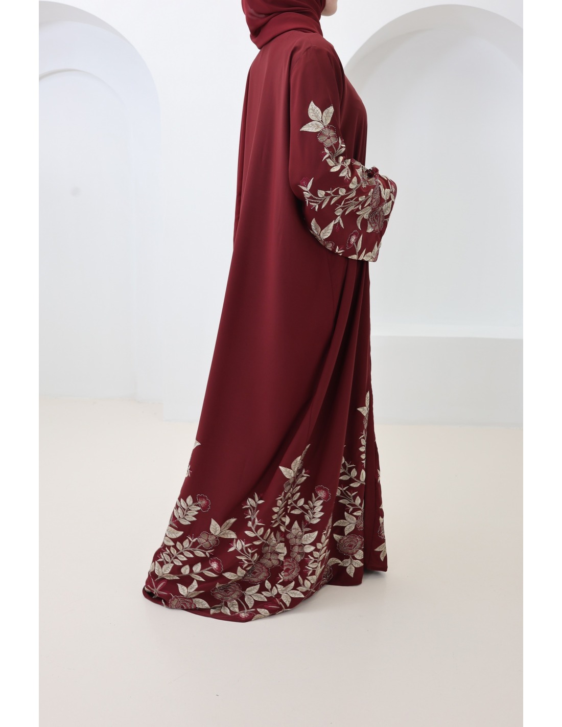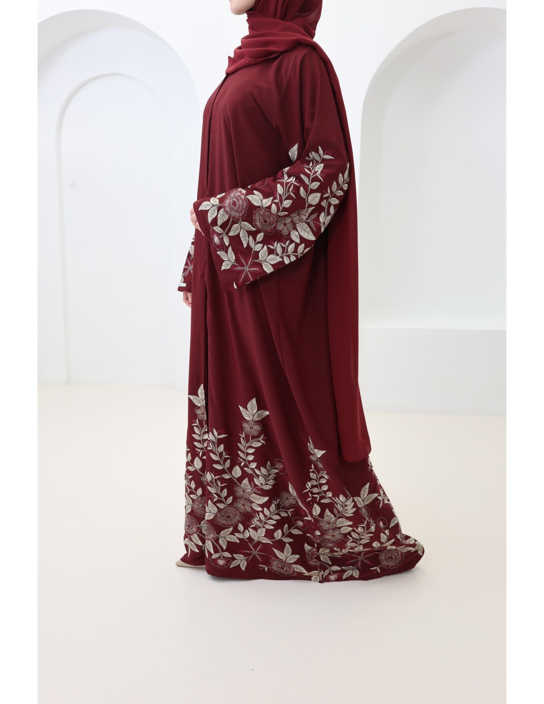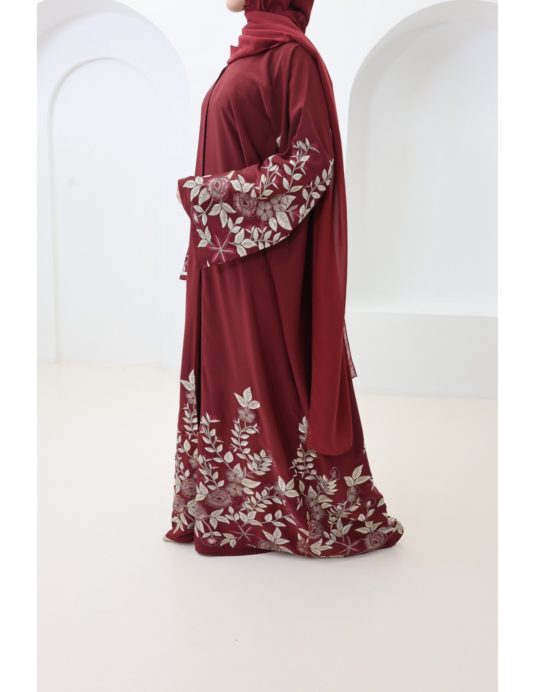 Dubai-Kimono-Abaya mit floraler Stickerei und burgunderroten Strasssteinen : ein elegantes Outfit für Eid