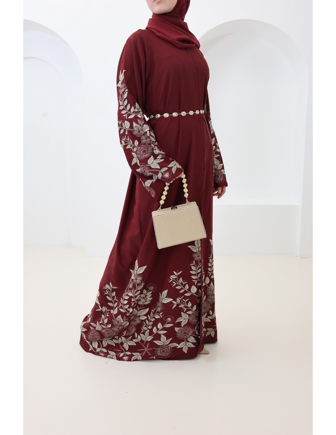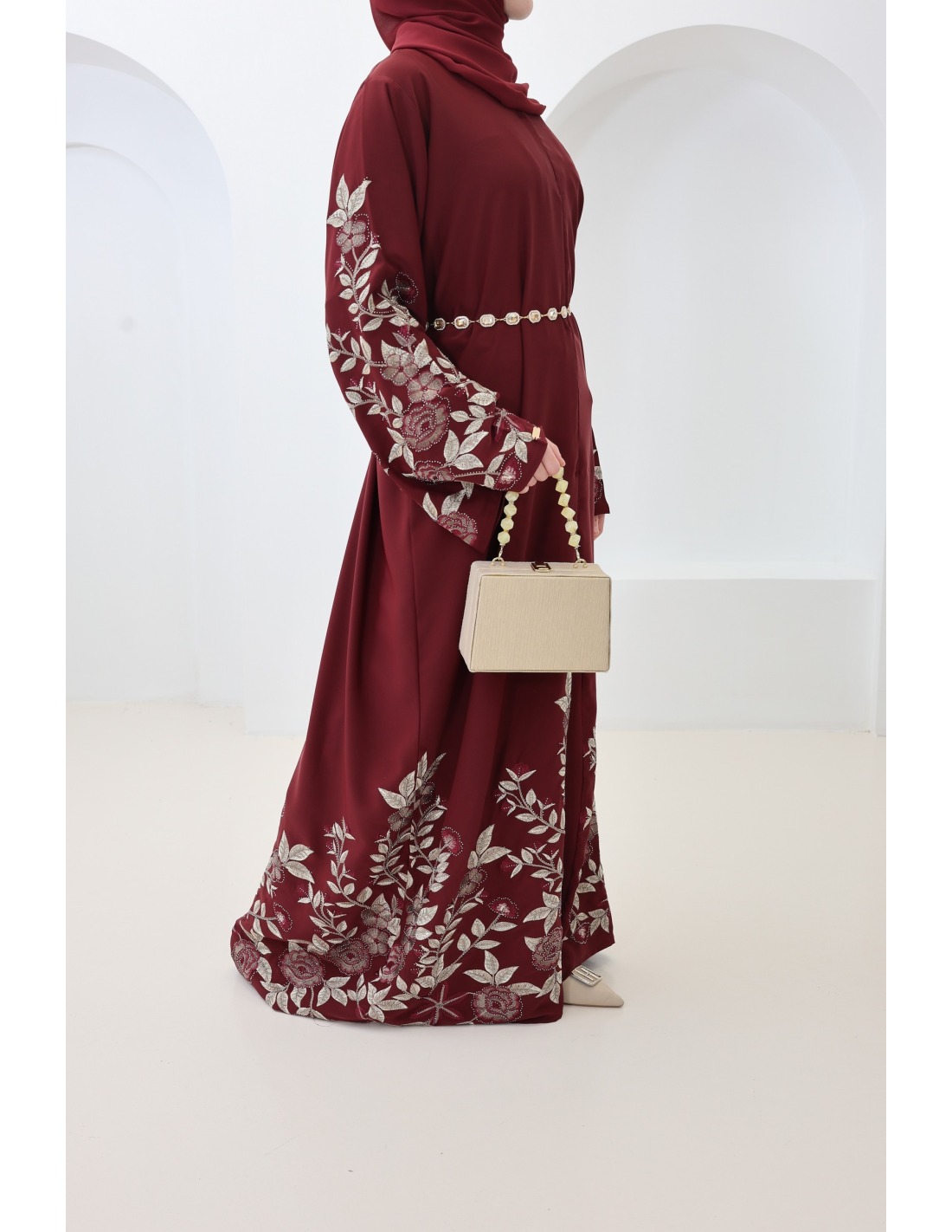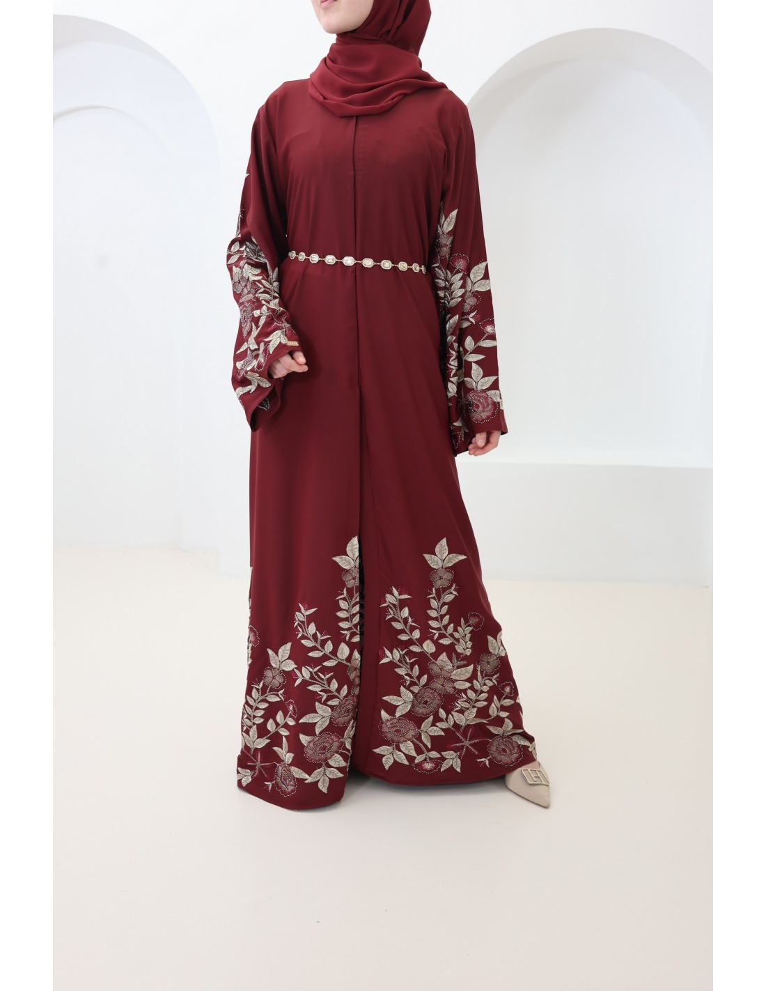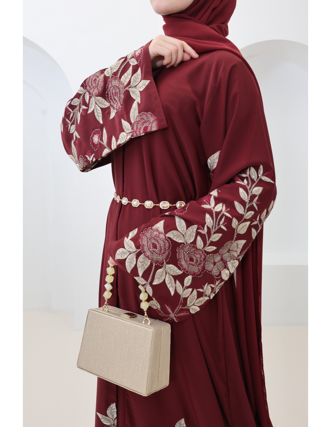 Dubai-Kimono-Abaya mit floraler Stickerei und burgunderroten Strasssteinen : ein elegantes Outfit für Eid