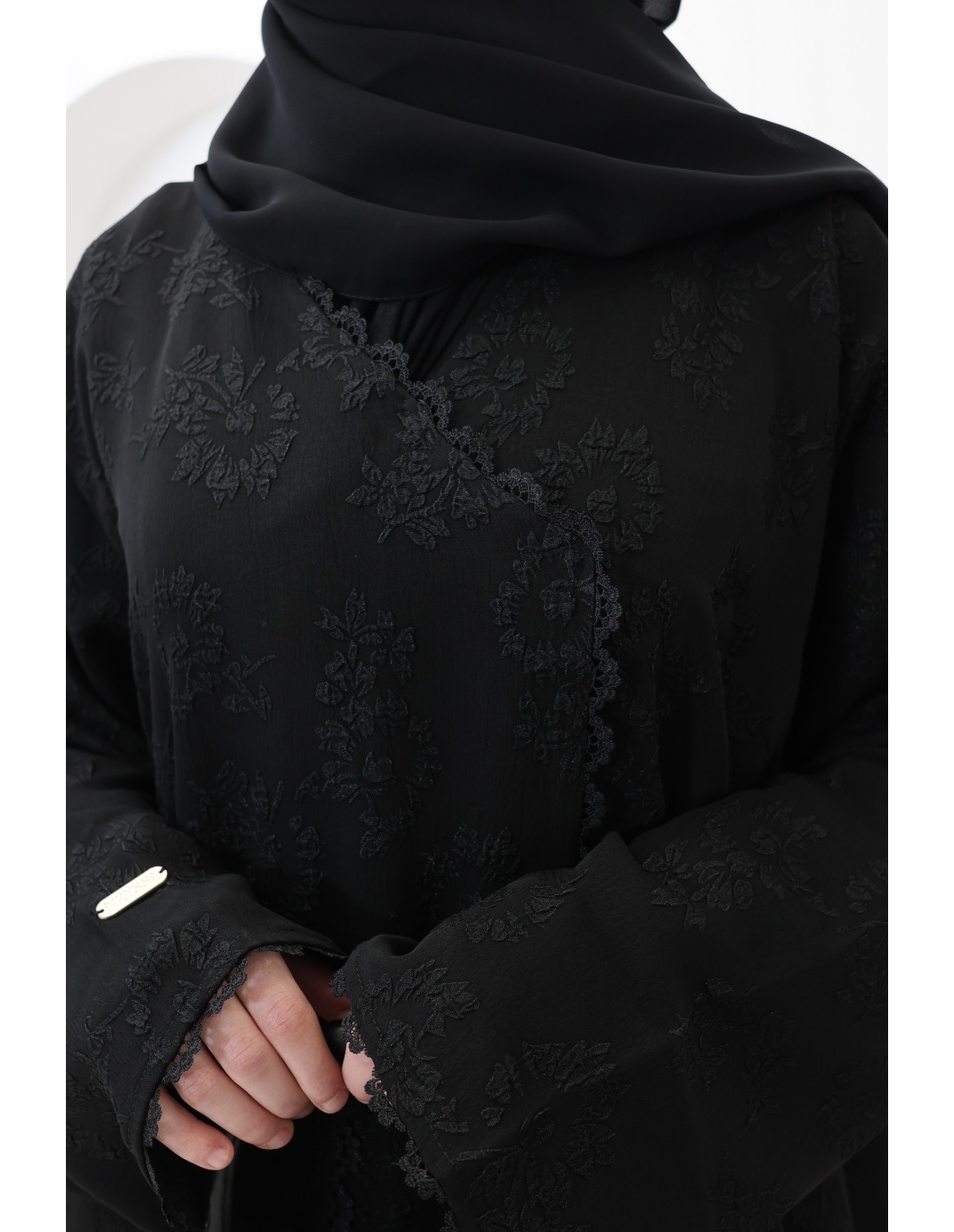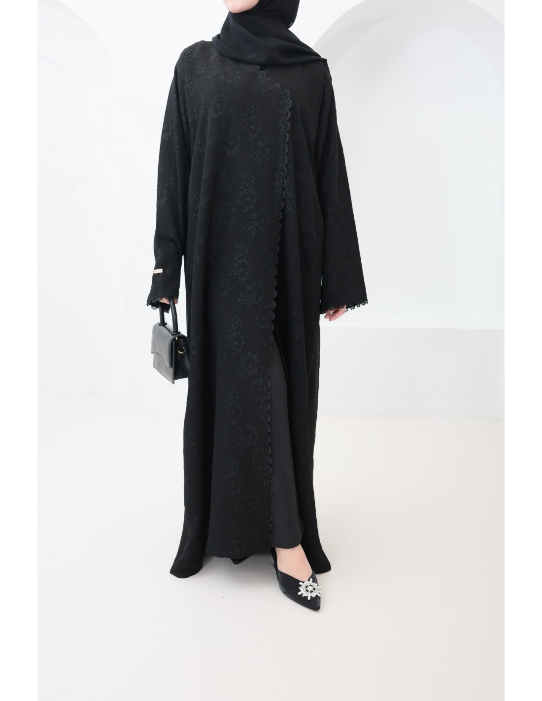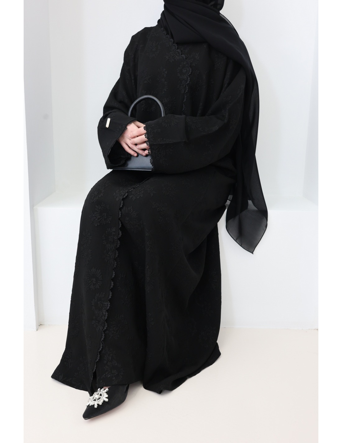 Hier ist diese prachtvolle schwarze Brokat-Abaya mit Stickerei und raffinierten Details.