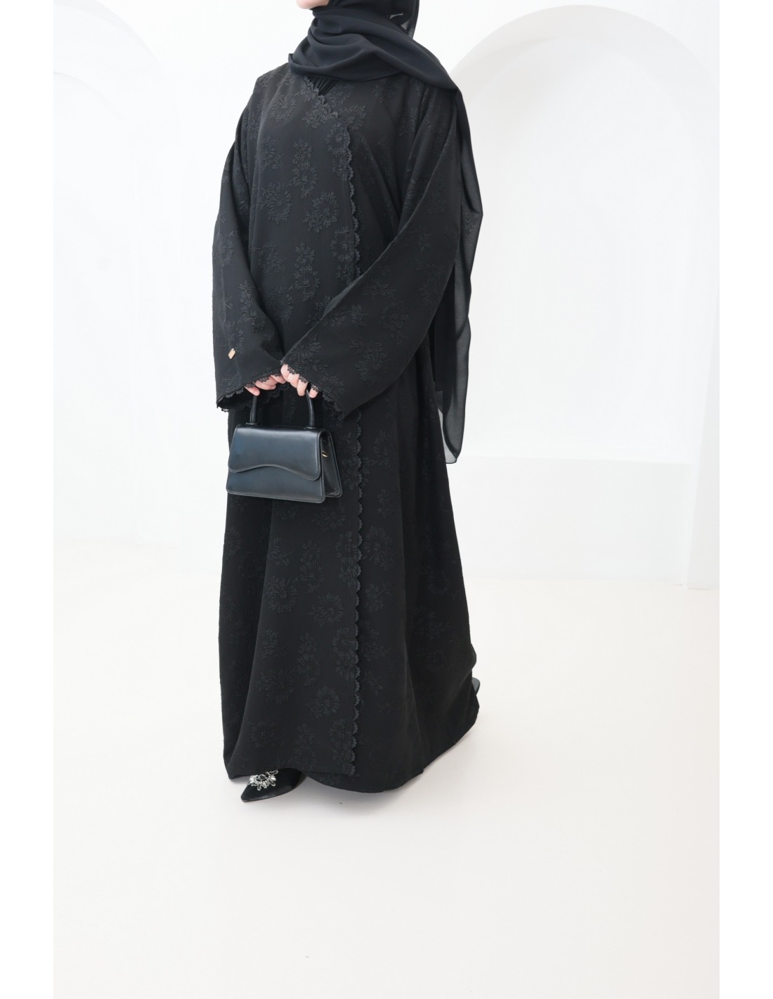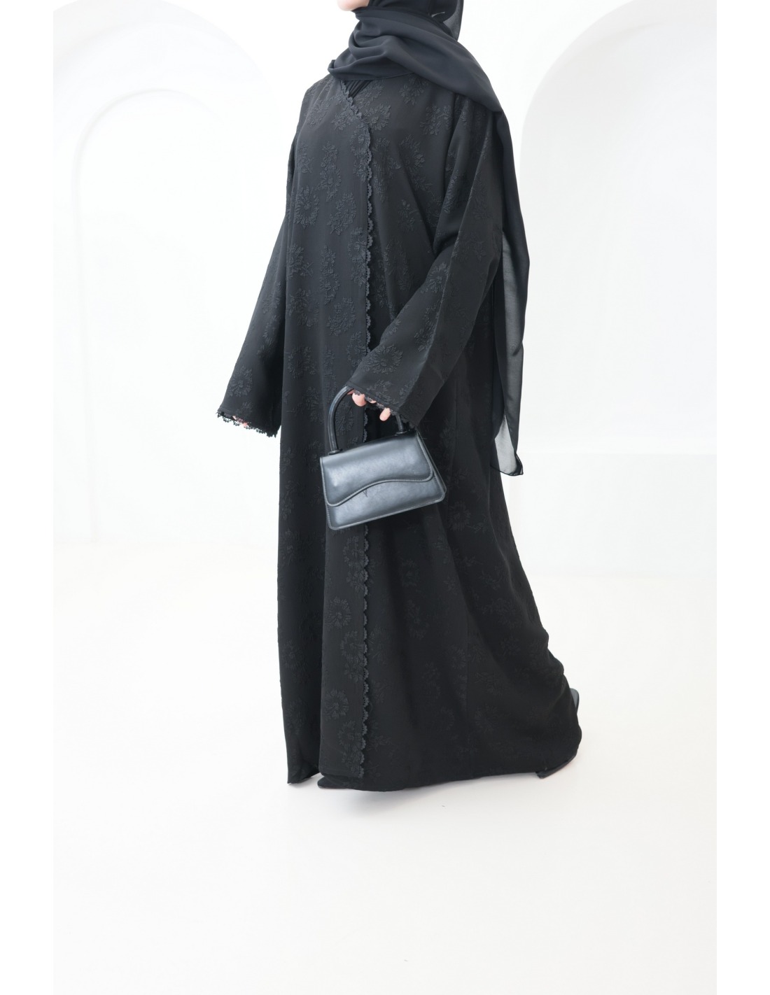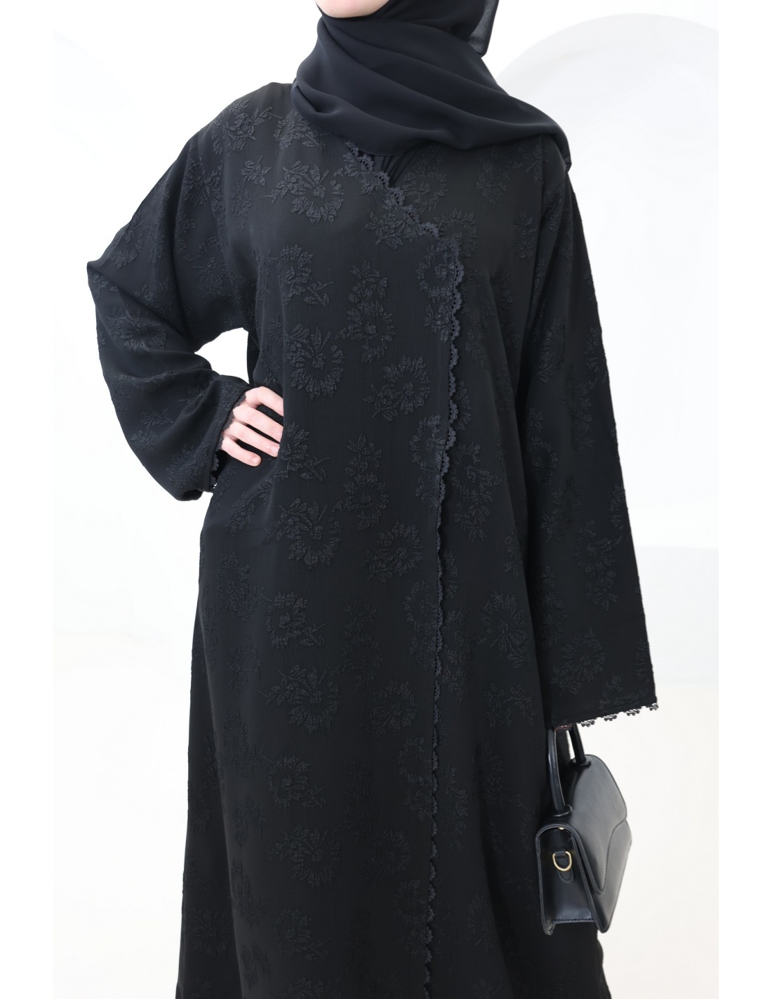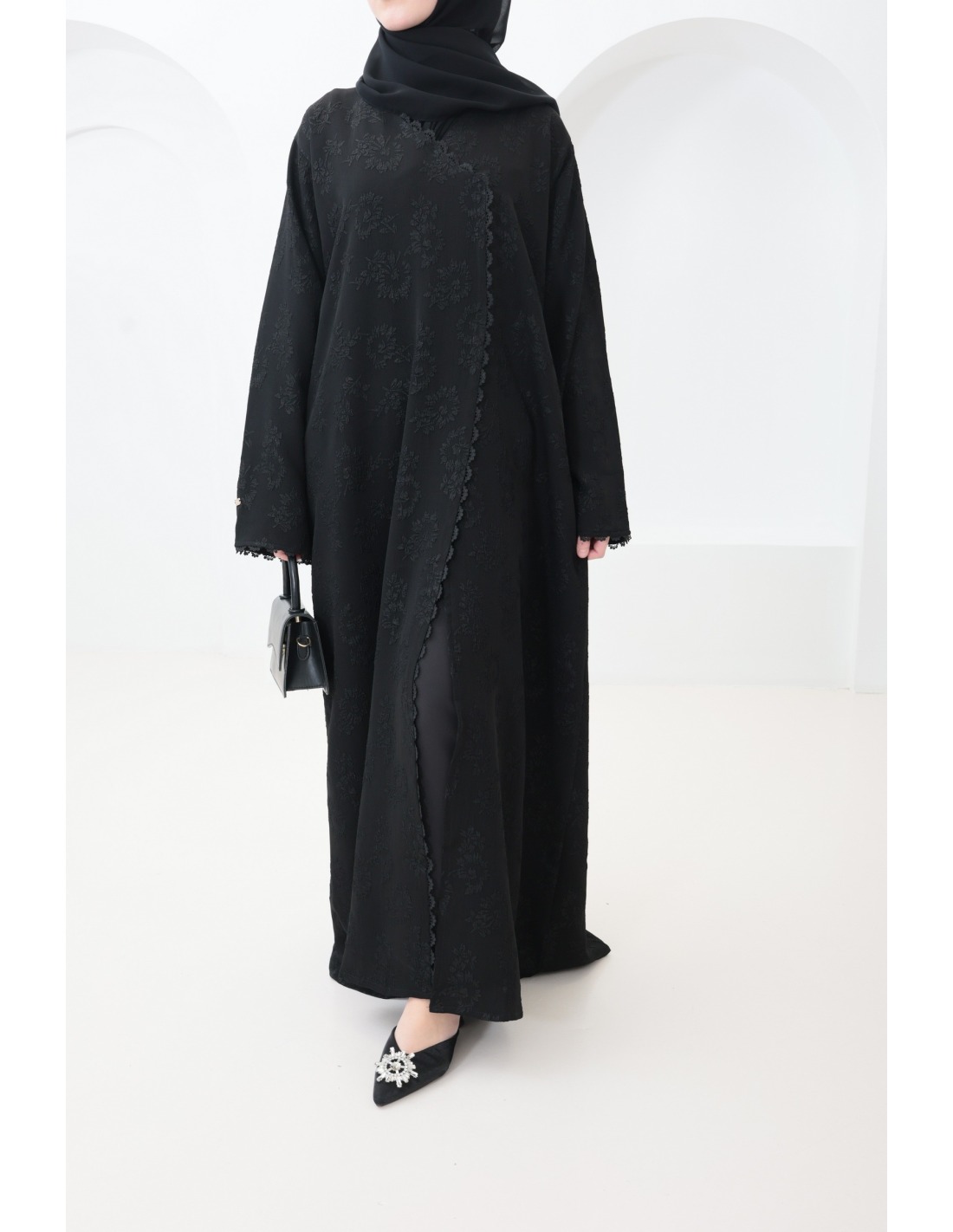 Hier ist diese prachtvolle schwarze Brokat-Abaya mit Stickerei und raffinierten Details.