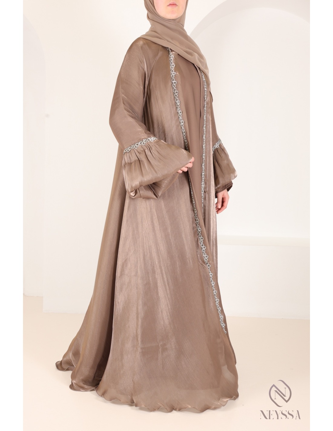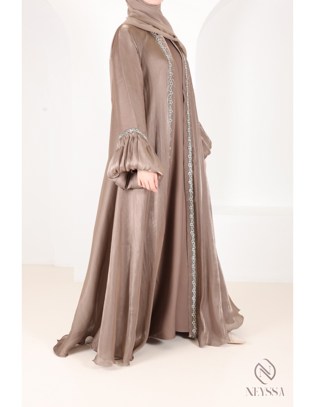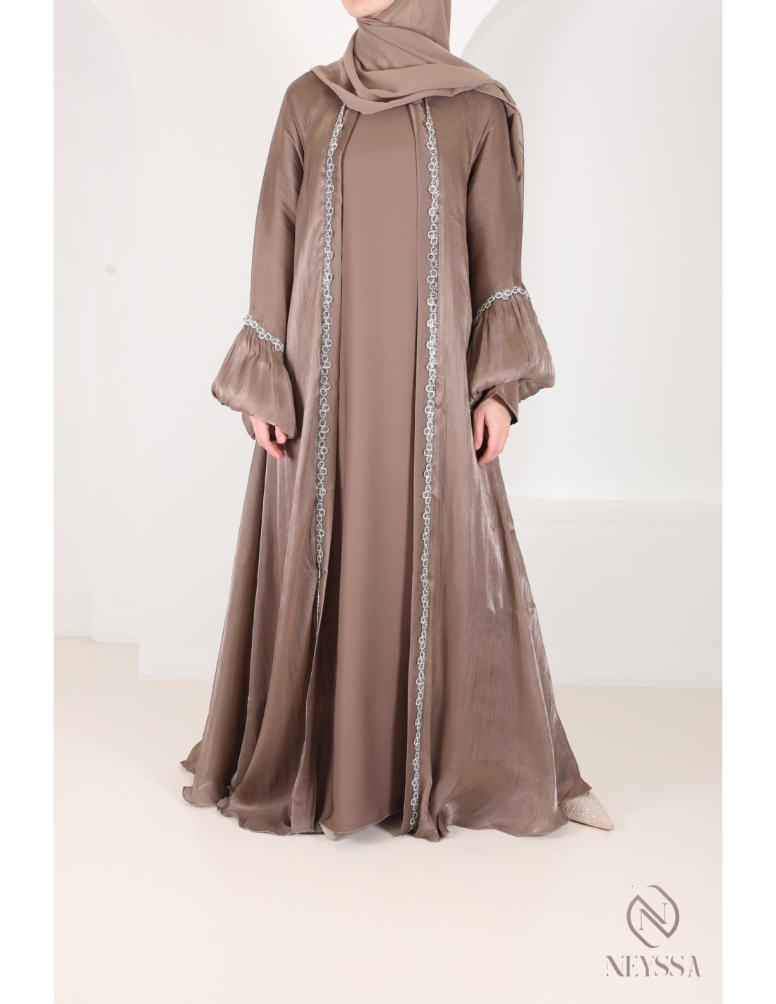 Abaya Dubai Organza glänzend taupe, Outfit-Idee für das Eid-Fest
