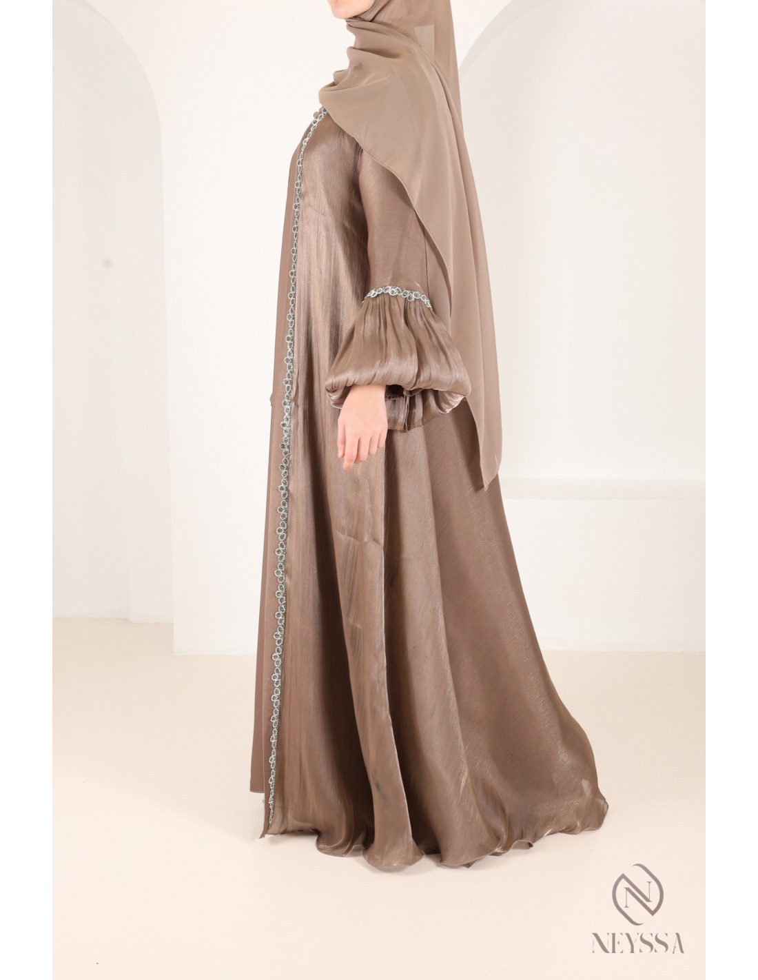 Mit diesem wunderschönen Abaya-Outfit werden Sie an Ihrem großen Tag garantiert strahlen! Die Neyssa-Konfektion stellt eine perfekte Kombination aus Eleganz und Raffinesse dar. Diese Abaya von außergewöhnlicher Qualität wird in unseren Werkstätten in Dubai sorgfältig hergestellt und versprüht einen unvergleichlichen Charme.