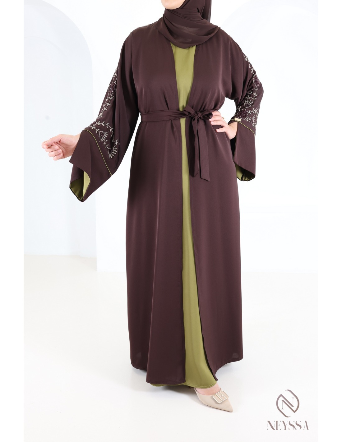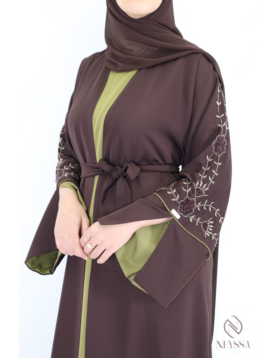 Abaya Dubai Kimono Schokoladenbraun Dubai mit Perlenverzierung