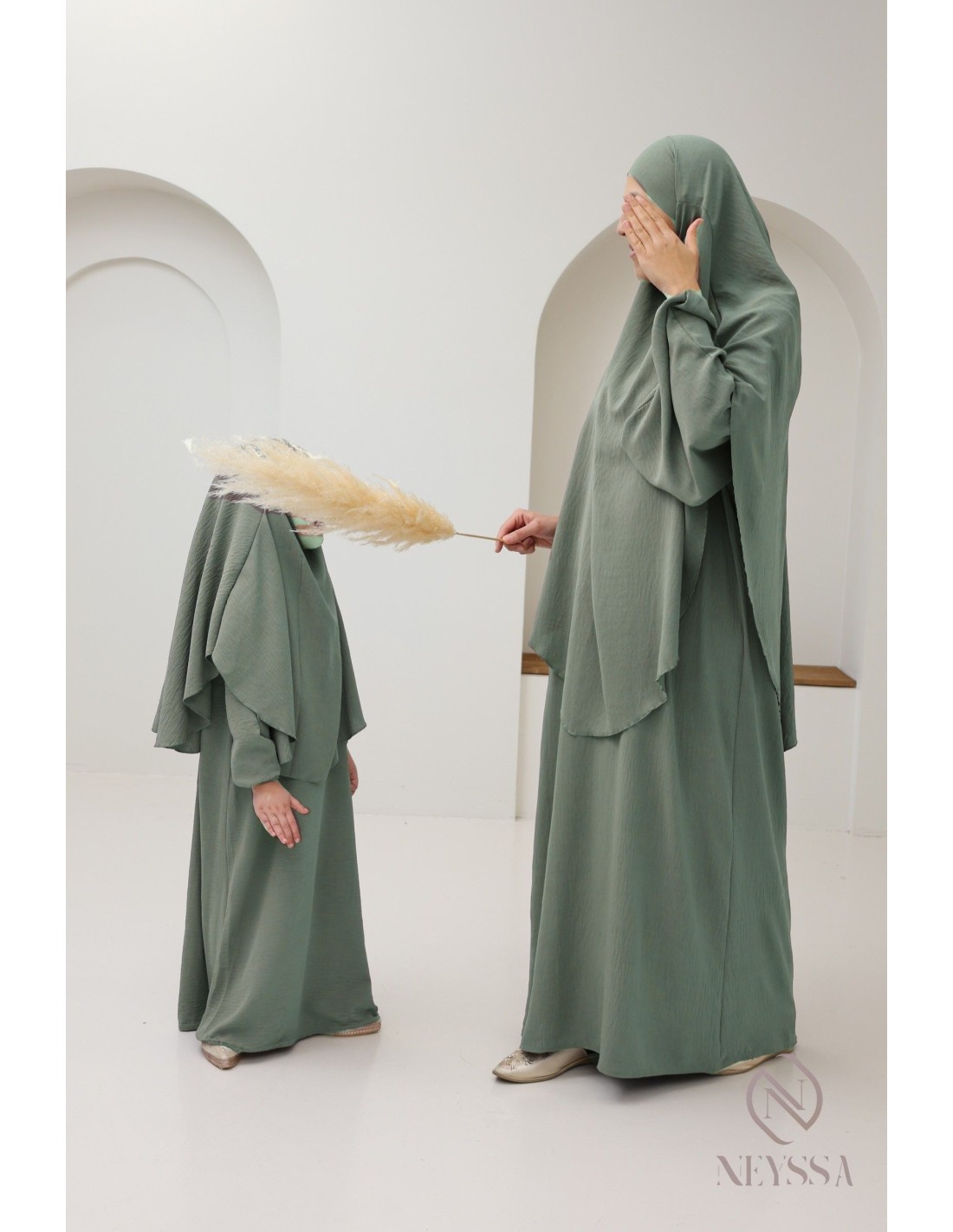 Set Lange Abaya mit Khimar mit Jazzspitze Khaki Duo Mutter/Tochter: Gebetskleidung