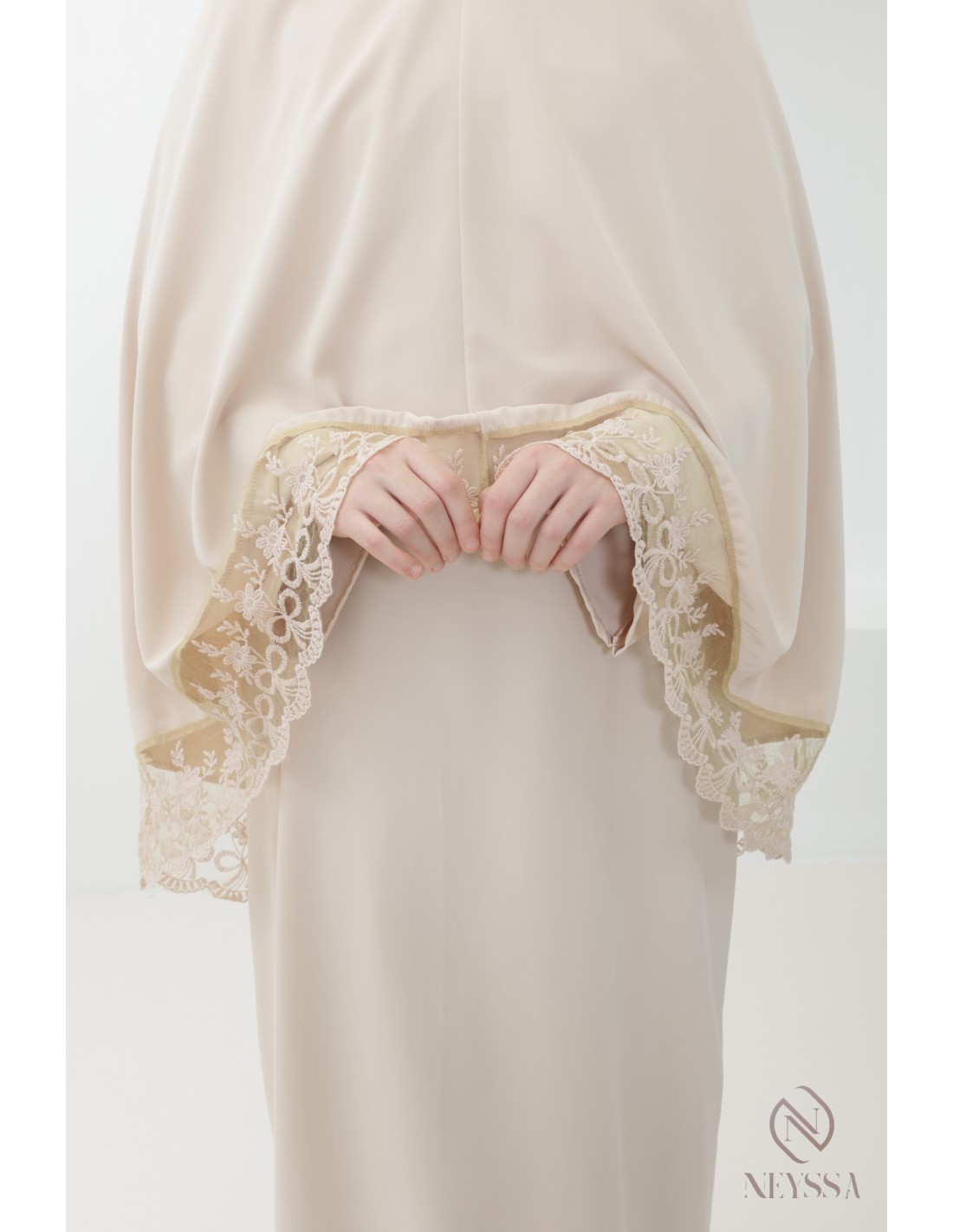 Diese Abaya-Khimar aus Medina-Seide wird Ihnen dank ihrer Spitzenstickereien zweifellos gefallen: