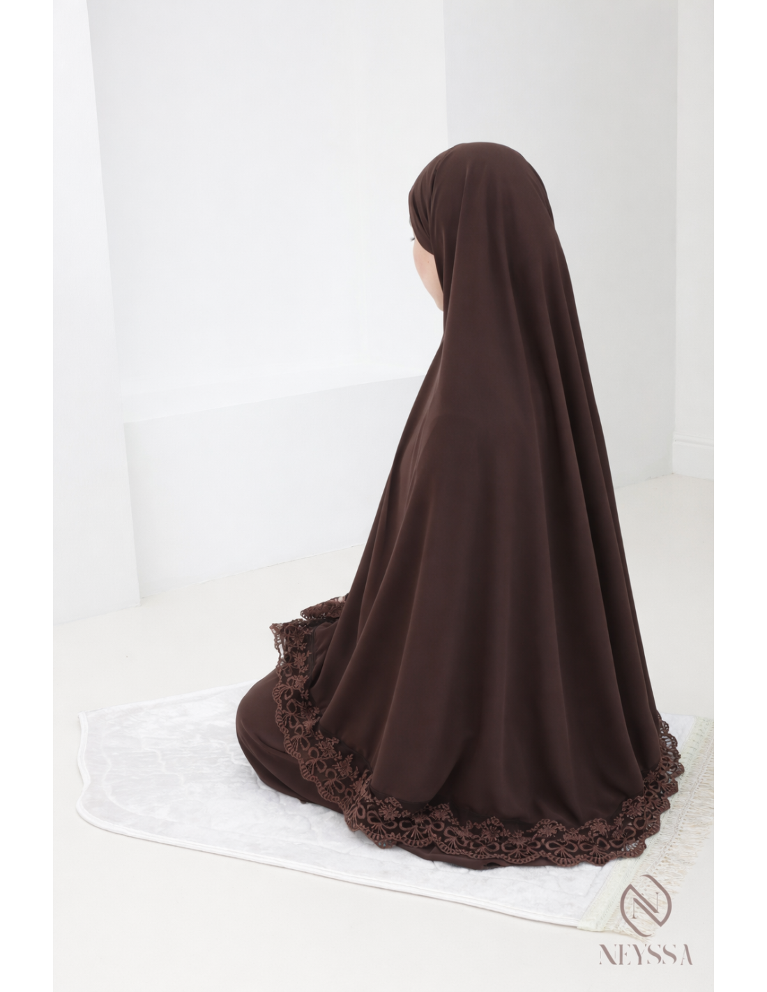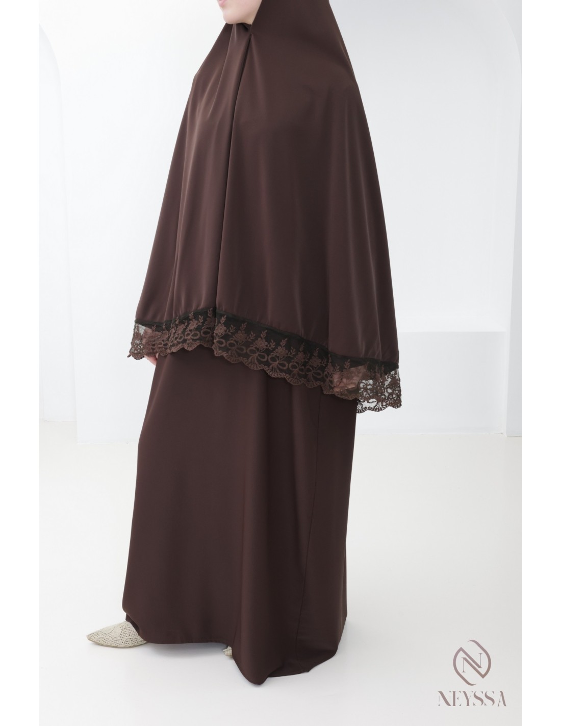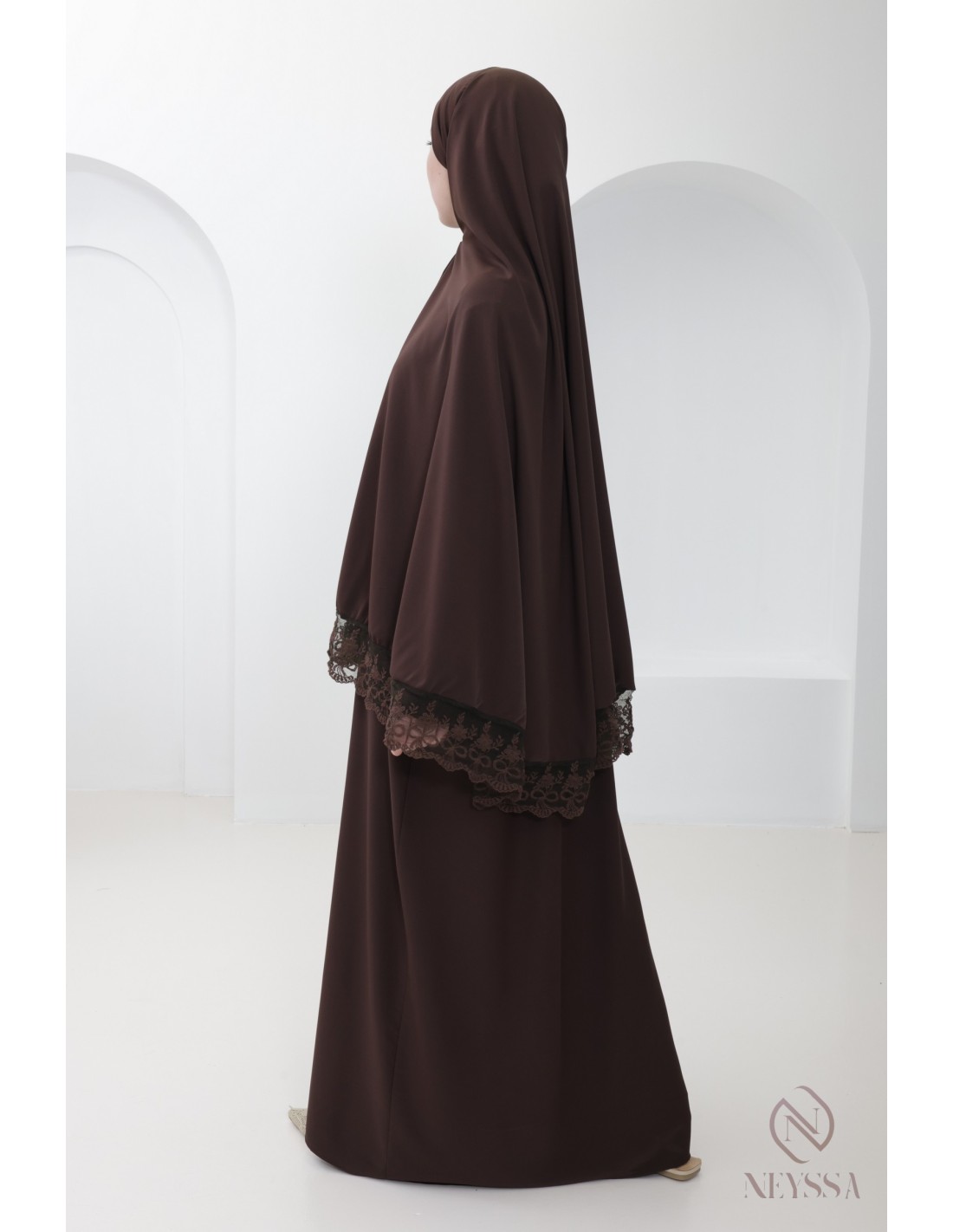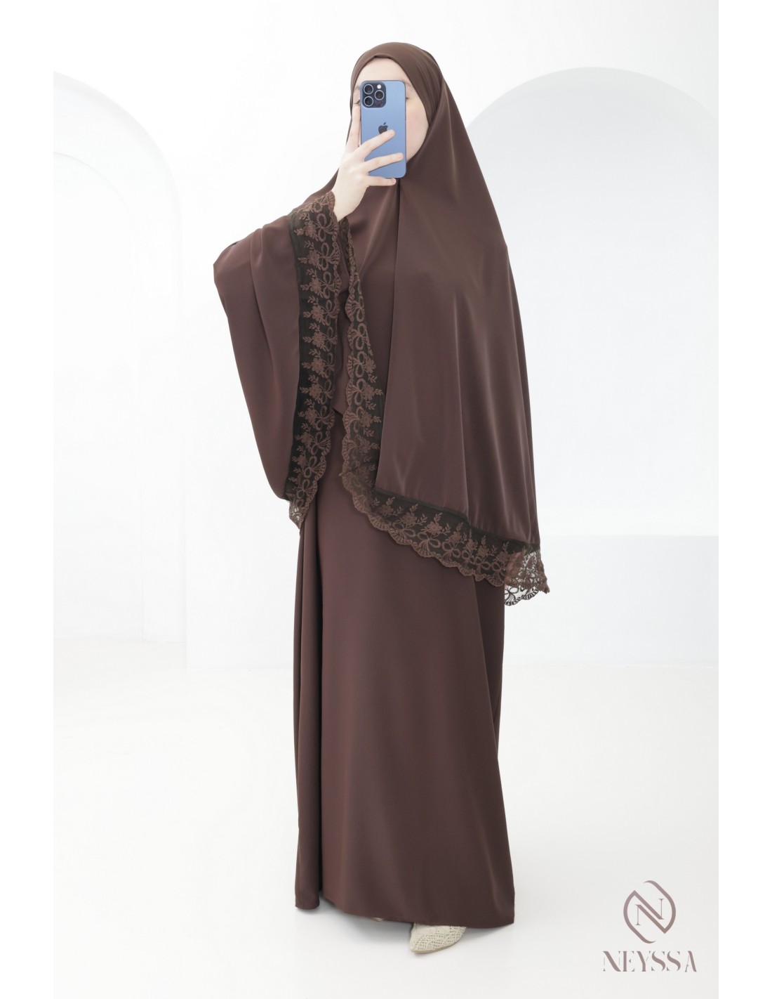 Diese Abaya-Khimar aus Medina-Seide wird Ihnen dank ihrer Spitzenstickereien zweifellos gefallen: