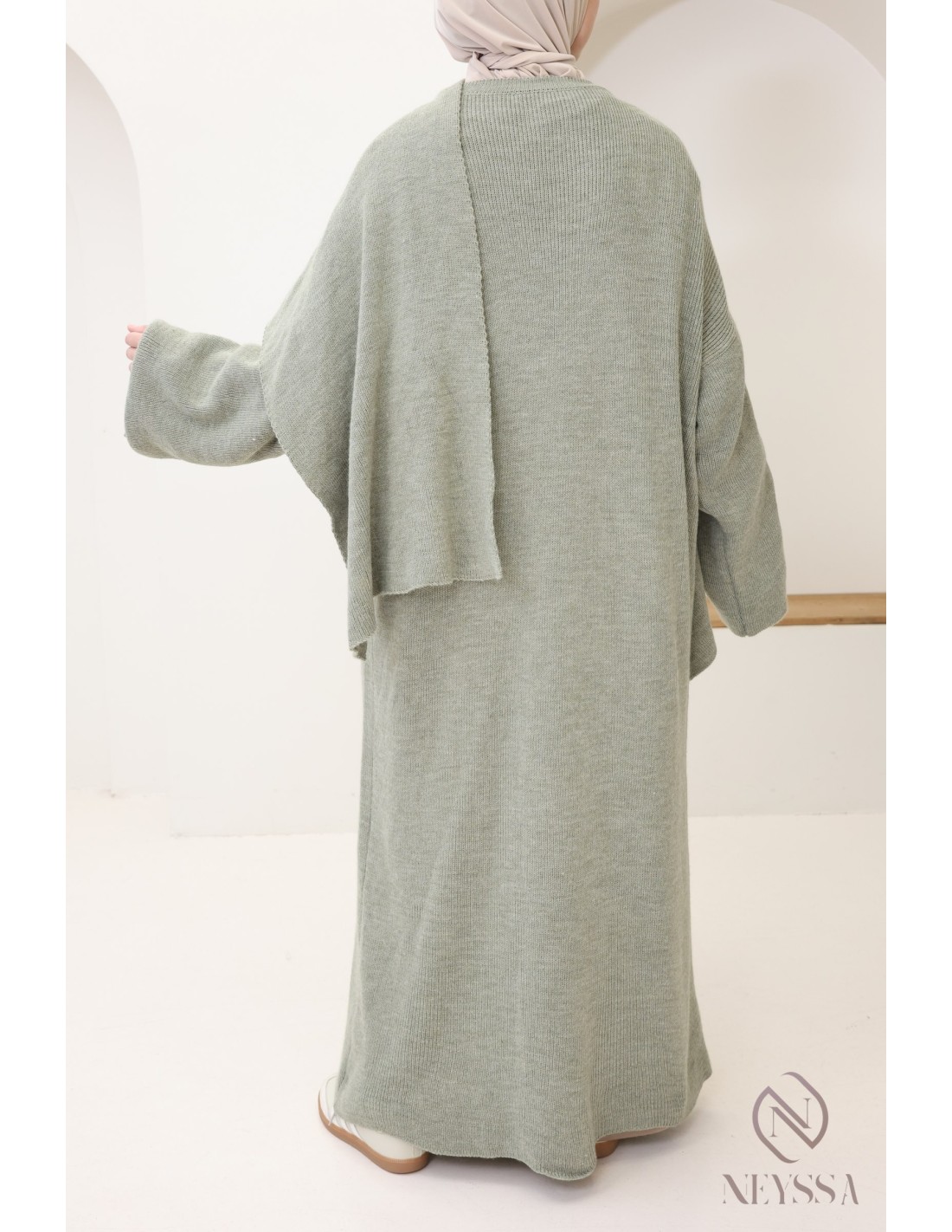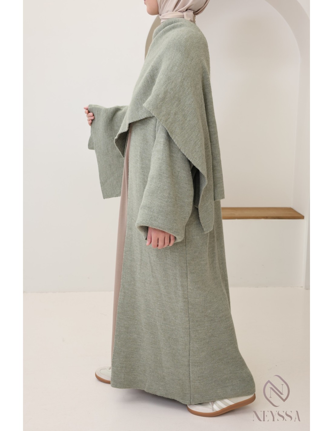 Here is a stunning long knitted cardigan that is both simple and modern. It is an essential piece for staying elegant and comfortable throughout the cold season. This integrated cape cardigan is designed to meet your needs for warmth, style and modesty, and is ideal for women who wear hijabs.