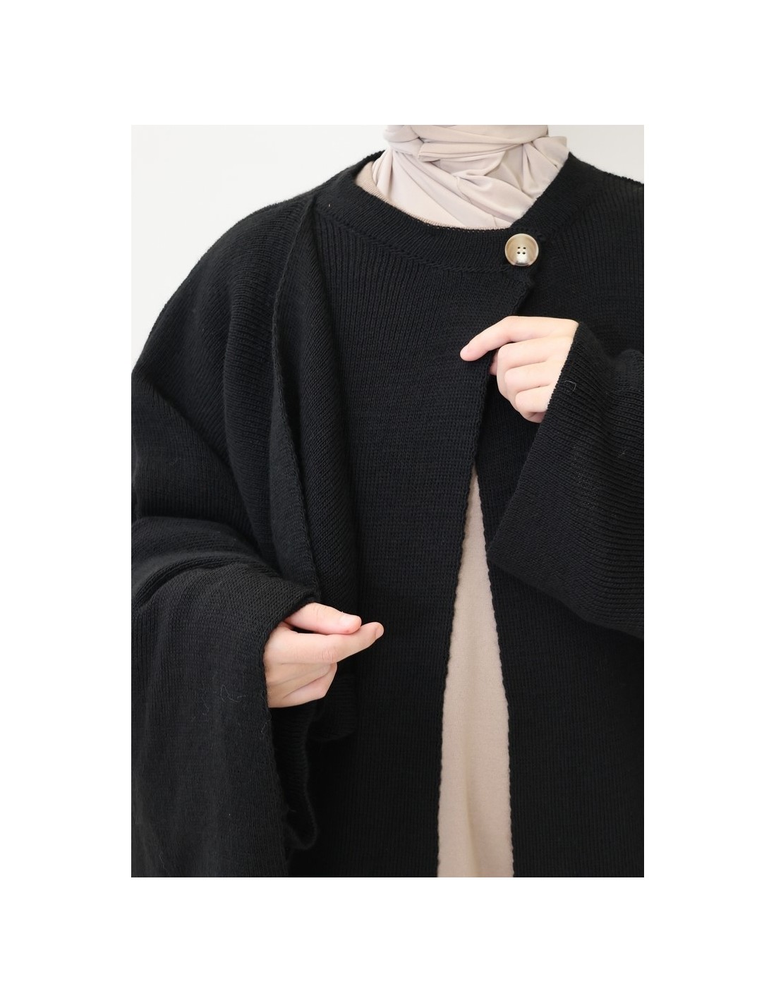 Here is a stunning long knitted cardigan that is both simple and modern. It is an essential piece for staying elegant and comfortable throughout the cold season. This integrated cape cardigan is designed to meet your needs for warmth, style and modesty, and is ideal for women who wear hijabs.