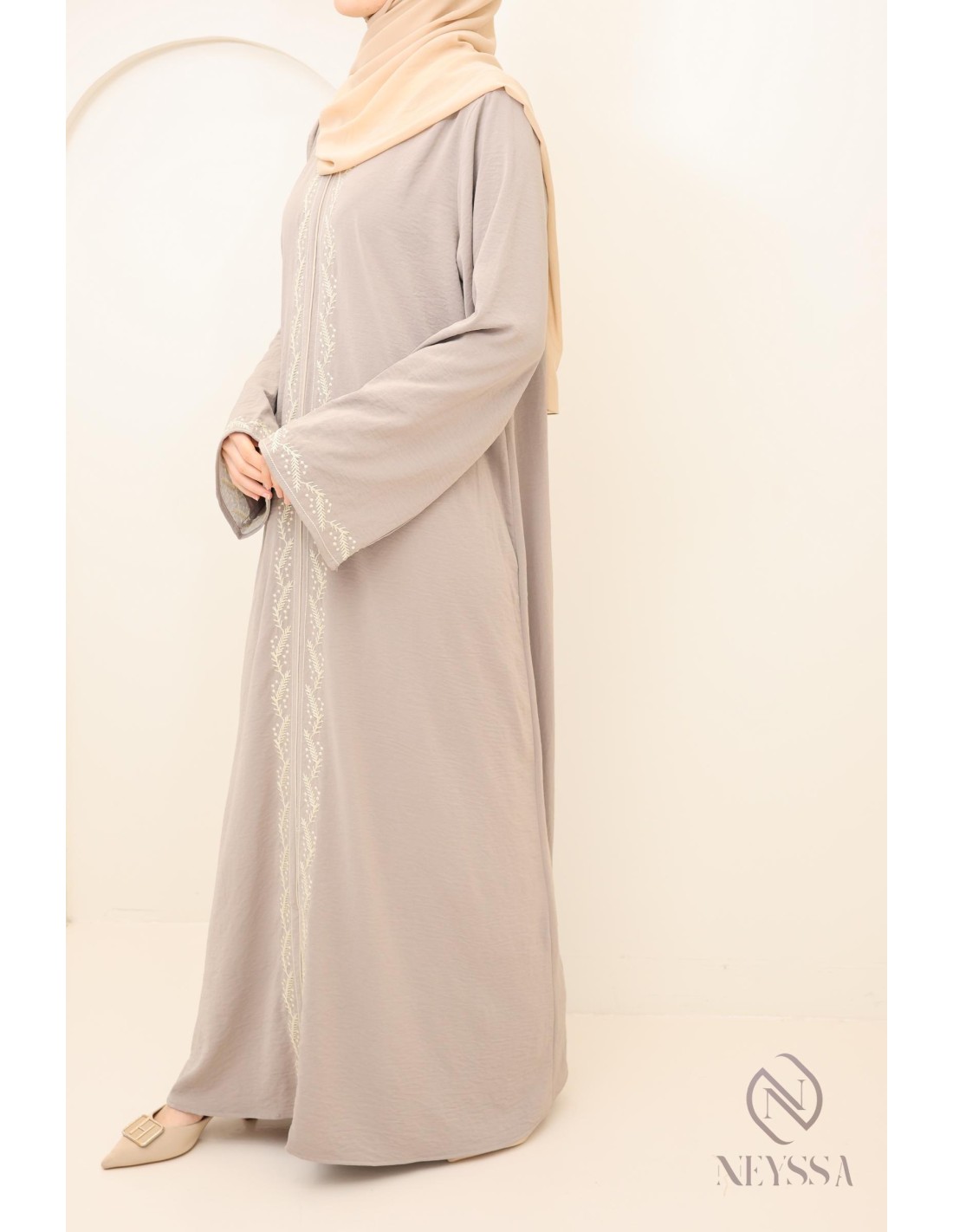 lange taupefarbene Damenabaya mit moderner Stickerei, modest fashion