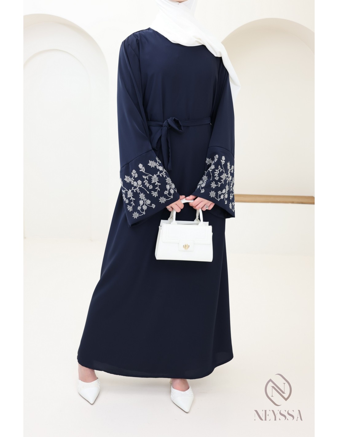 Hier ist diese wunderschöne lange Abaya für verschleierte Frauen mit einem bescheidenen Schnitt. Wir lieben ihre Schlichtheit und ihre Raffinesse mit den Strassdetails.