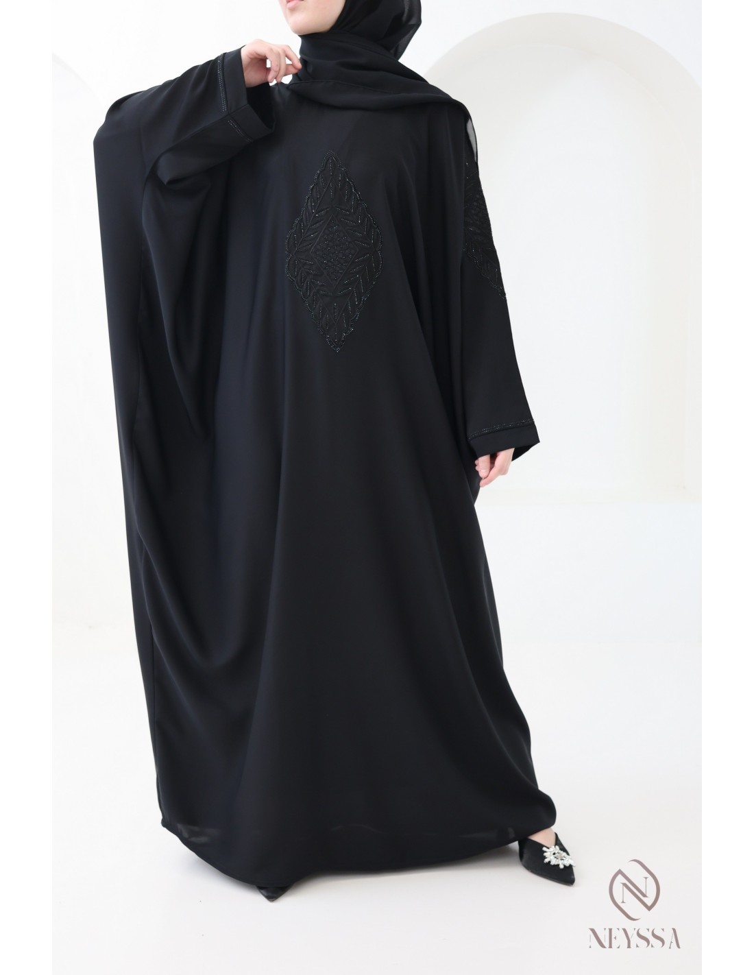 Diese Abaya ist aus Nidah-Seide gefertigt, mit Stickereien und Strasssteinen verziert und mit einem passenden Schleier versehen.