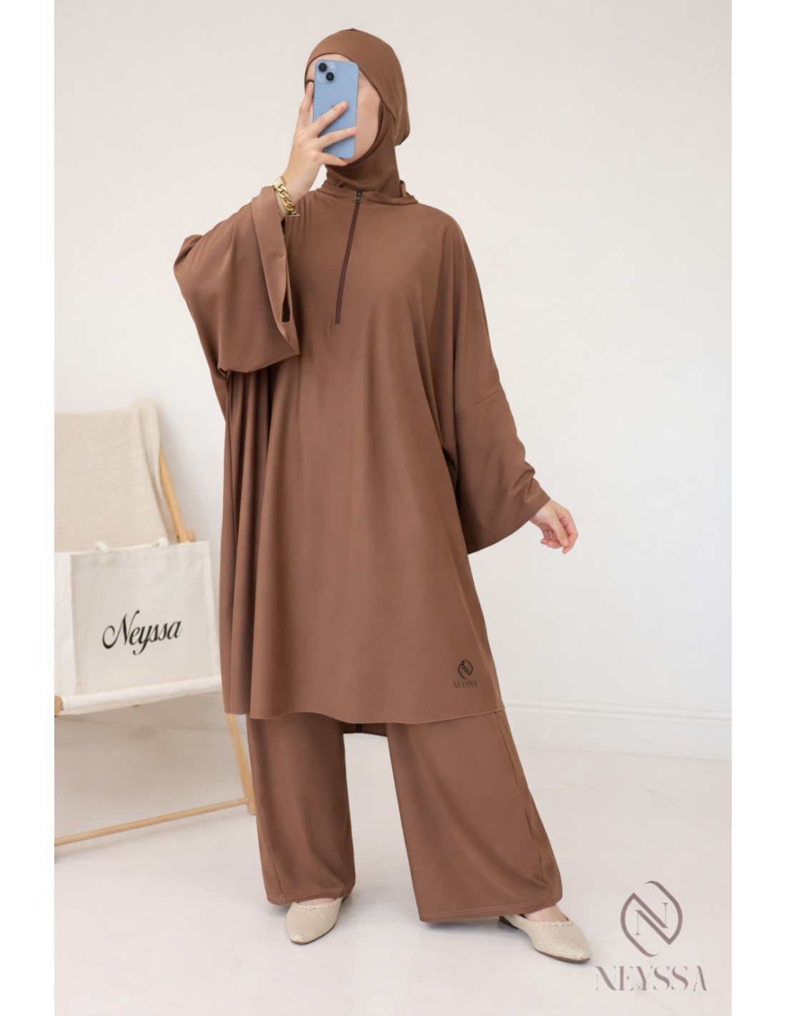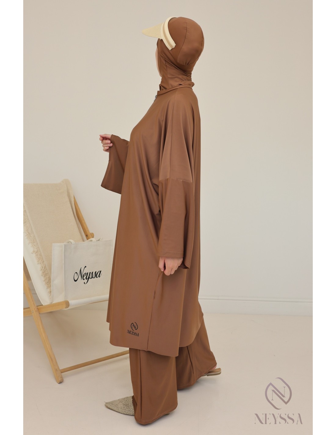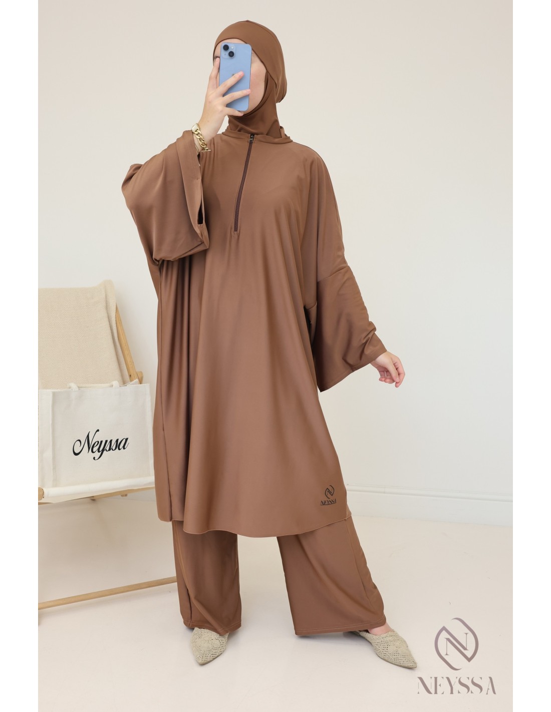 3-teiliger Burkini Noisette mit integrierter Kapuze