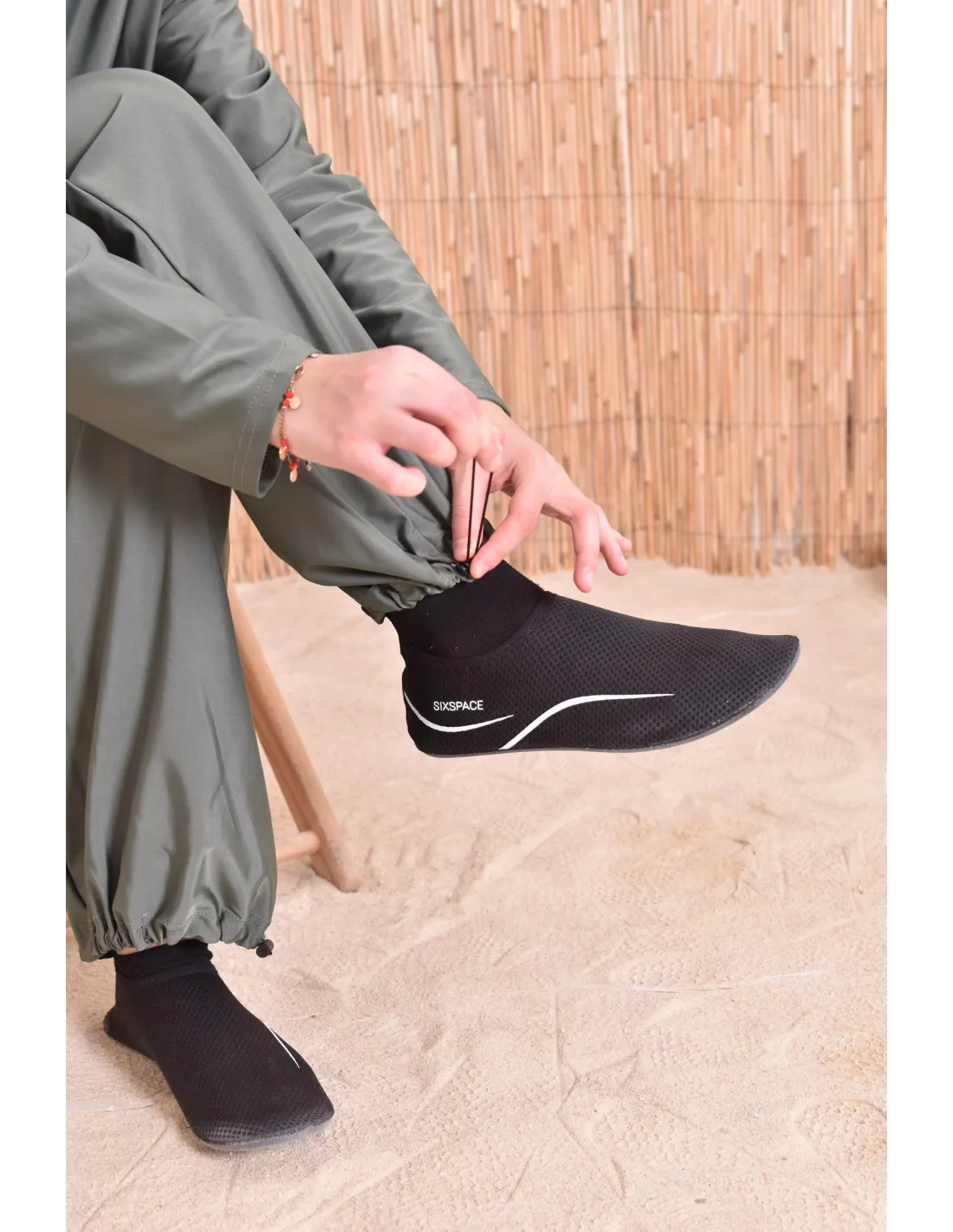 - Hose zum Anpassen: Die Hose hat Kordeln am Becken, um sie nach Ihren Wünschen zu straffen. Es gibt auch Gummibänder, die an den Knöcheln angezogen werden, um die Passform zu erleichtern.