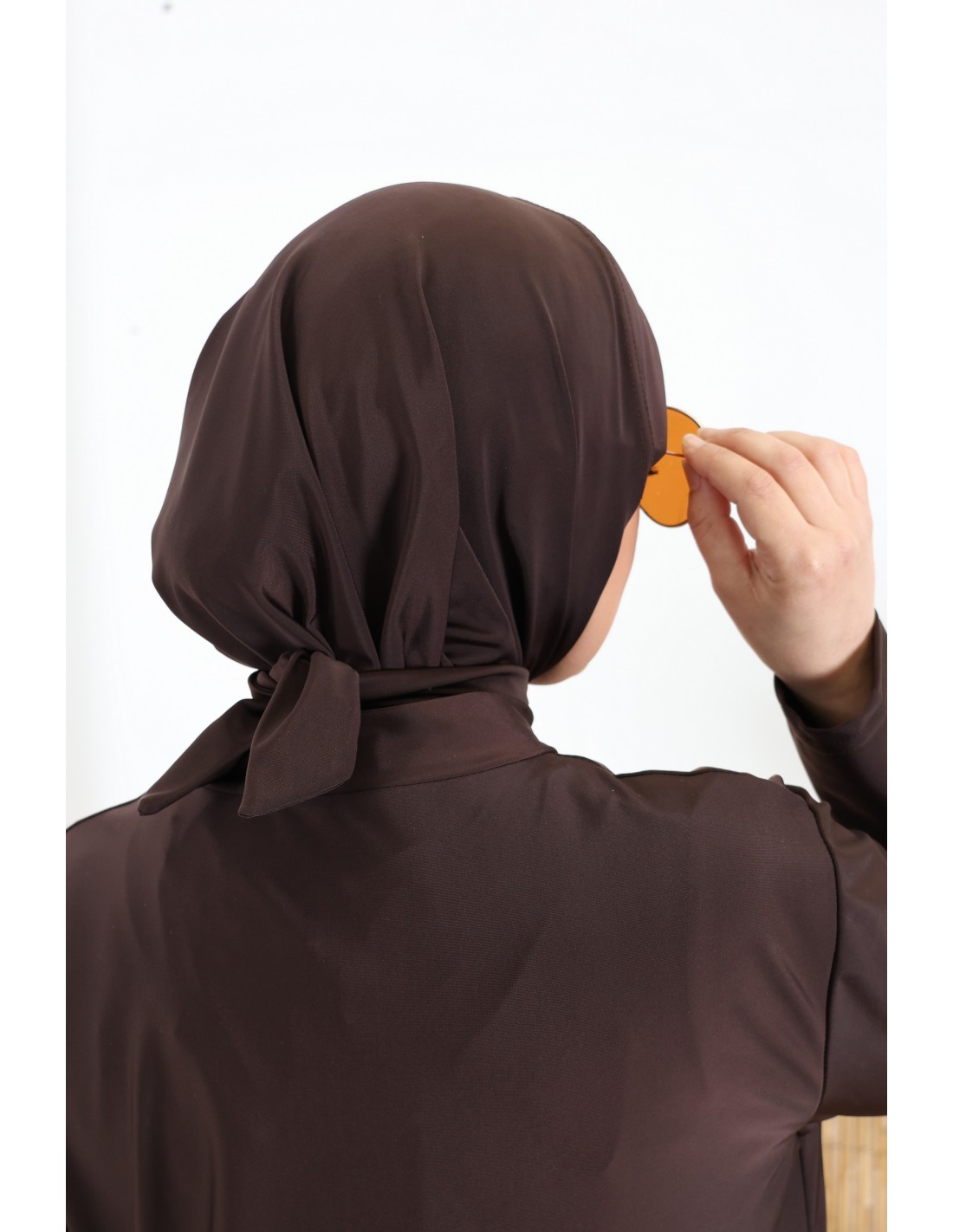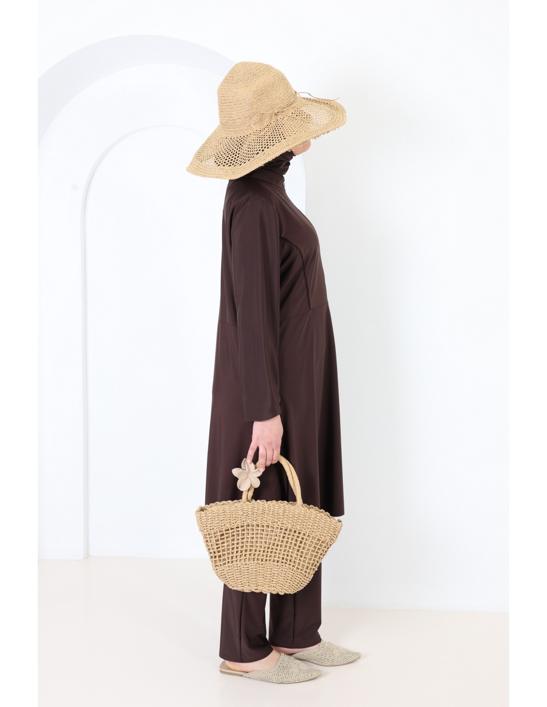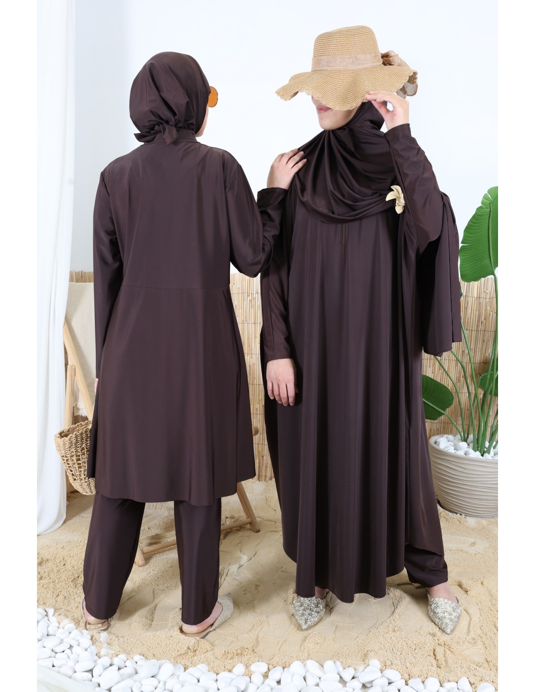 3-teiliger Burkini in Schokoladenbraun: langes Oberteil + Hose + Badekappe