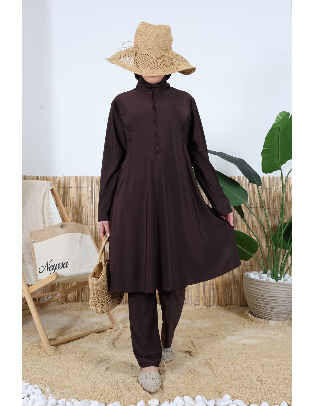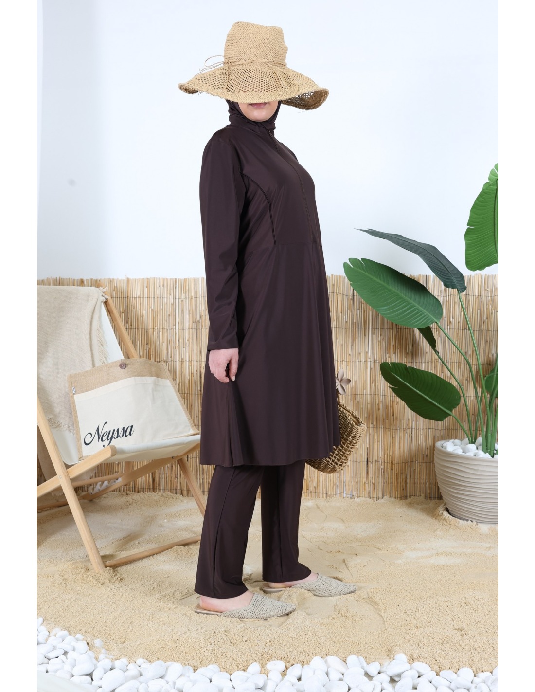 3-teiliger Burkini mit Reißverschluss-Tunika in Schokoladenbraun