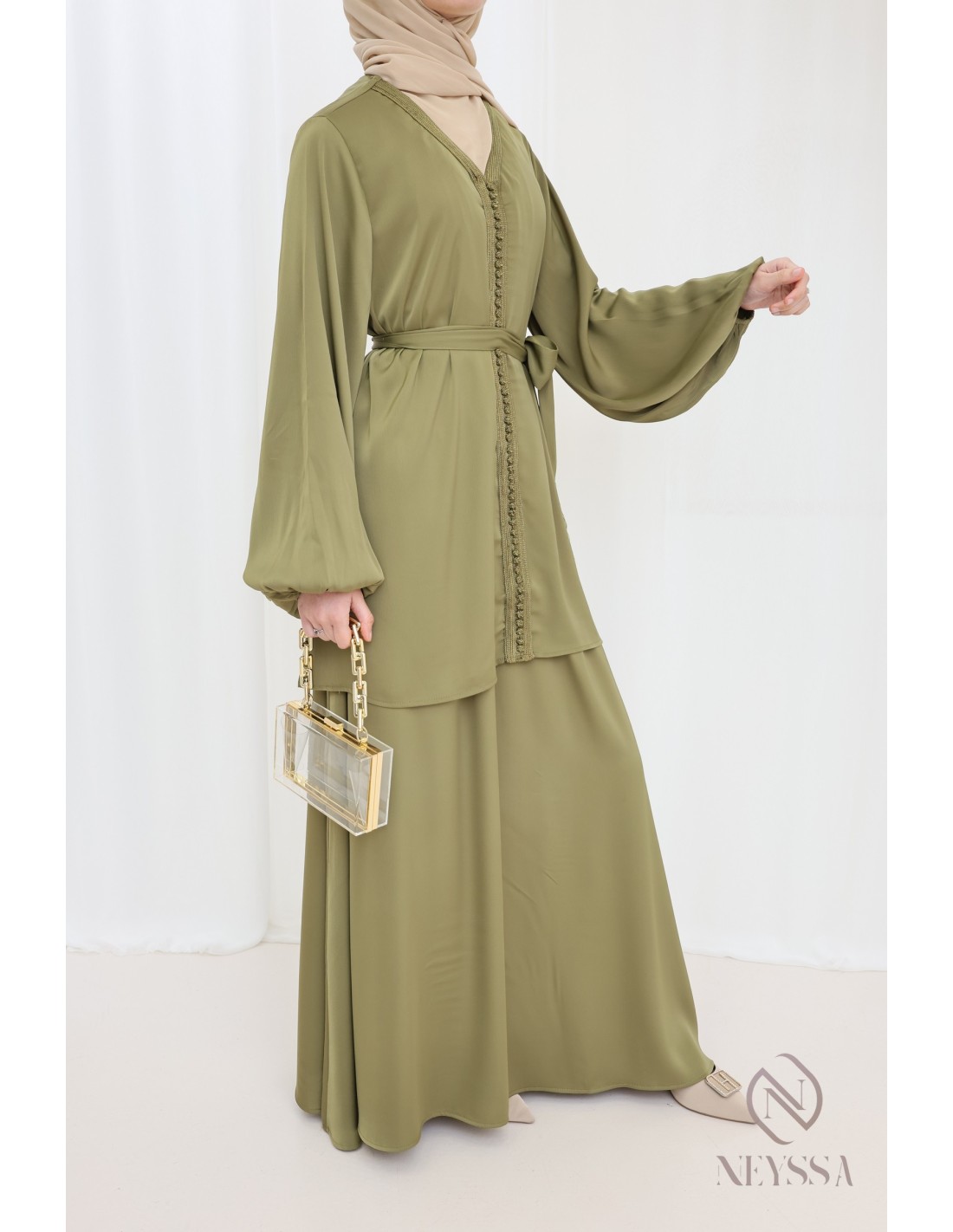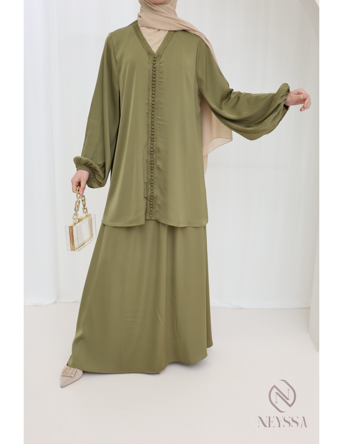 Sie suchen nach einem schlichten und zugleich eleganten Outfit für Eid? Wir bieten Ihnen dieses zweiteilige Nugget im trendigen marokkanischen Kaftanstil, das Ihnen zweifellos gefallen wird!